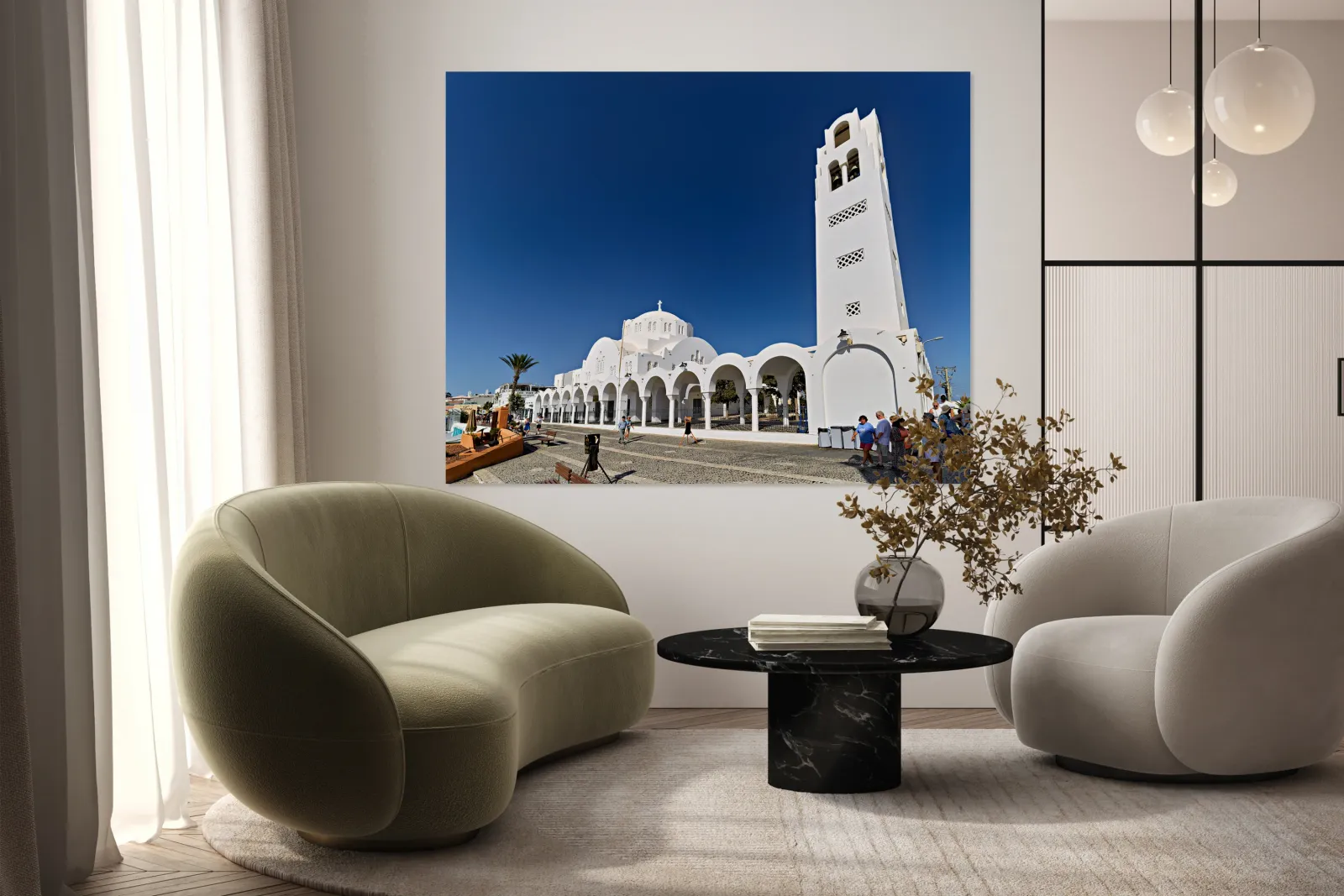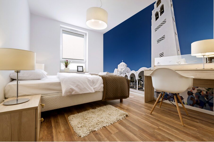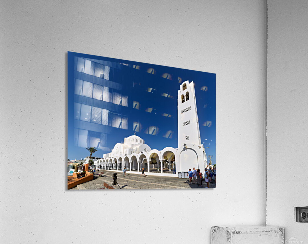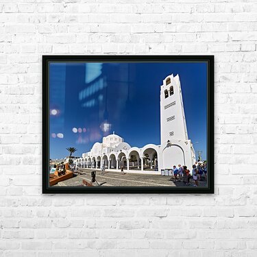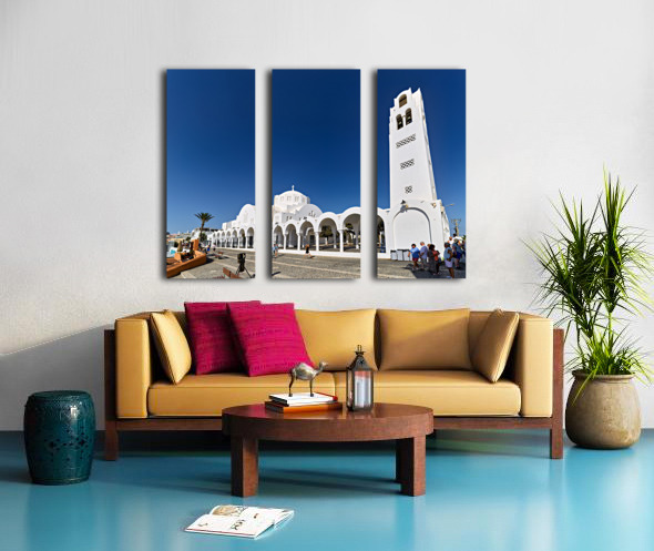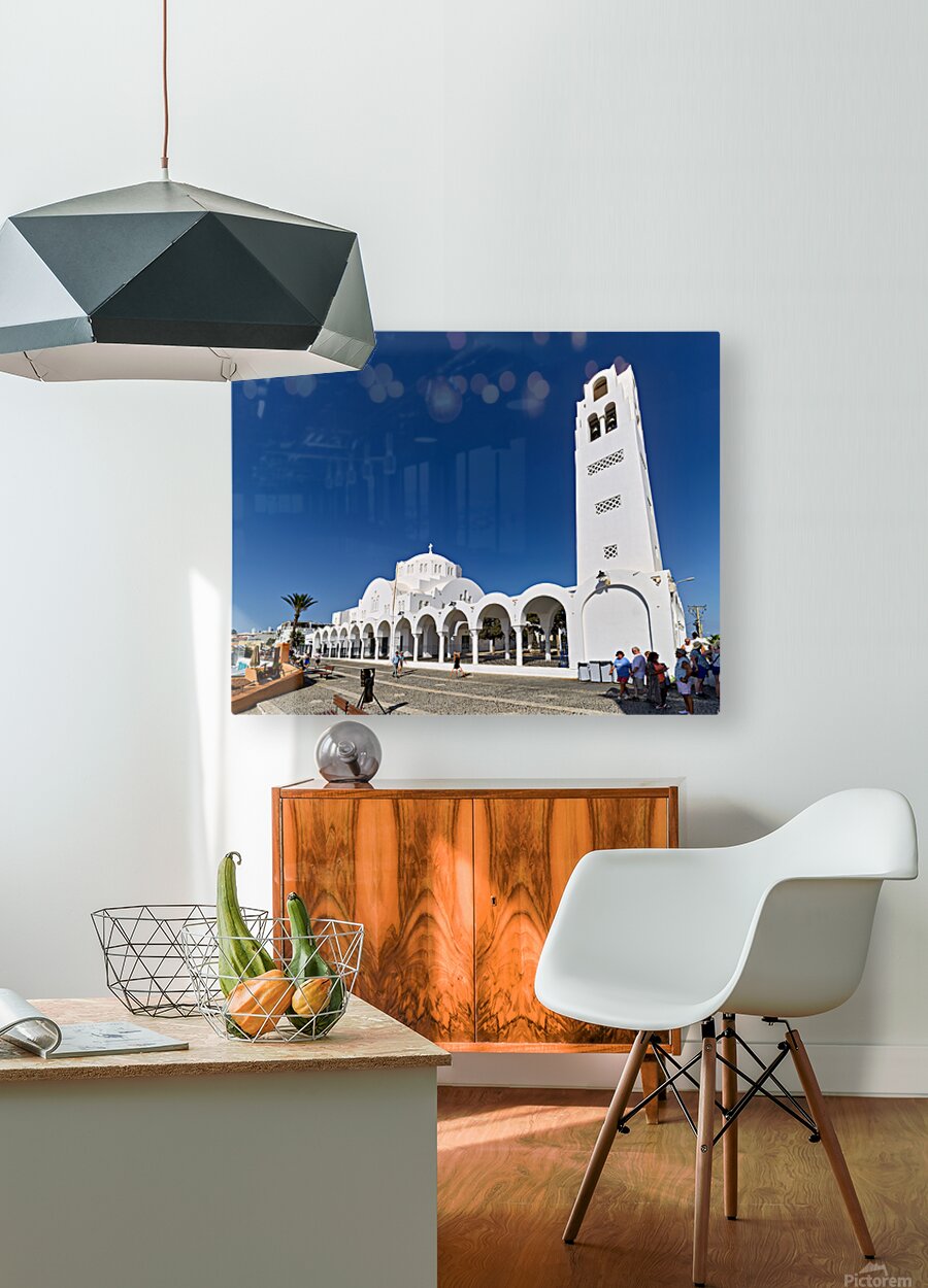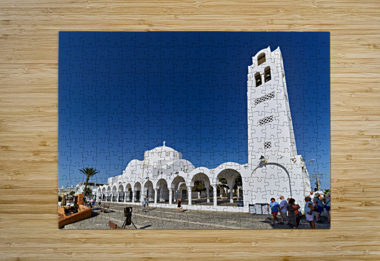 Tourists explore the beautiful white Orthodox Metropolitan Cathedral in Fira Santorini Greece enjoying the sunny day and iconic architecture.