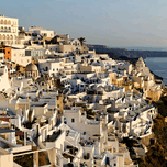 SANTORINIS WHITE BUILDINGS CASCADE DOWN CLIFF TO THE SEA.