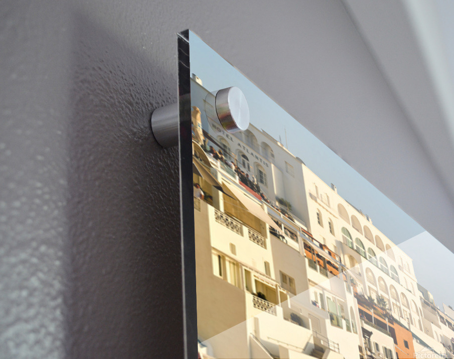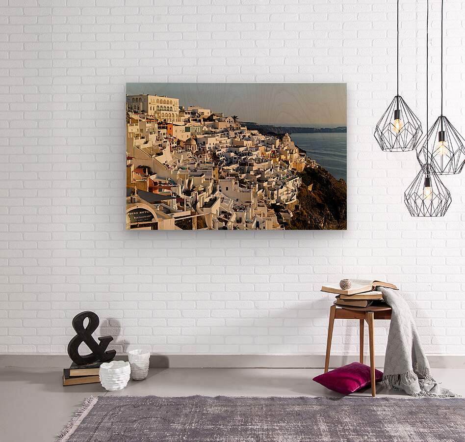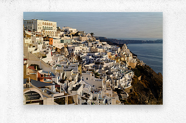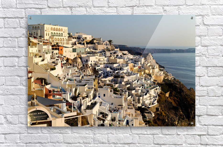 ABOUT THIS ARTWORK: SANTORINIS WHITE BUILDINGS CASCADE DOWN CLIFF TO THE SEA.