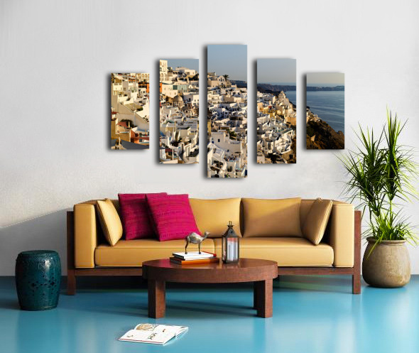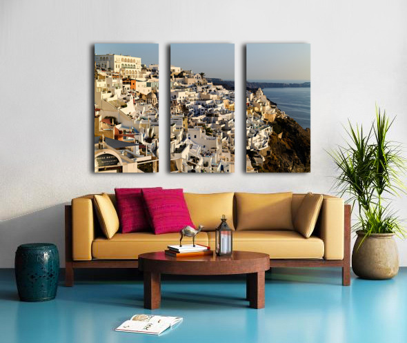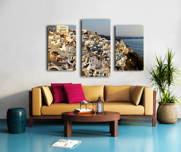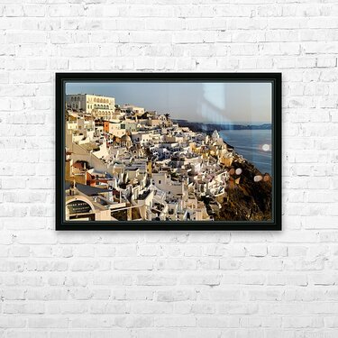 Santorinis white buildings cascade down cliff to the sea. Frame print