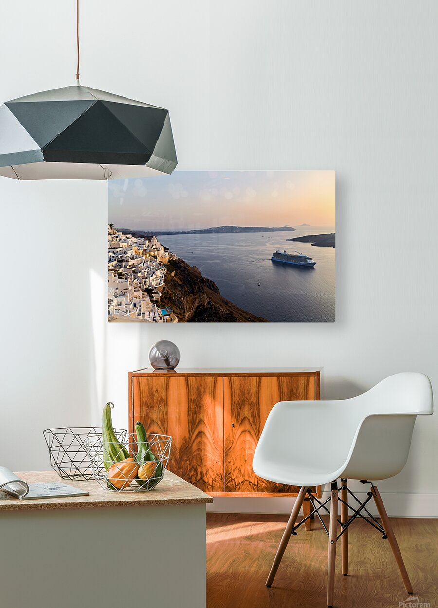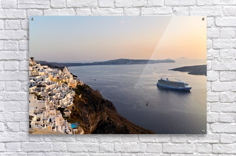 Get this artwork "Santorini village and cruise ship at sunset." in a framed print.
