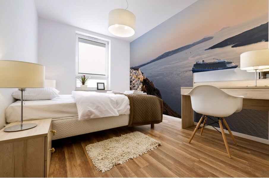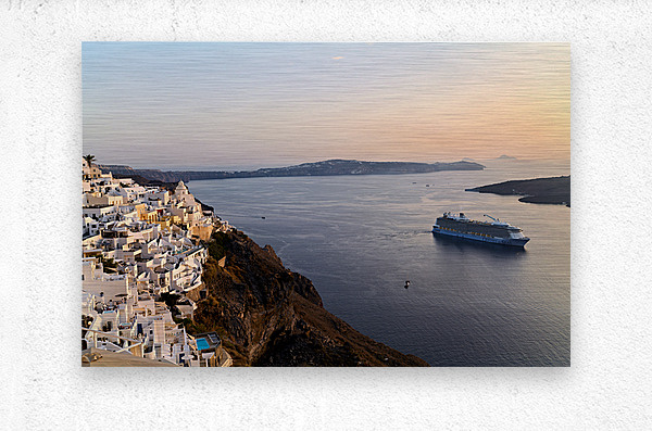 ABOUT THIS ARTWORK: SANTORINI VILLAGE AND CRUISE SHIP AT SUNSET.