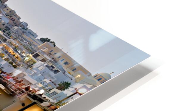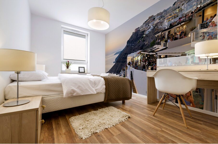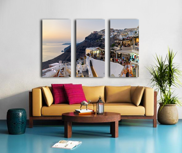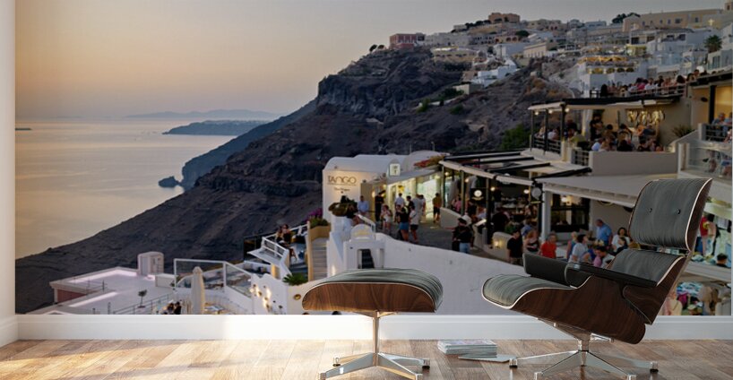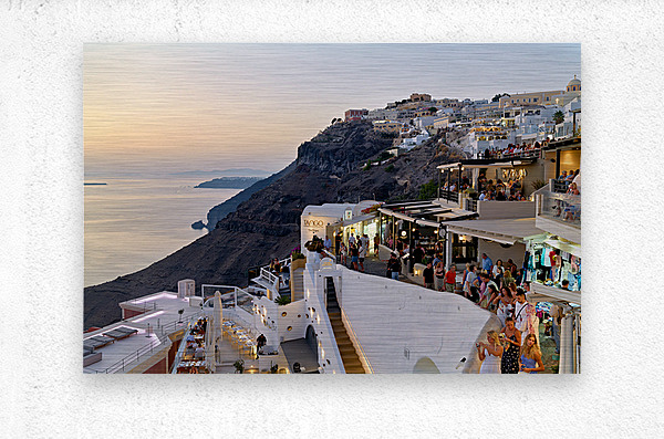 ABOUT THIS ARTWORK: SANTORINI CLIFFSIDE TOWN WITH RESTAURANTS AND PEOPLE ENJOYING TH