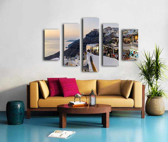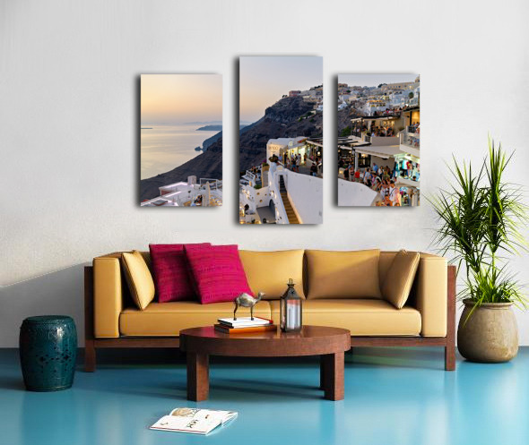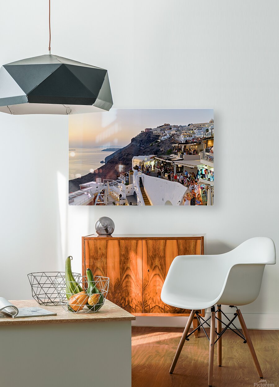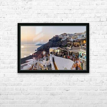 Santorini cliffside town with restaurants and people enjoying th Frame print