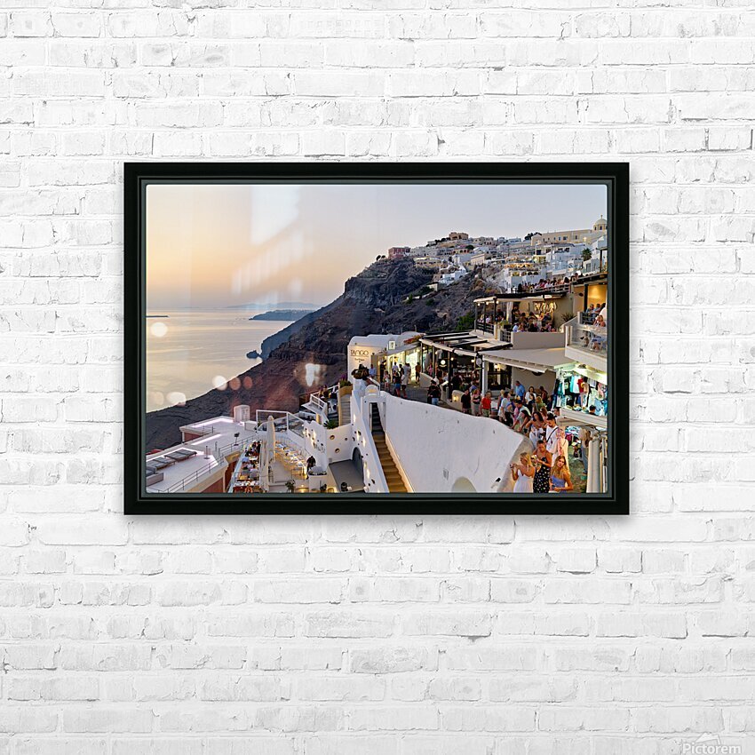 Santorini cliffside town with restaurants and people enjoying th Picture Frame Printing