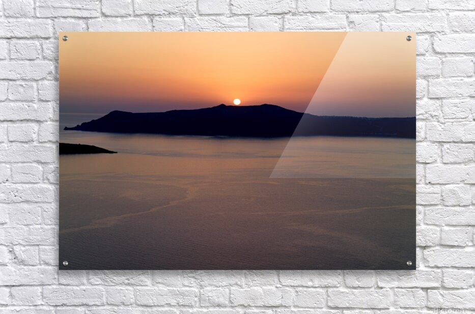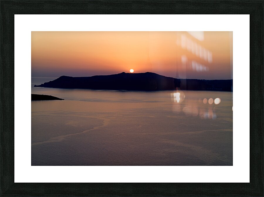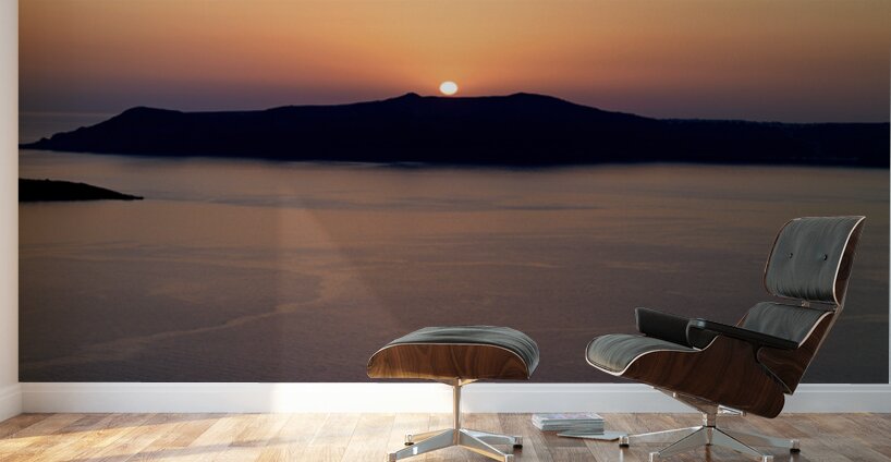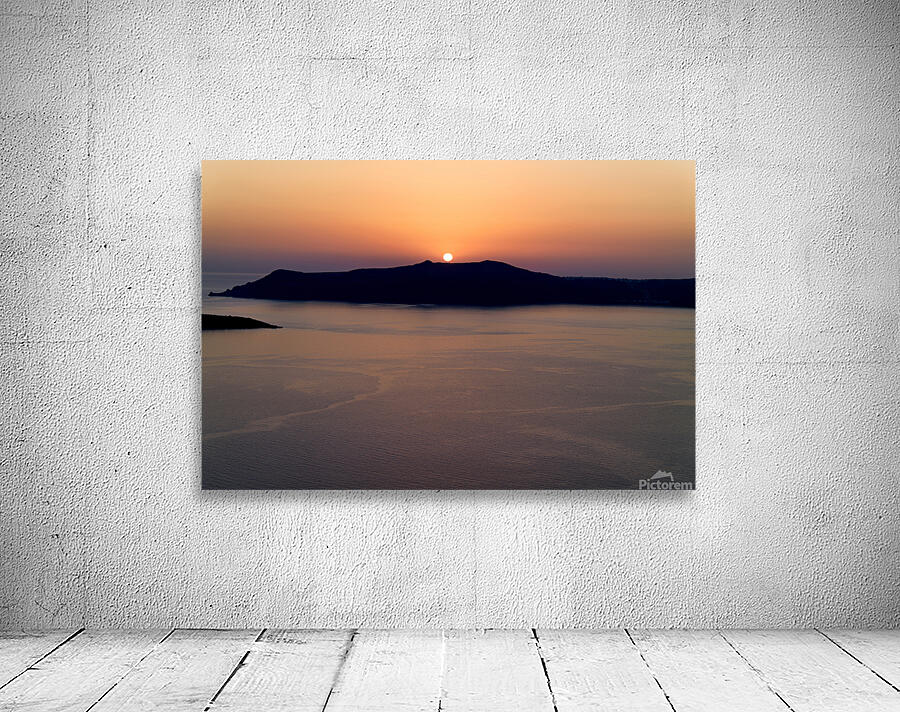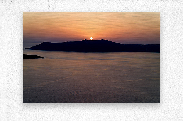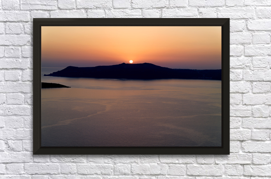 A breathtaking sunset over the Aegean Sea with the sun dipping behind the caldera island creating a stunning silhouette in Santorini Greece.