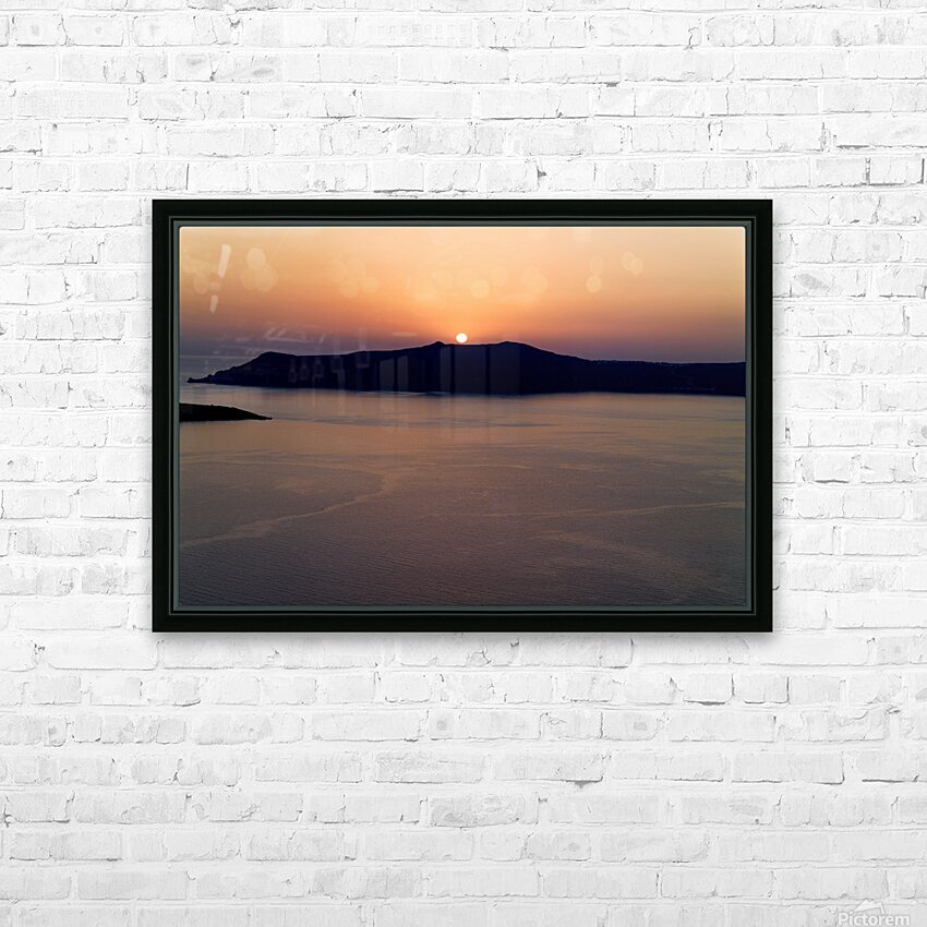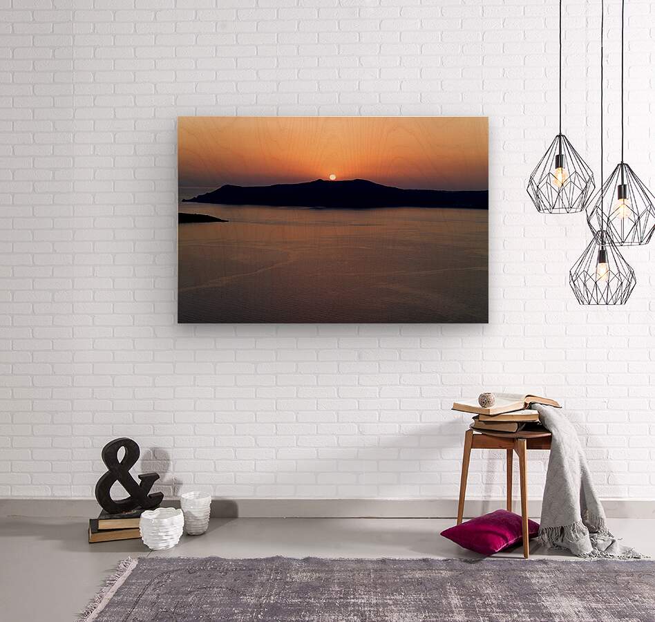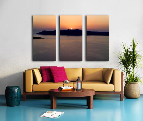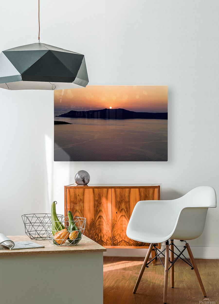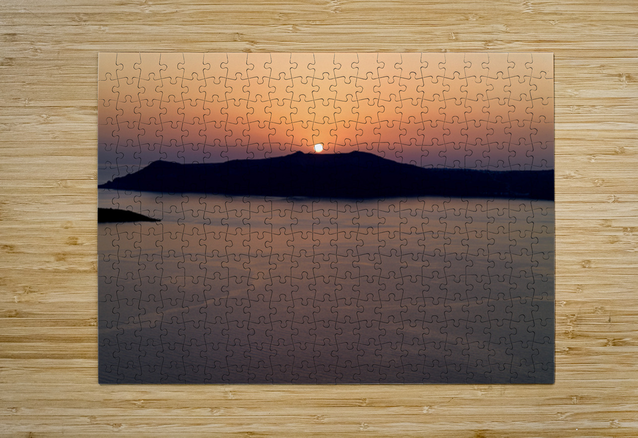 A breathtaking sunset over the Aegean Sea with the sun dipping behind the caldera island creating a stunning silhouette in Santorini Greece.