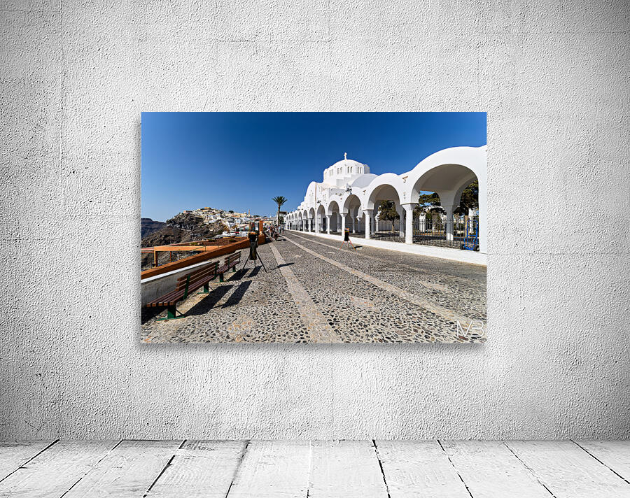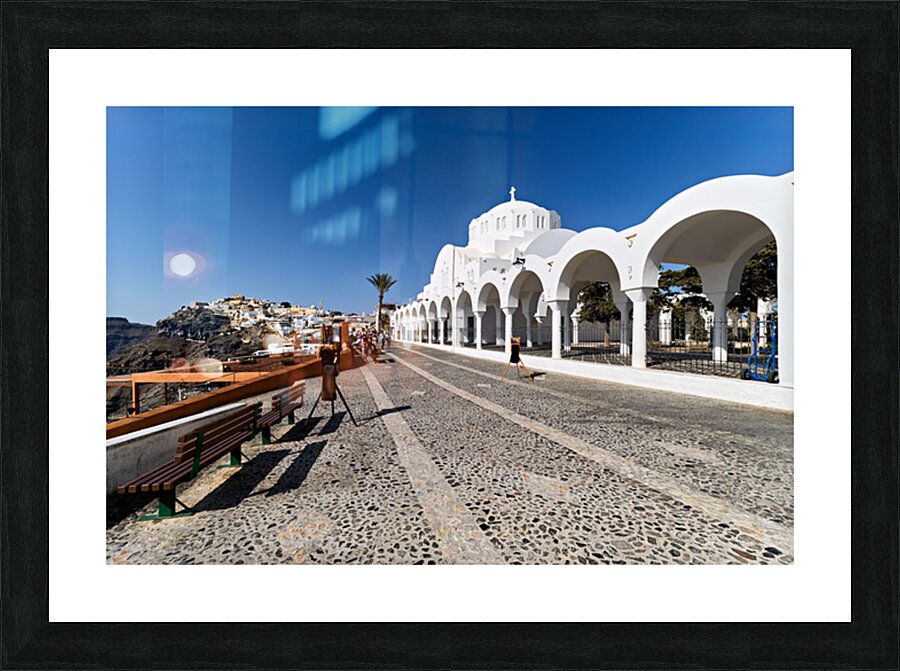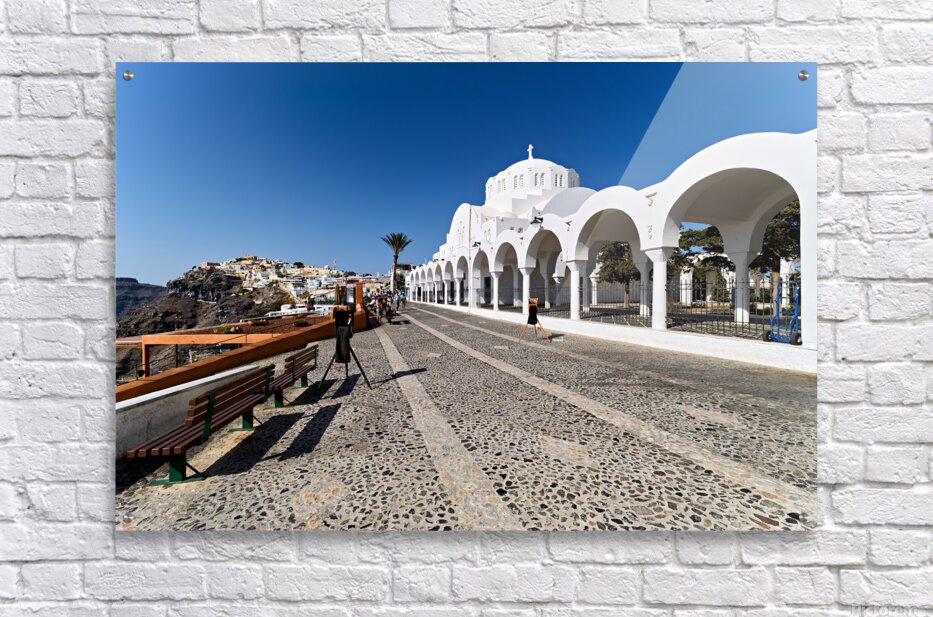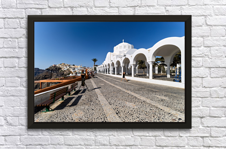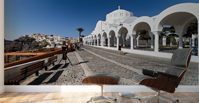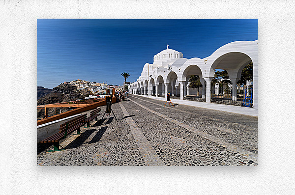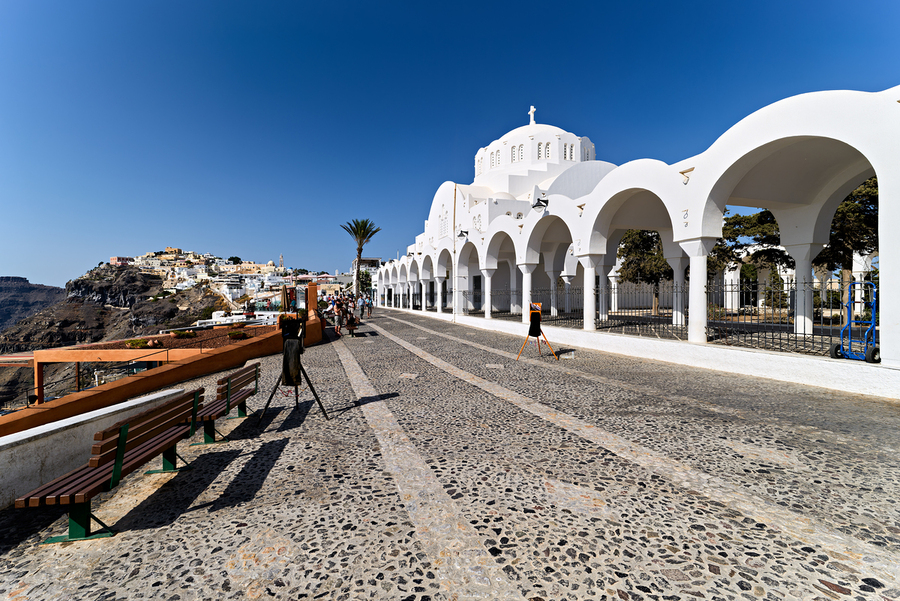 Tourists and an artist enjoy the stunning views and iconic white architecture of the Metropolitan Cathedral in Fira Santorini Greece.