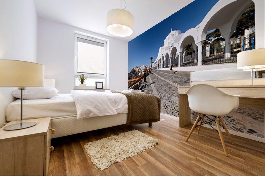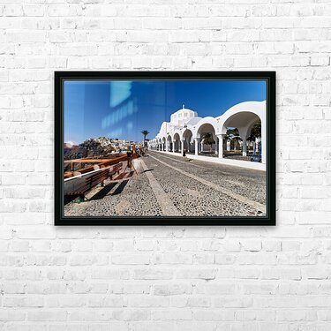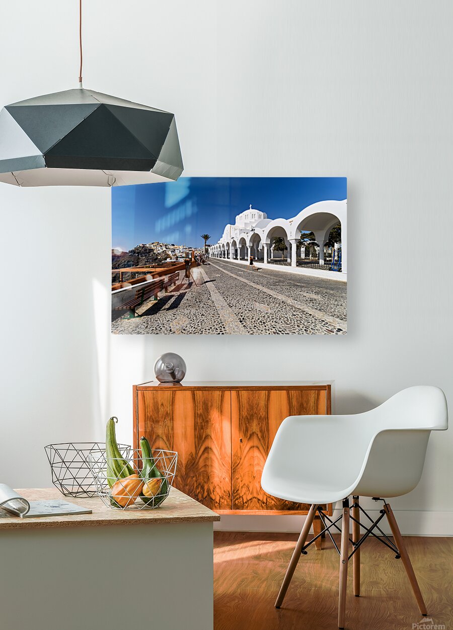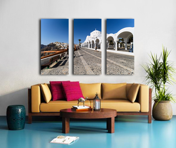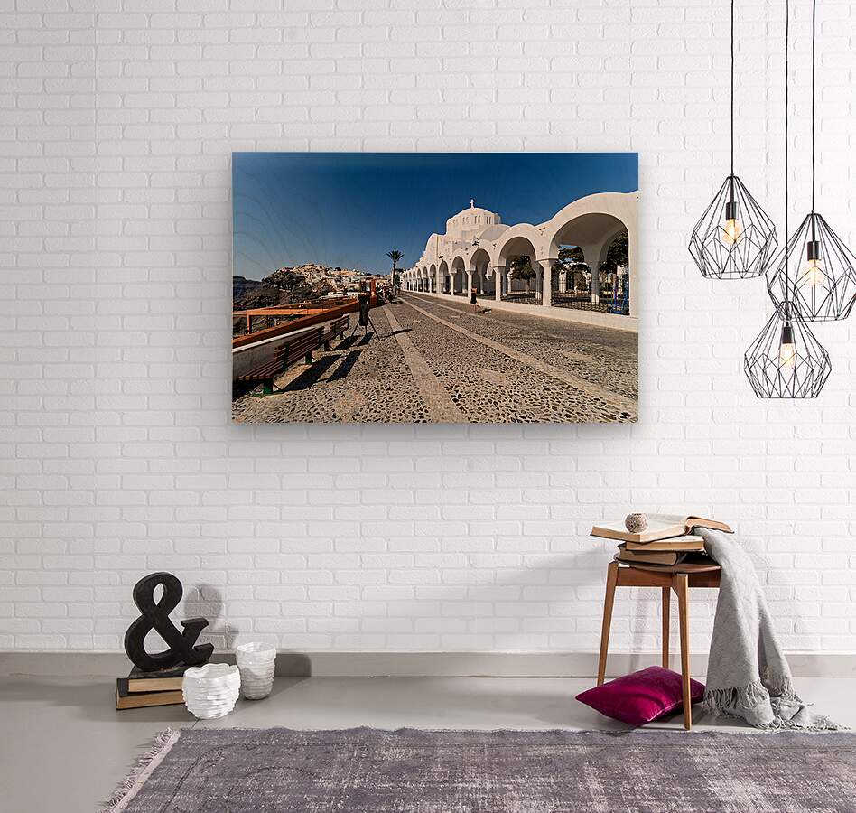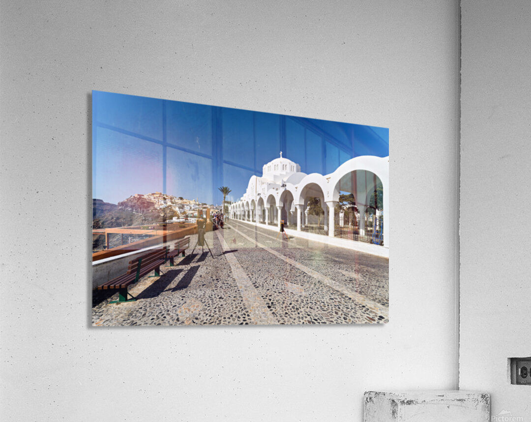 Tourists and an artist enjoy the stunning views and iconic white architecture of the Metropolitan Cathedral in Fira Santorini Greece.