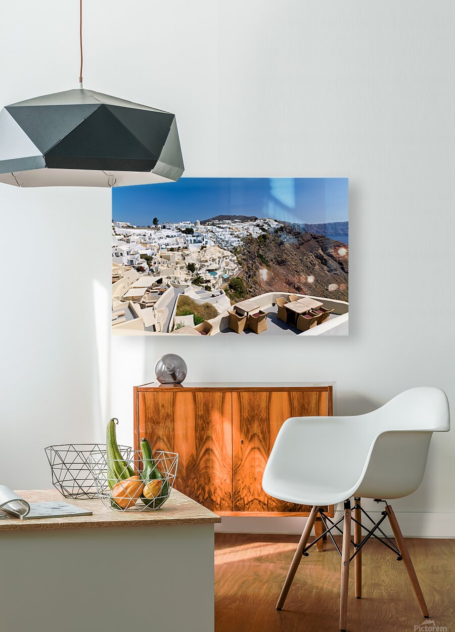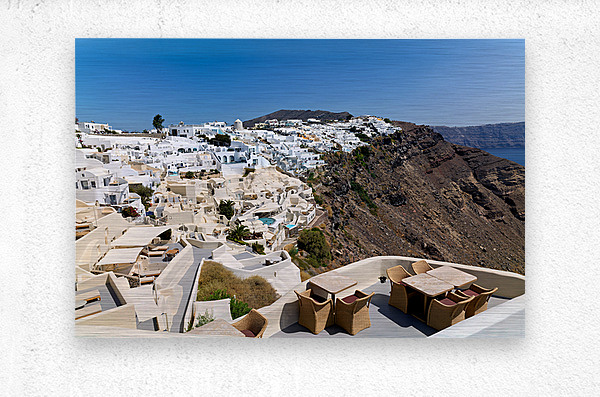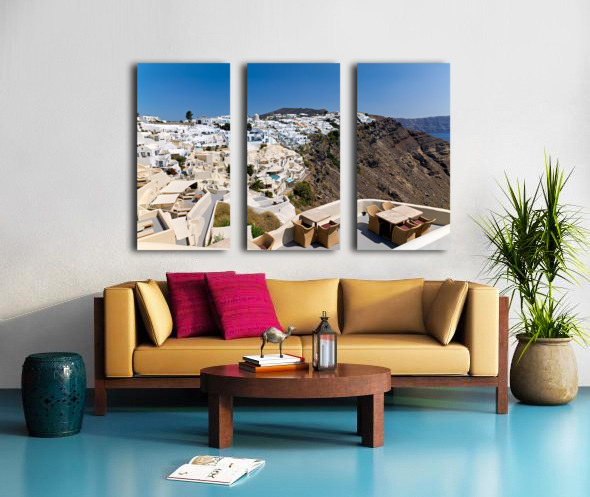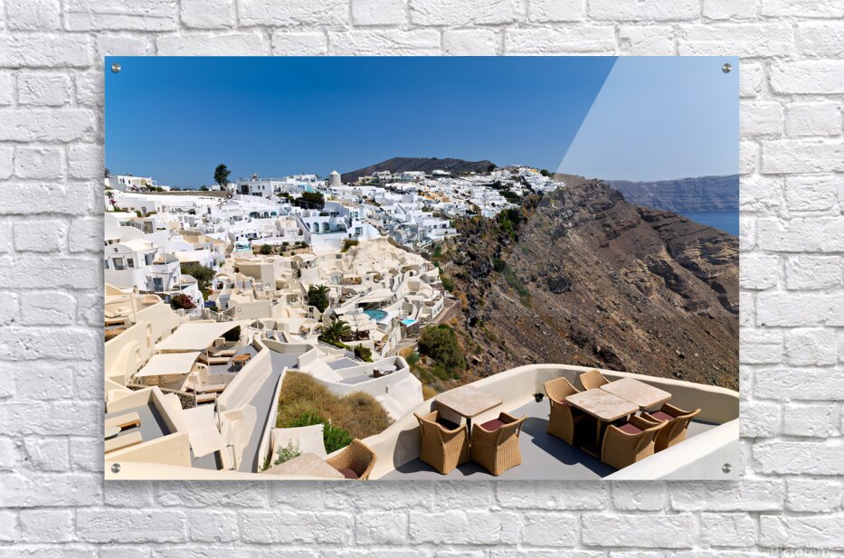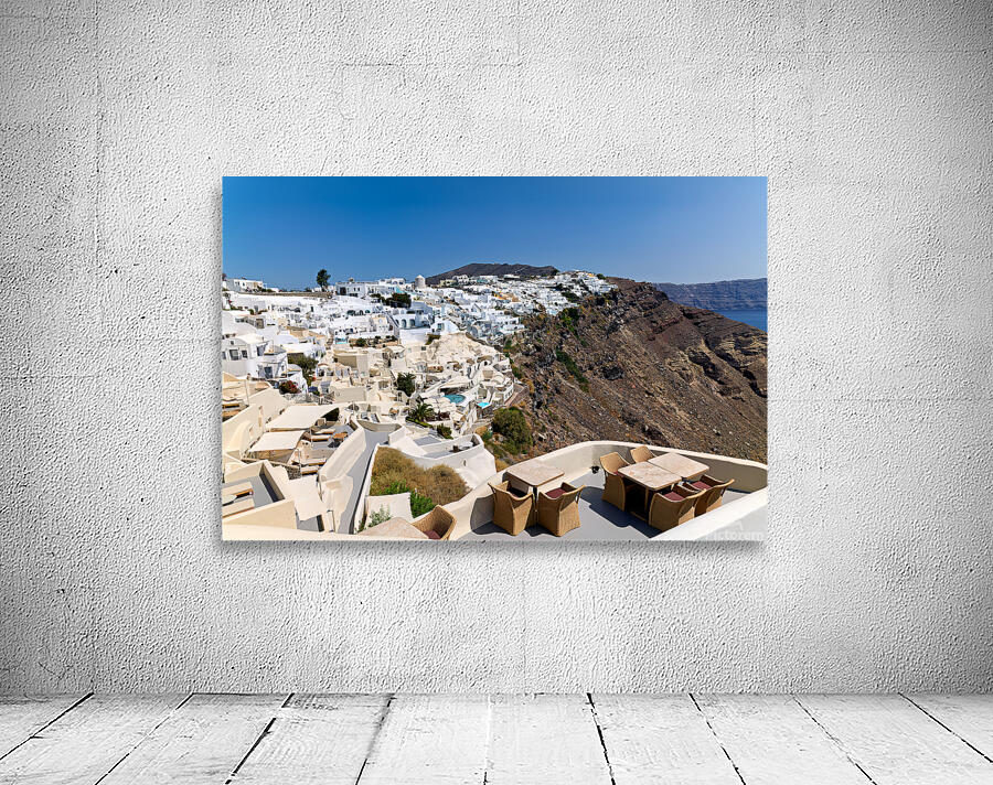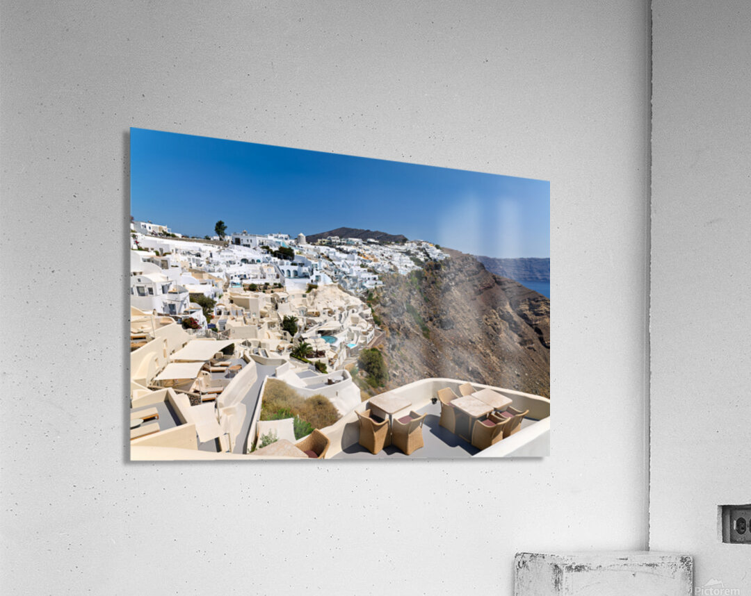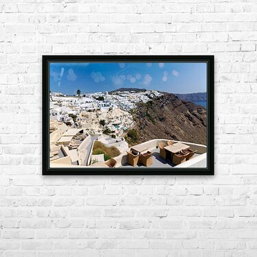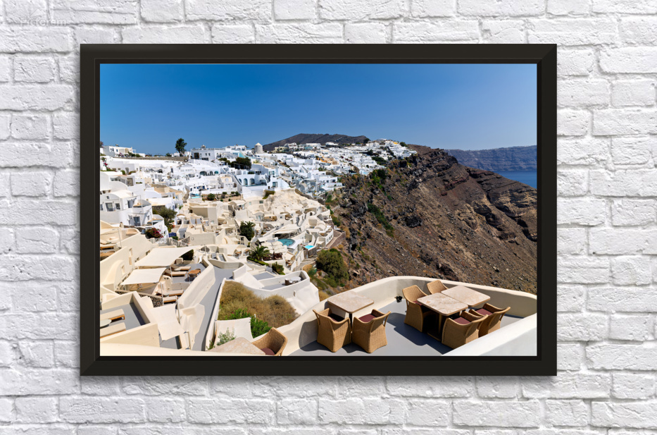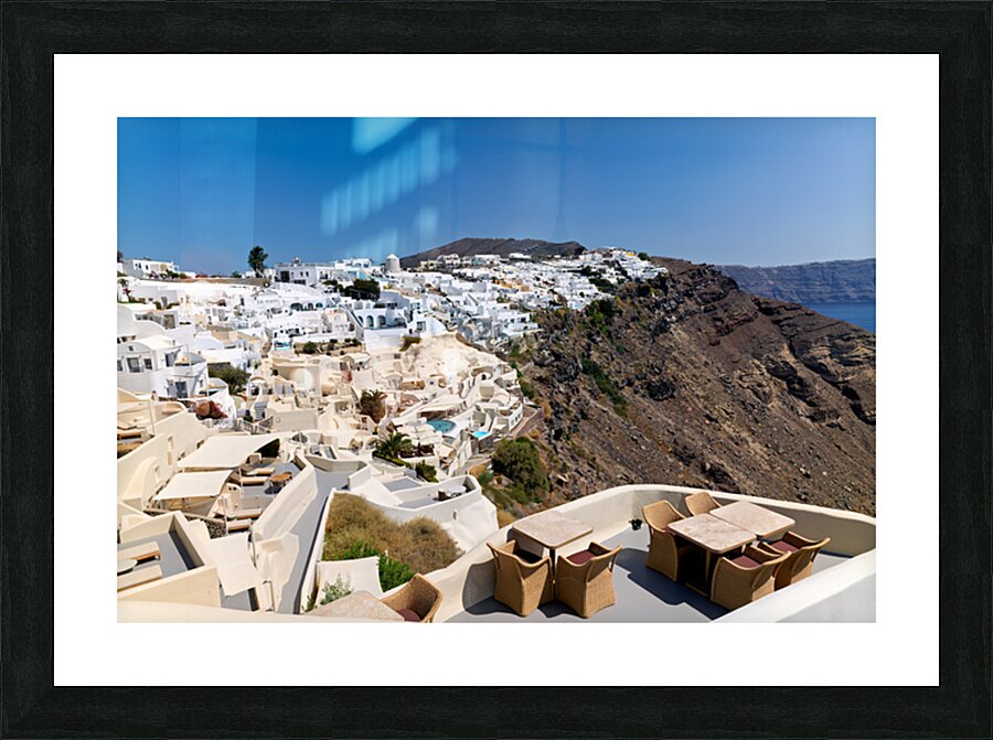 "Santorinis iconic white village on a cliff overlooking the cald" in a framed print.
