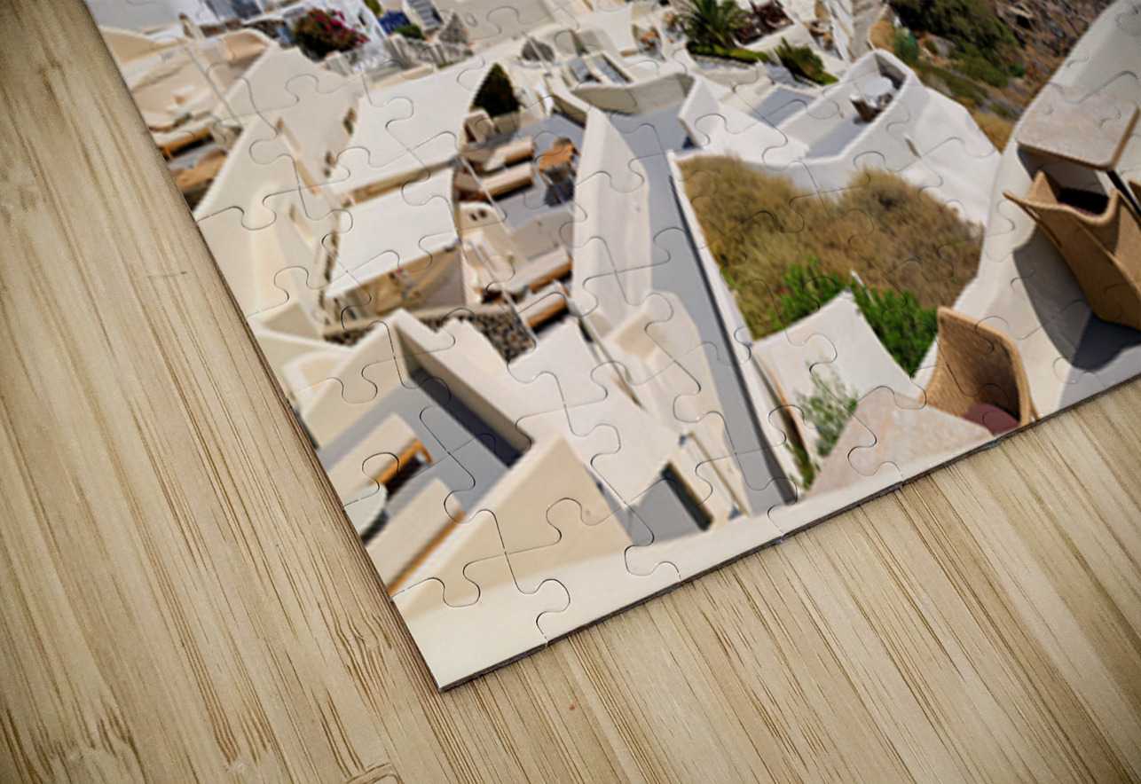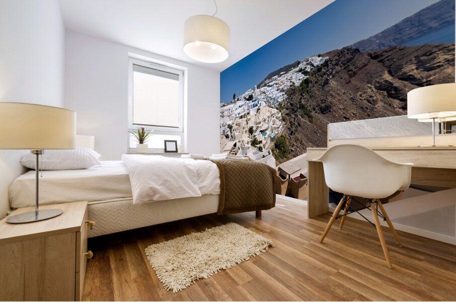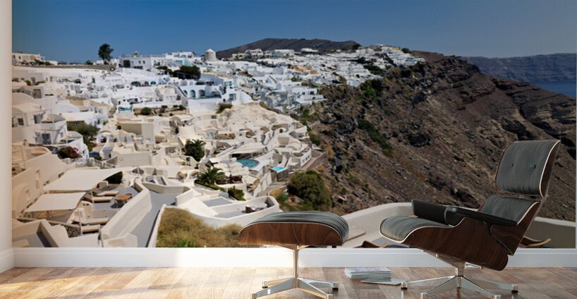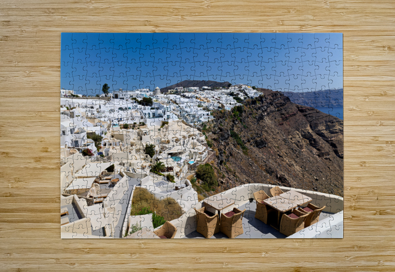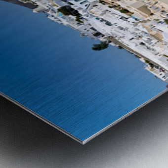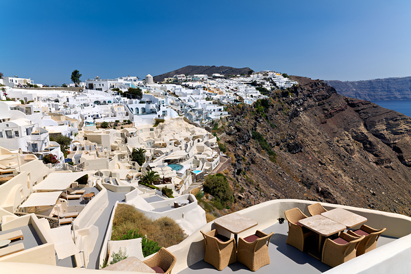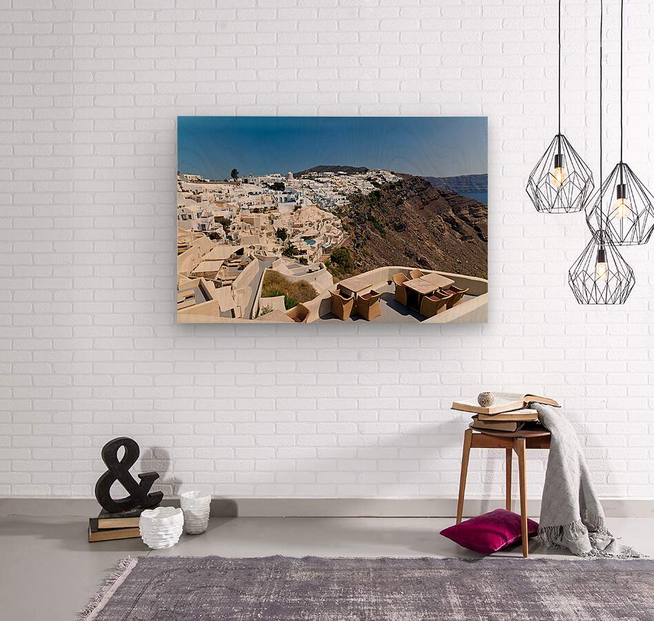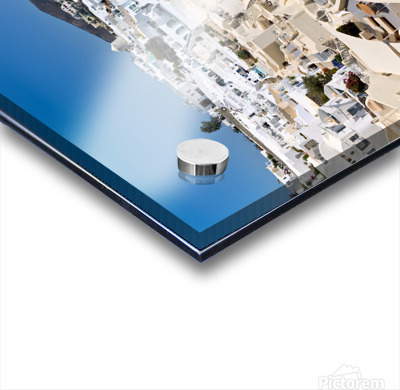 "Santorinis iconic white village on a cliff overlooking the cald" in a framed print.