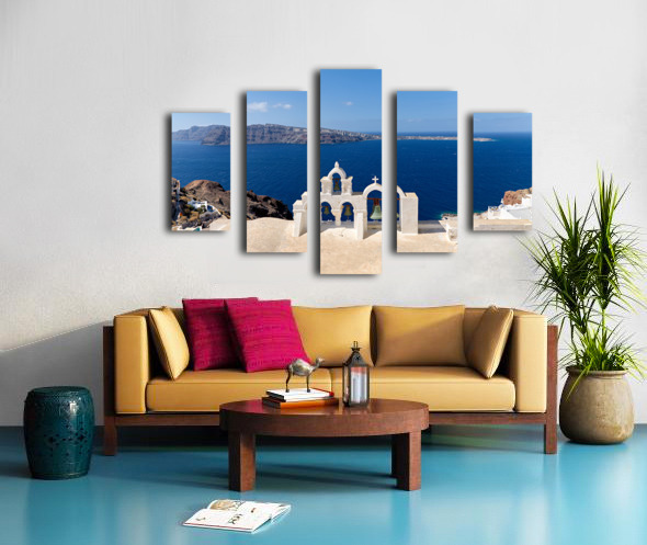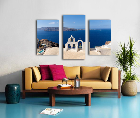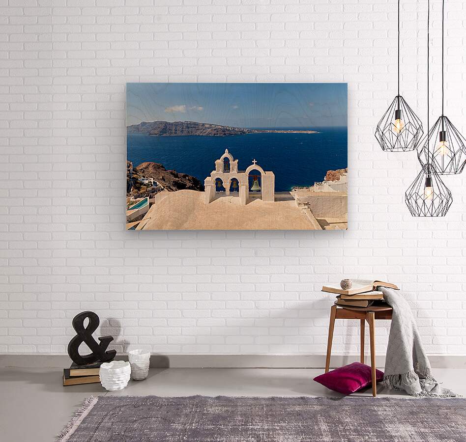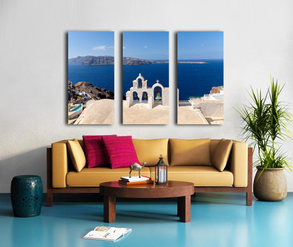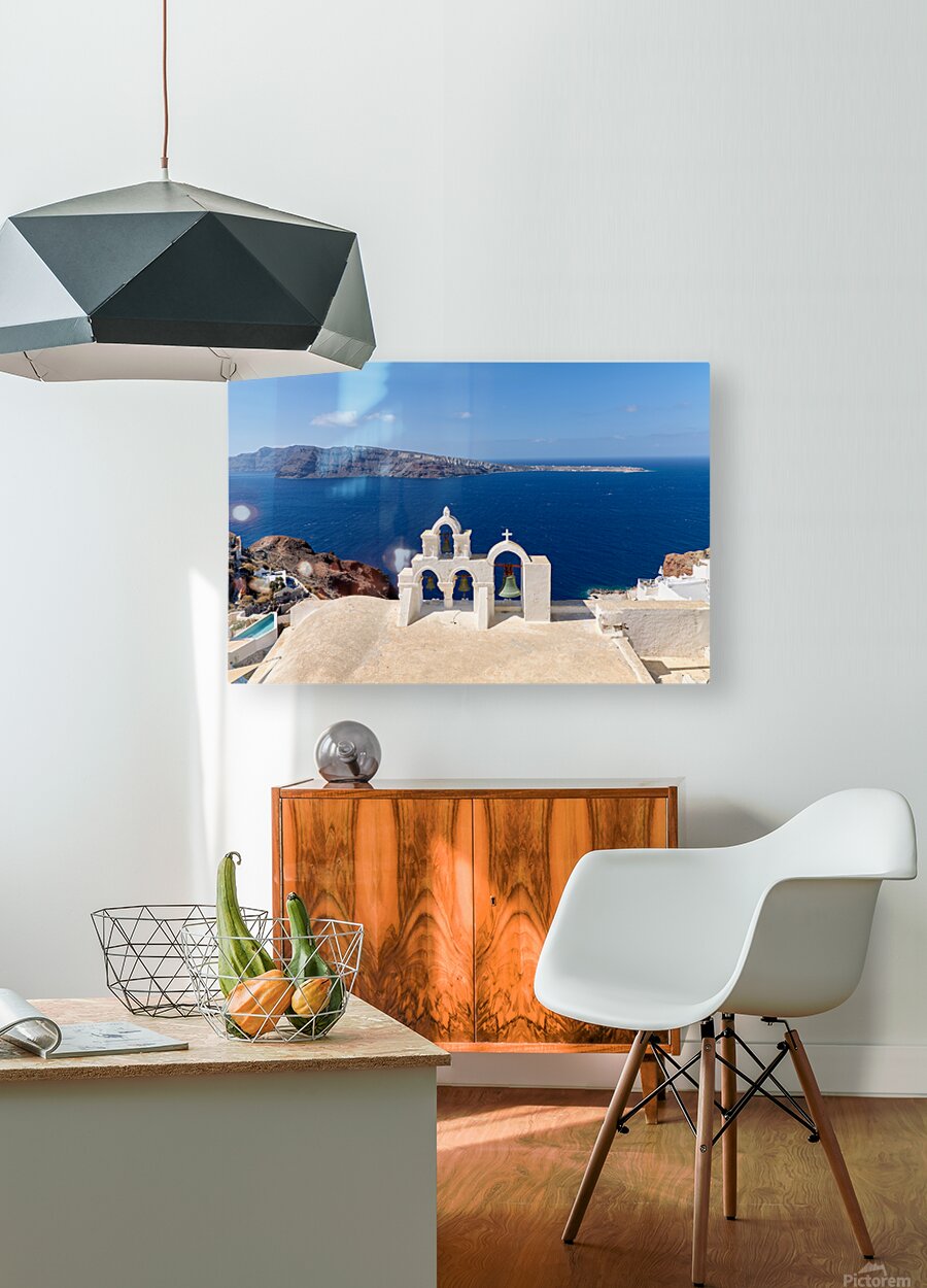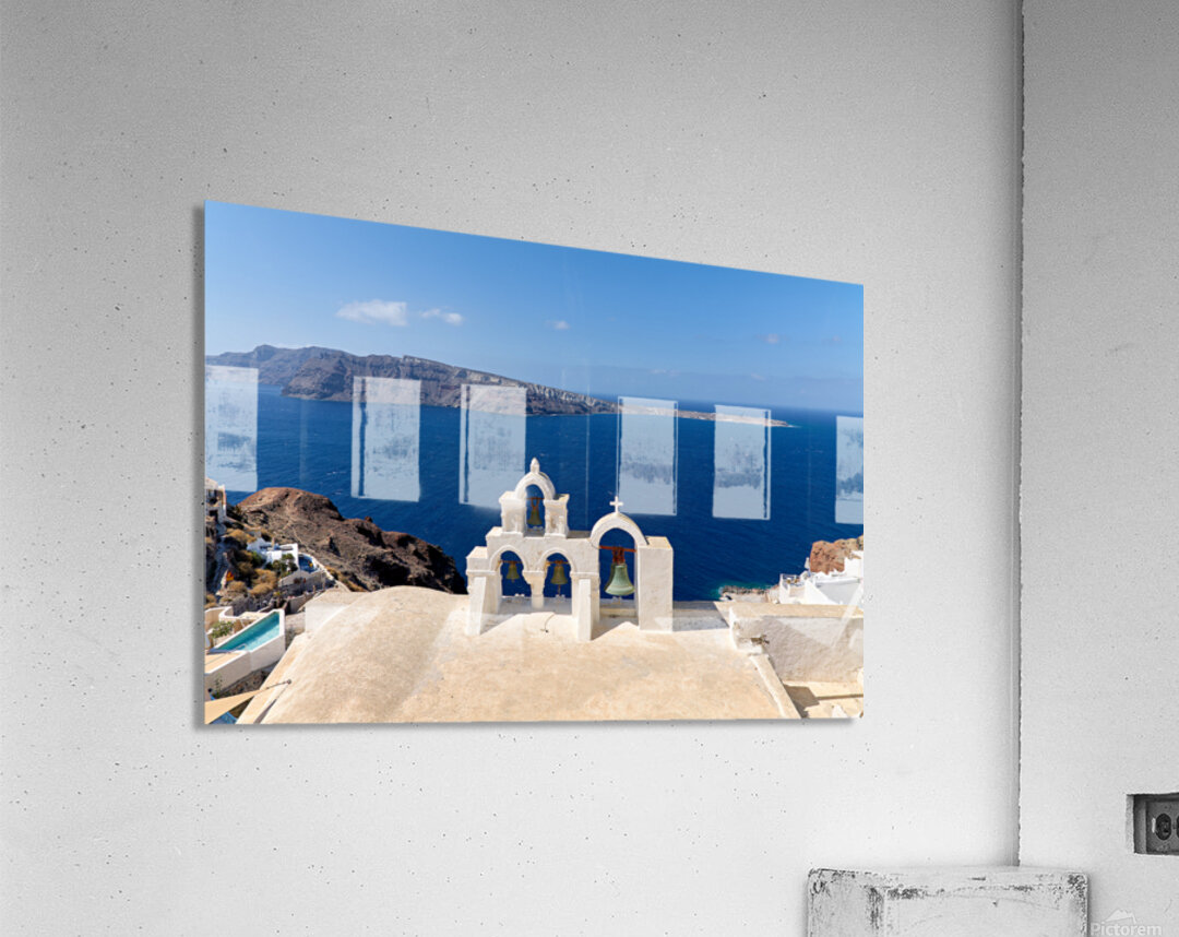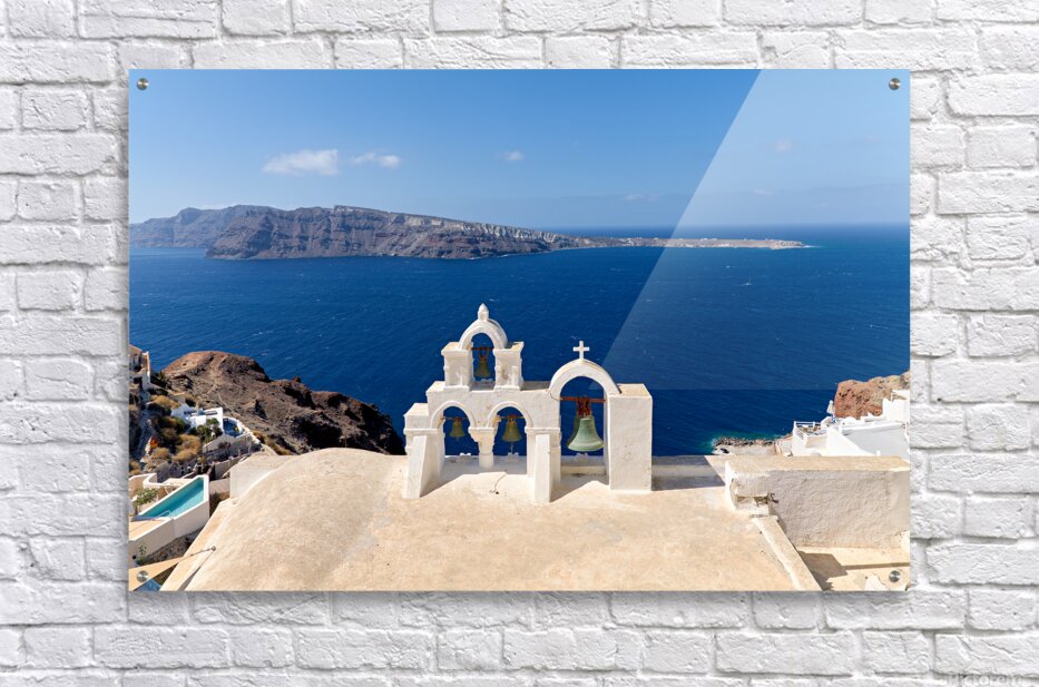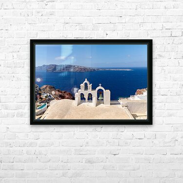 Get this artwork "Iconic Santorini bell tower overlooking the caldera and Aegean S" in a framed print.