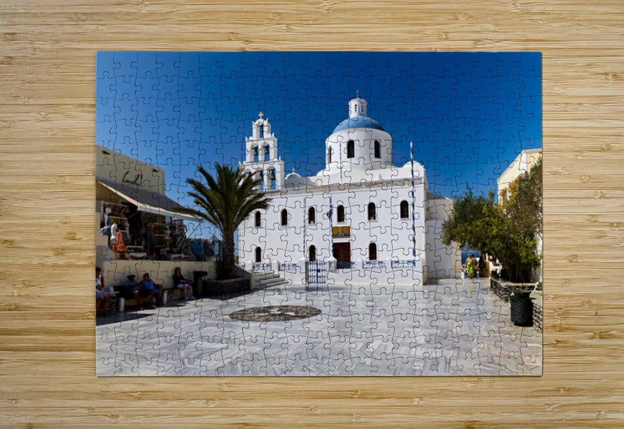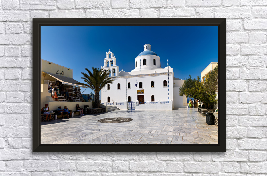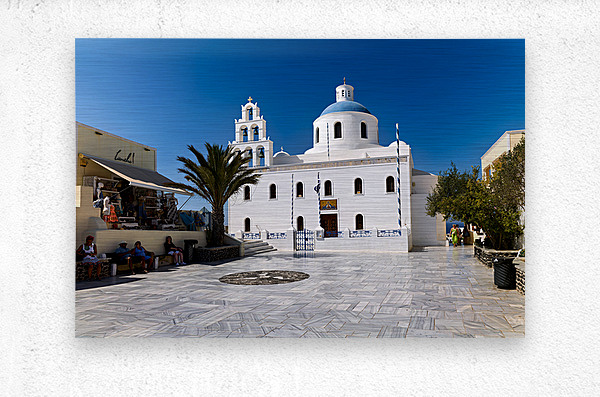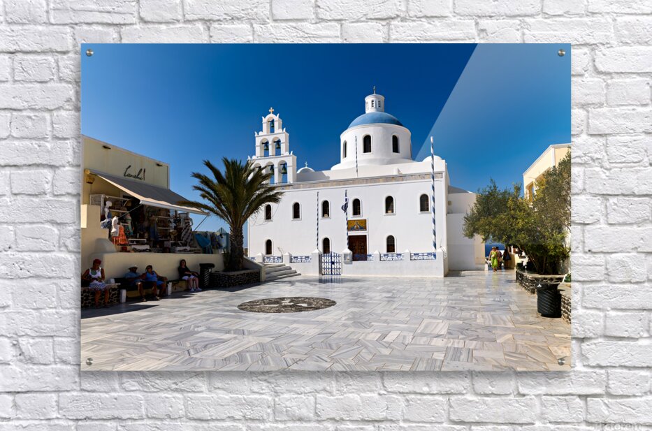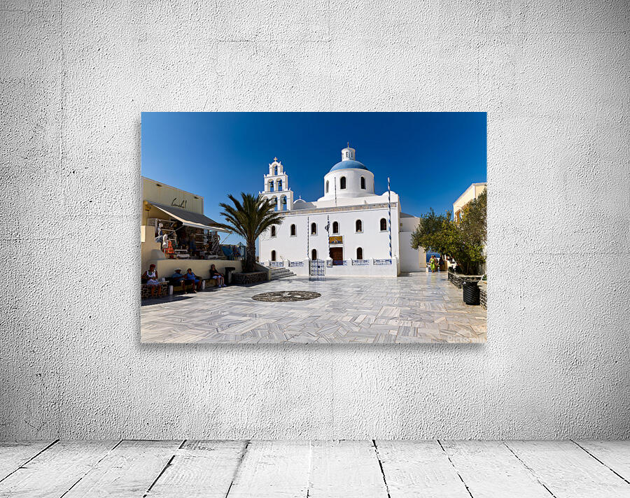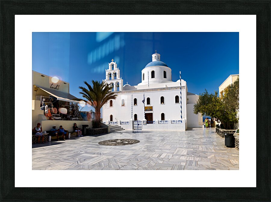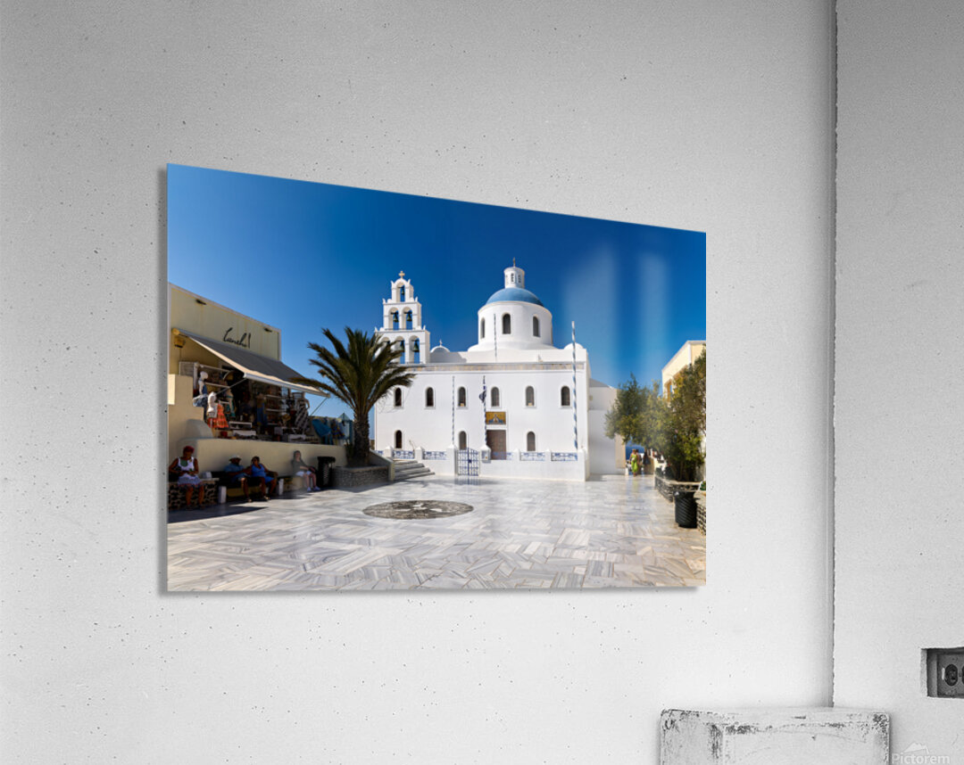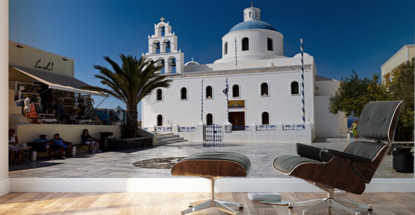 Tourists enjoy the sunny plaza outside Panagia Platsani church in Oia Santorini Greece admiring the iconic white architecture and blue dome.