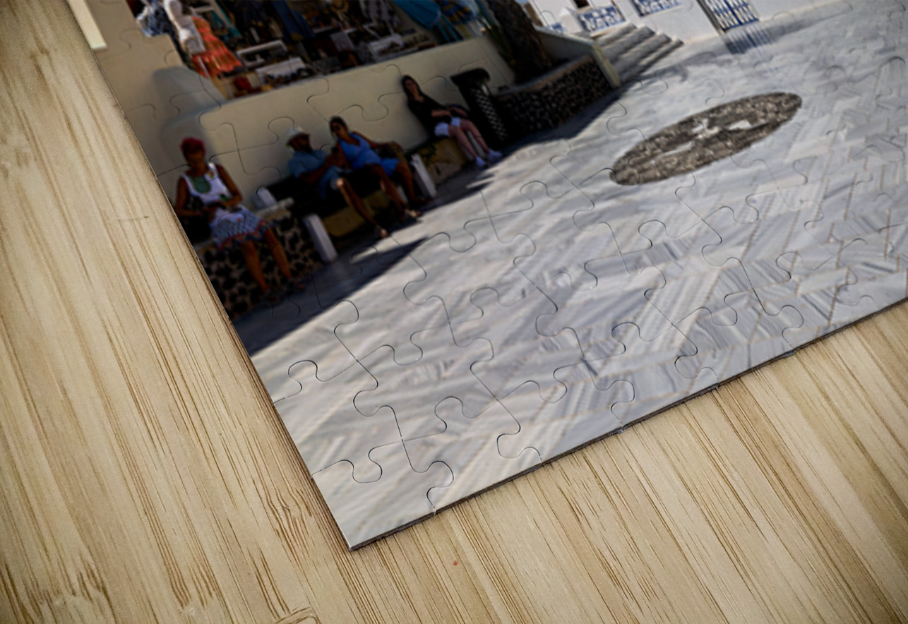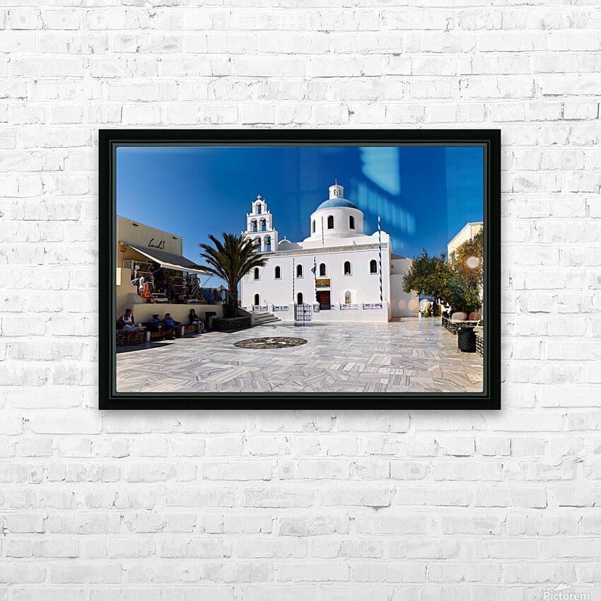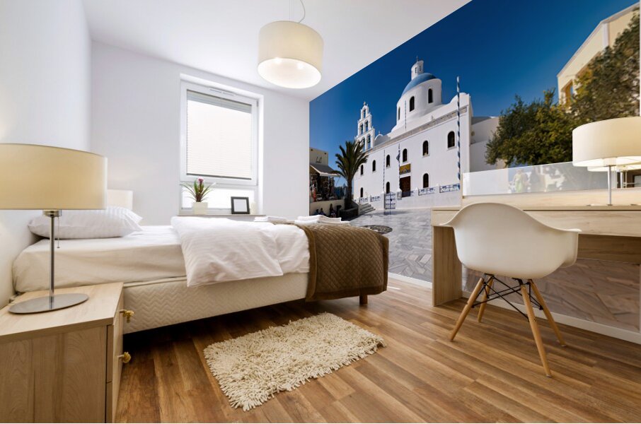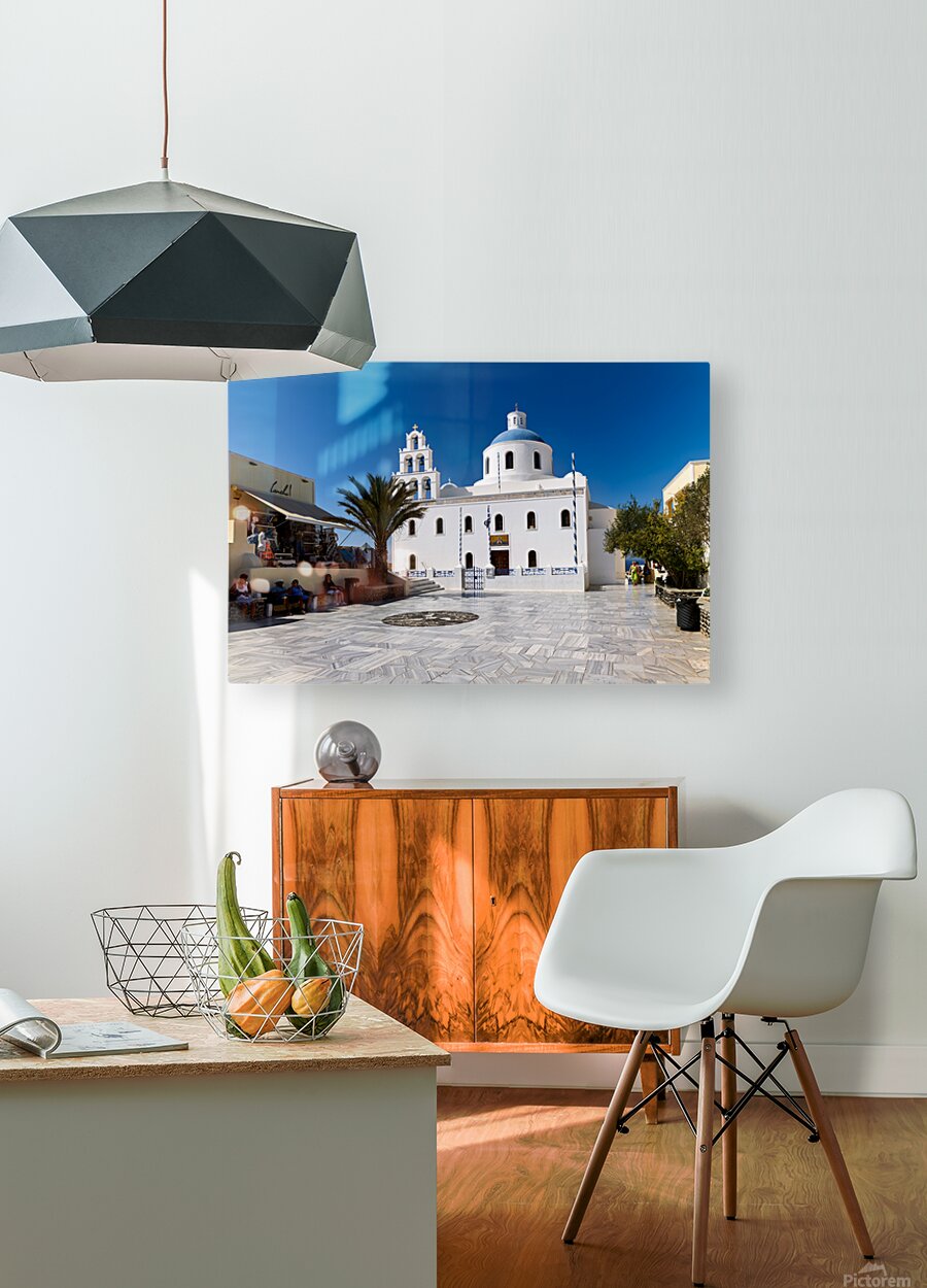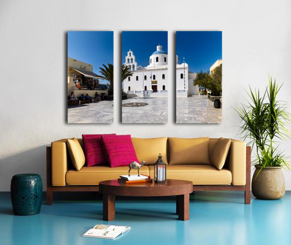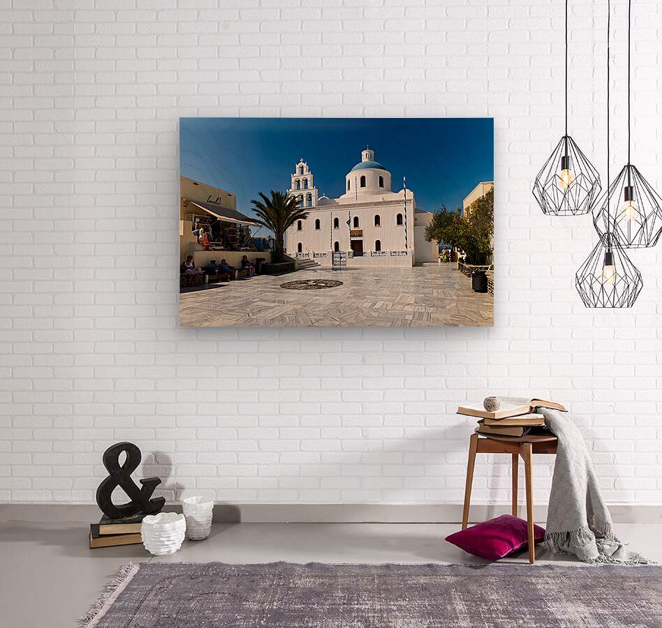 Tourists enjoy the sunny plaza outside Panagia Platsani church in Oia Santorini Greece admiring the iconic white architecture and blue dome.