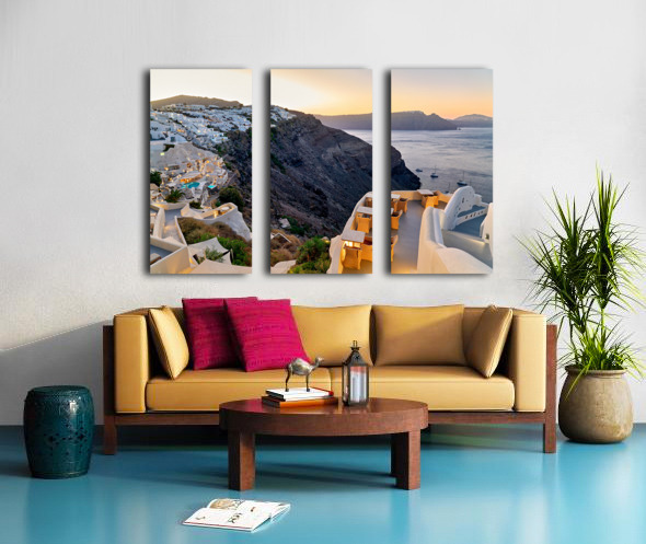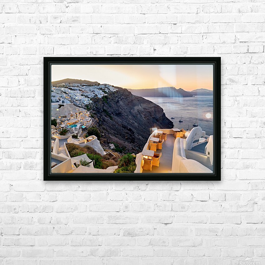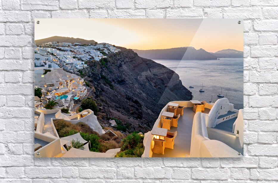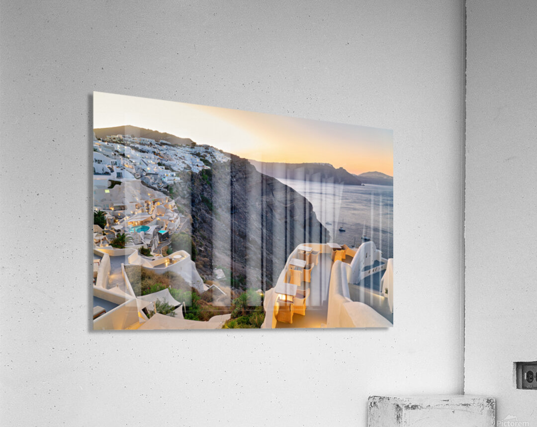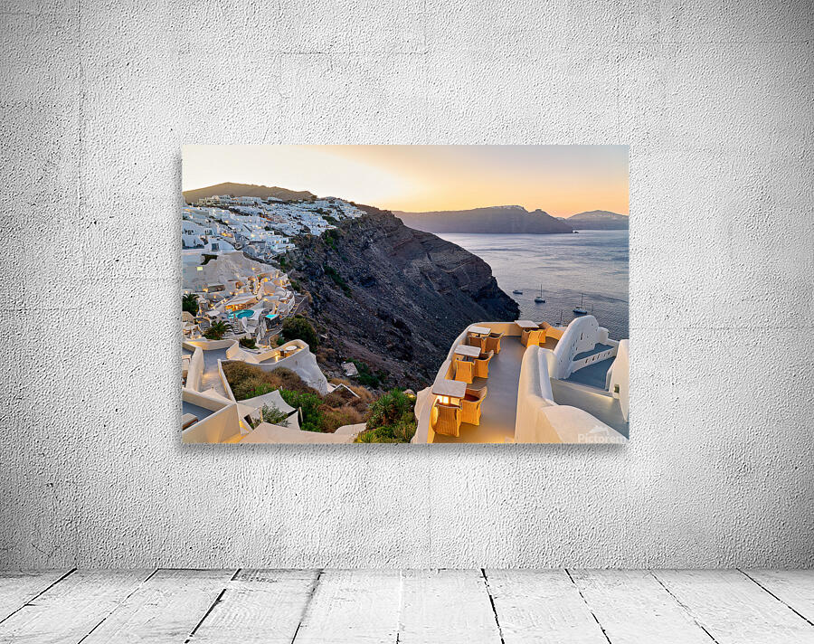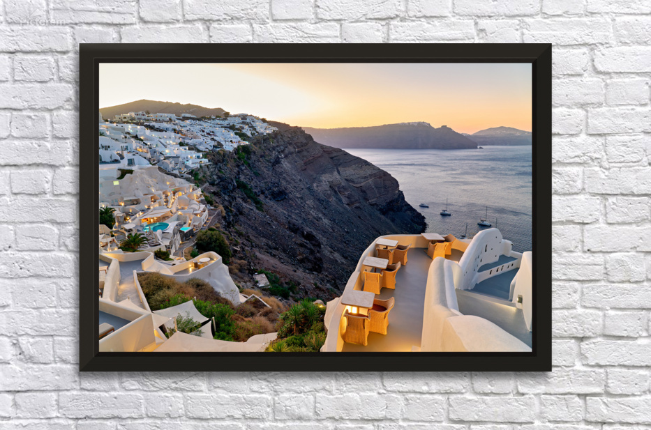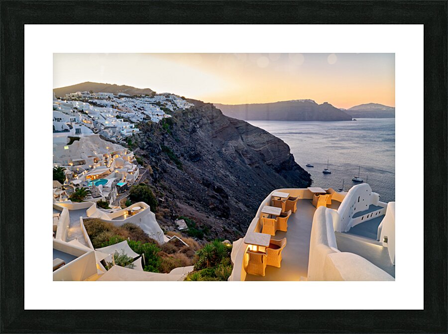 "Sunset over Santorinis white village and caldera." in a framed print.