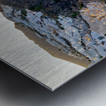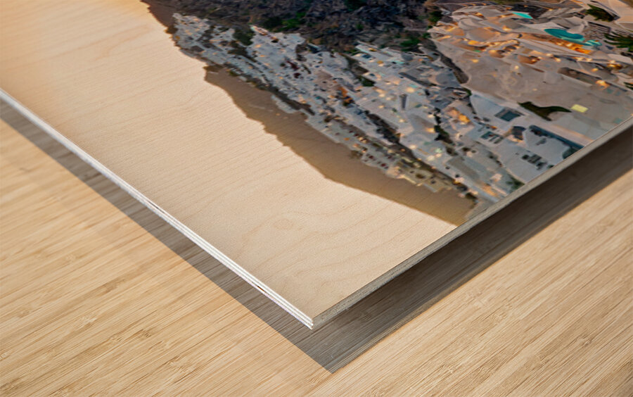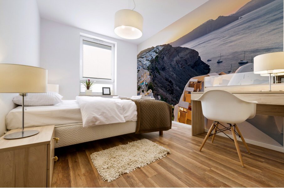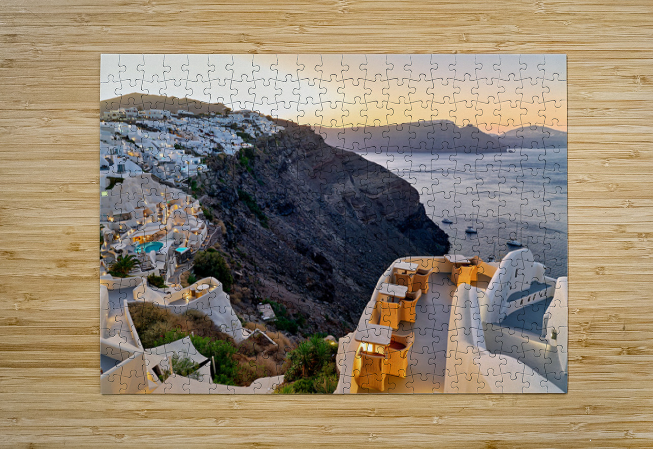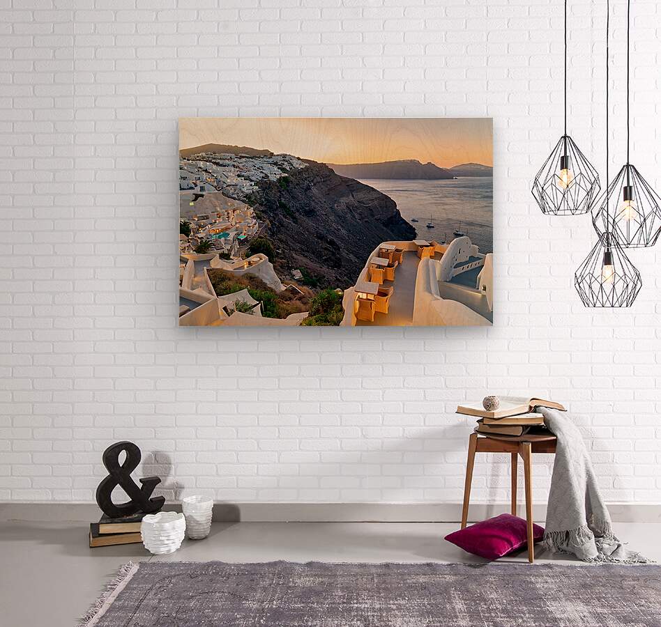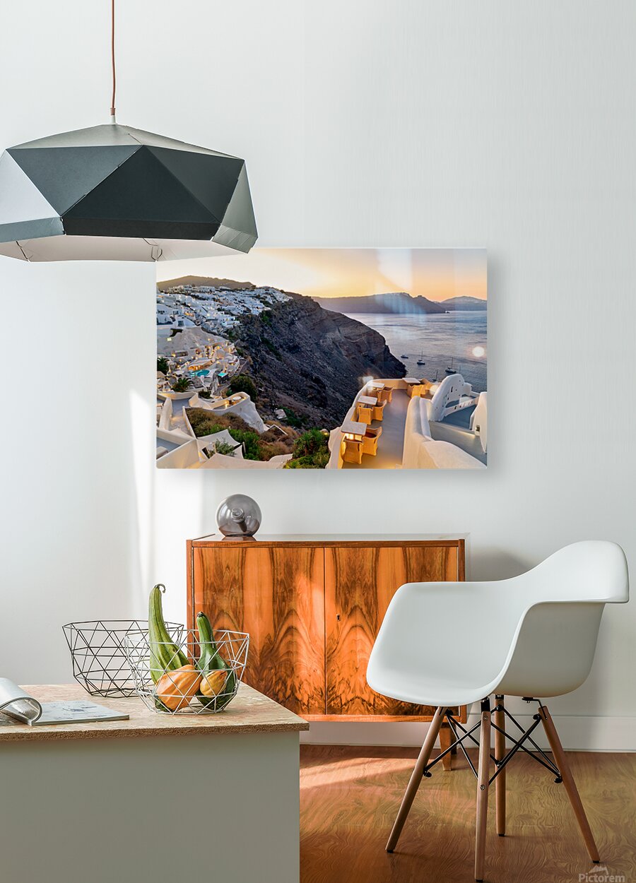 "Sunset over Santorinis white village and caldera." in a framed print.