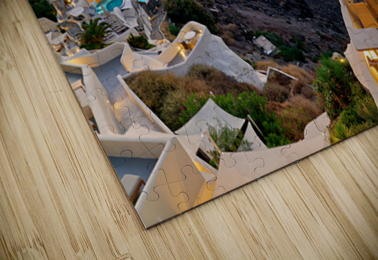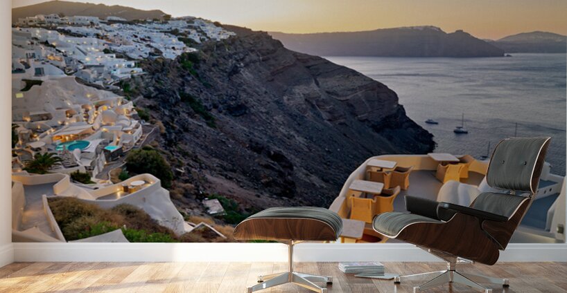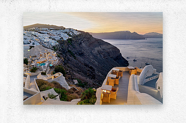 Sunset over Santorini Greece showcasing white cliffside villages luxury hotels and outdoor dining areas overlooking the Aegean Sea and caldera offerin