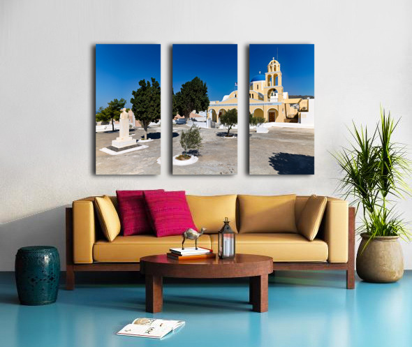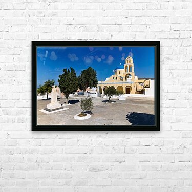 Get this artwork "Traditional Greek church blue dome bell tower sunny day." in a framed print.