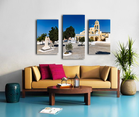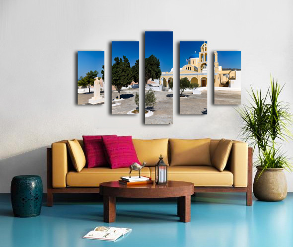 Traditional Greek church blue dome bell tower sunny day. Frame print
