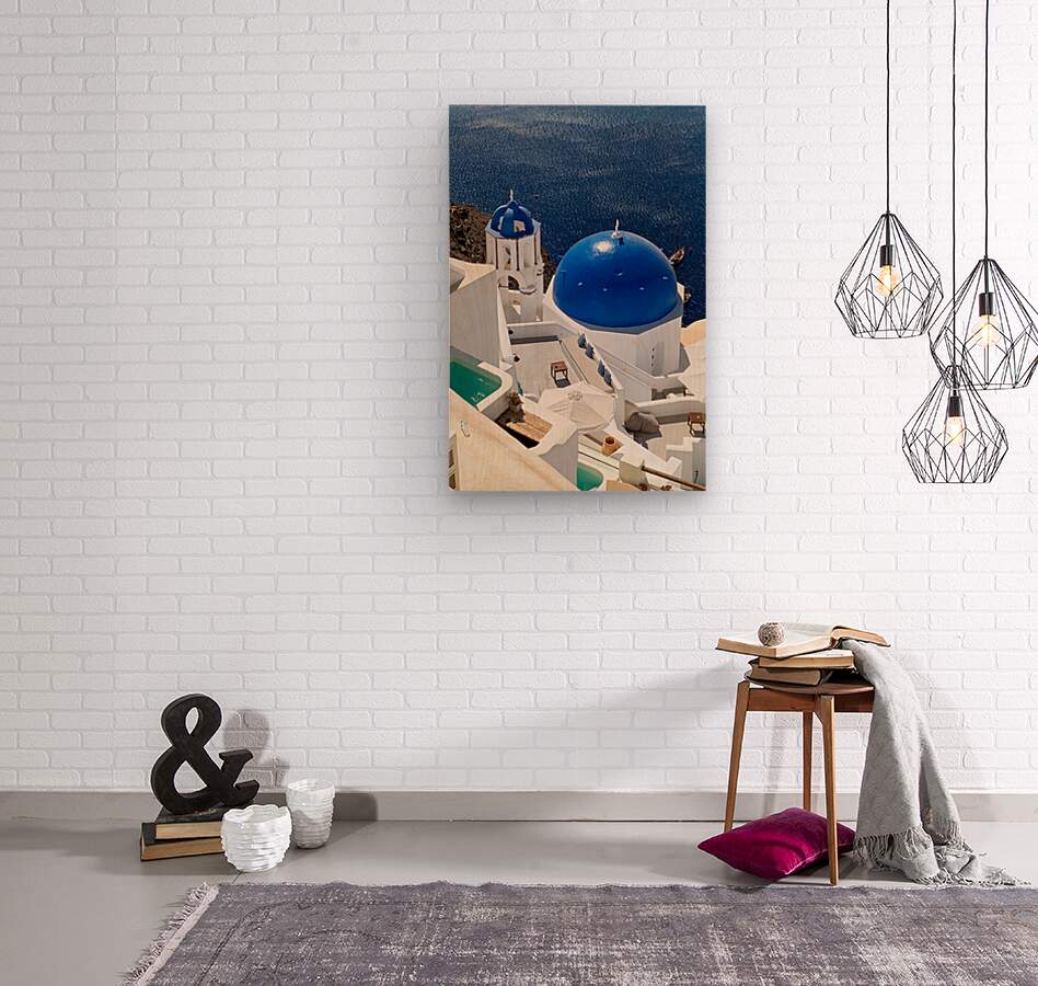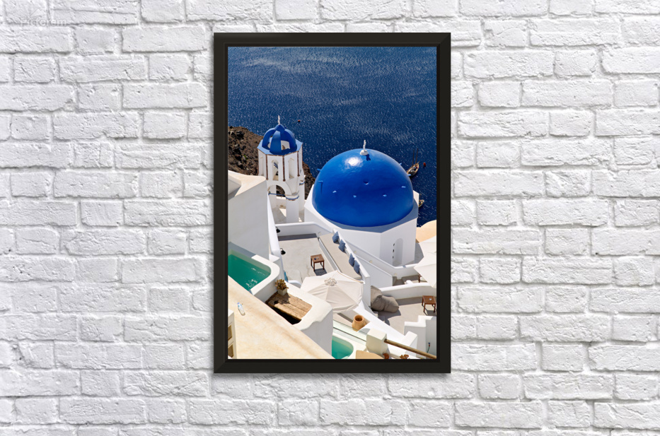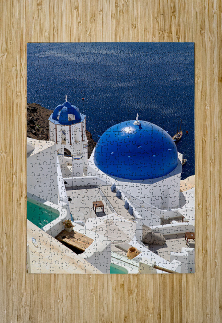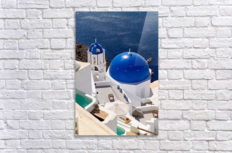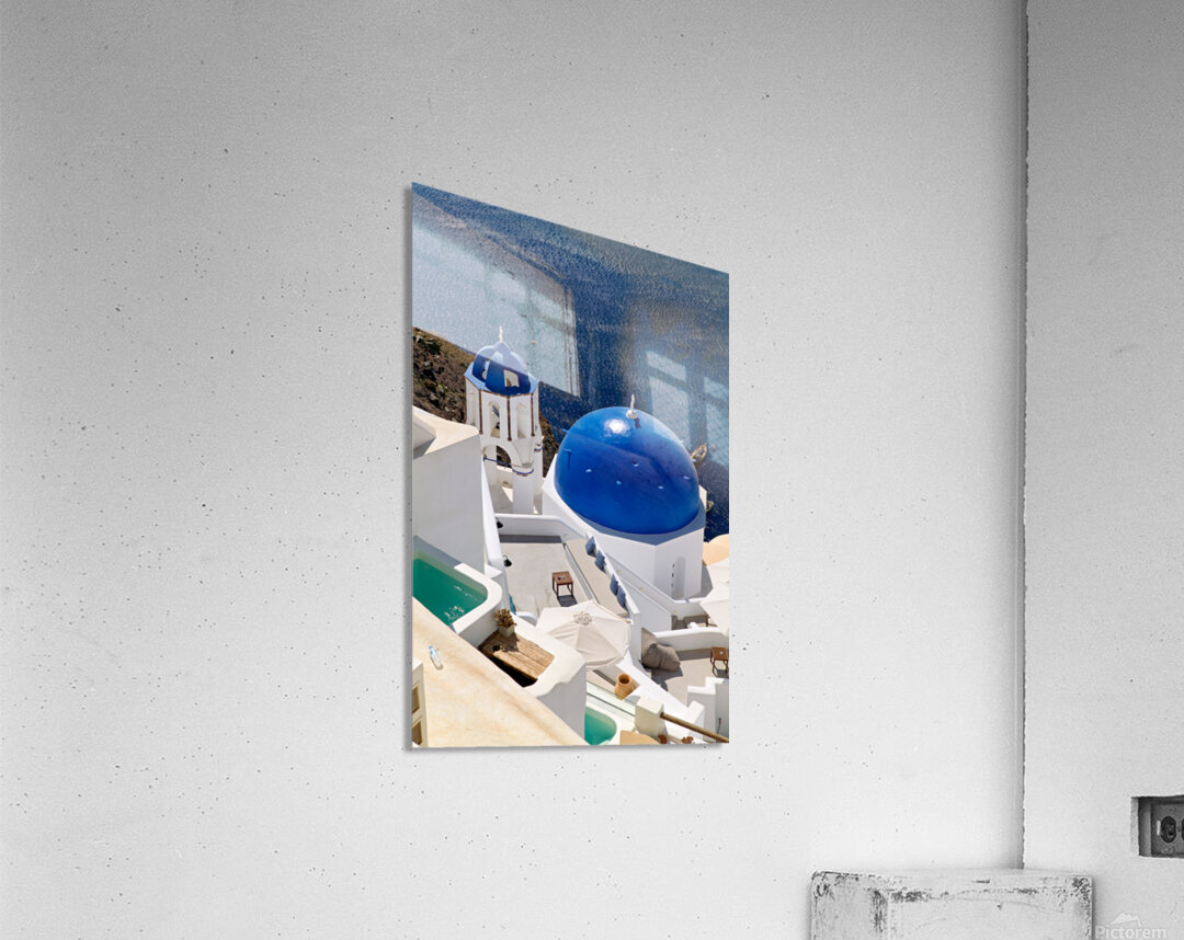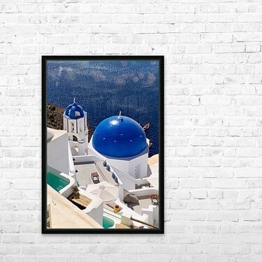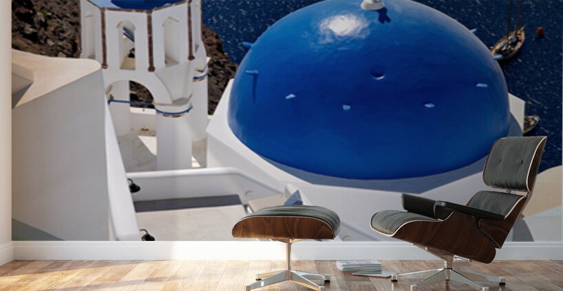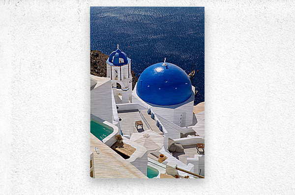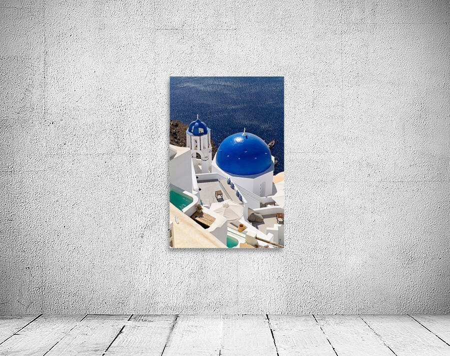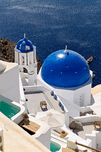 Iconic blue-domed churches and white buildings overlook the Aegean Sea in Santorini Greece offering stunning views and a serene escape for visitors.