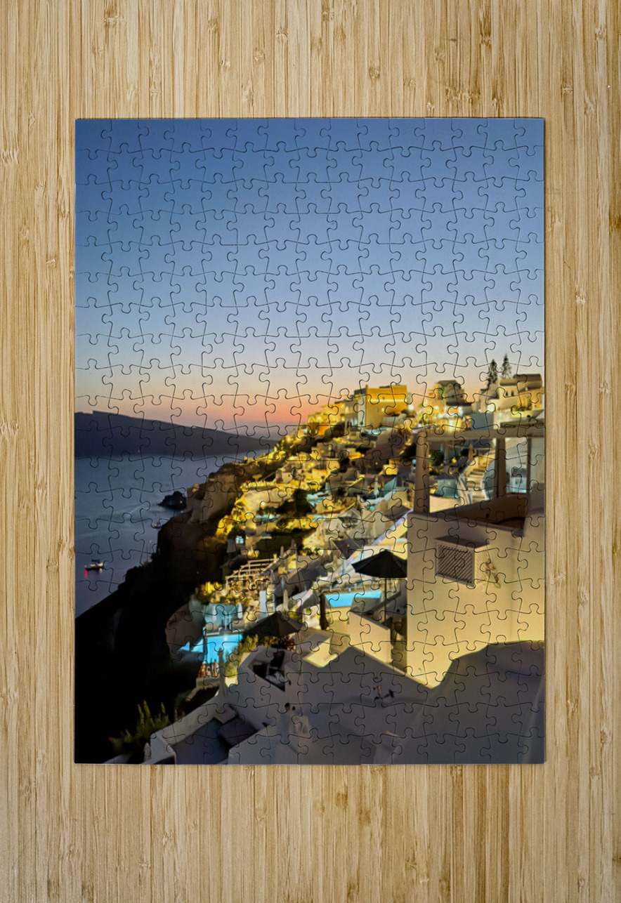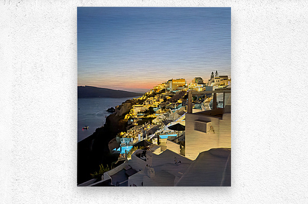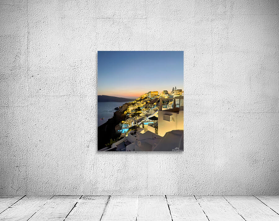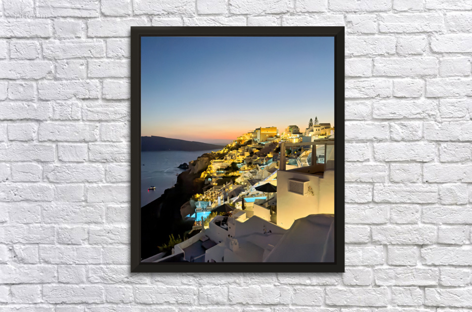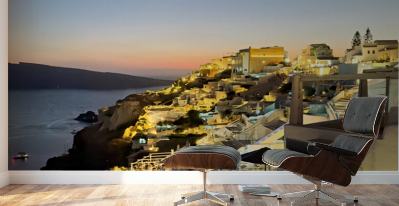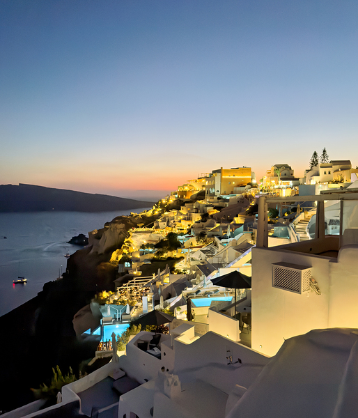 Tourists enjoy the iconic whitewashed architecture and caldera views of Santorini Greece illuminated at dusk creating a magical evening atmosphere.