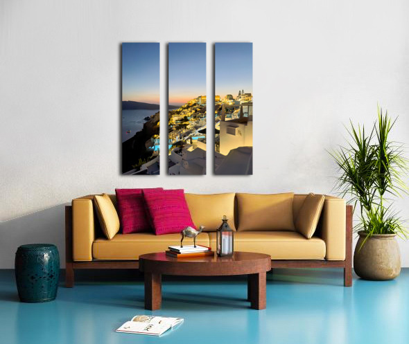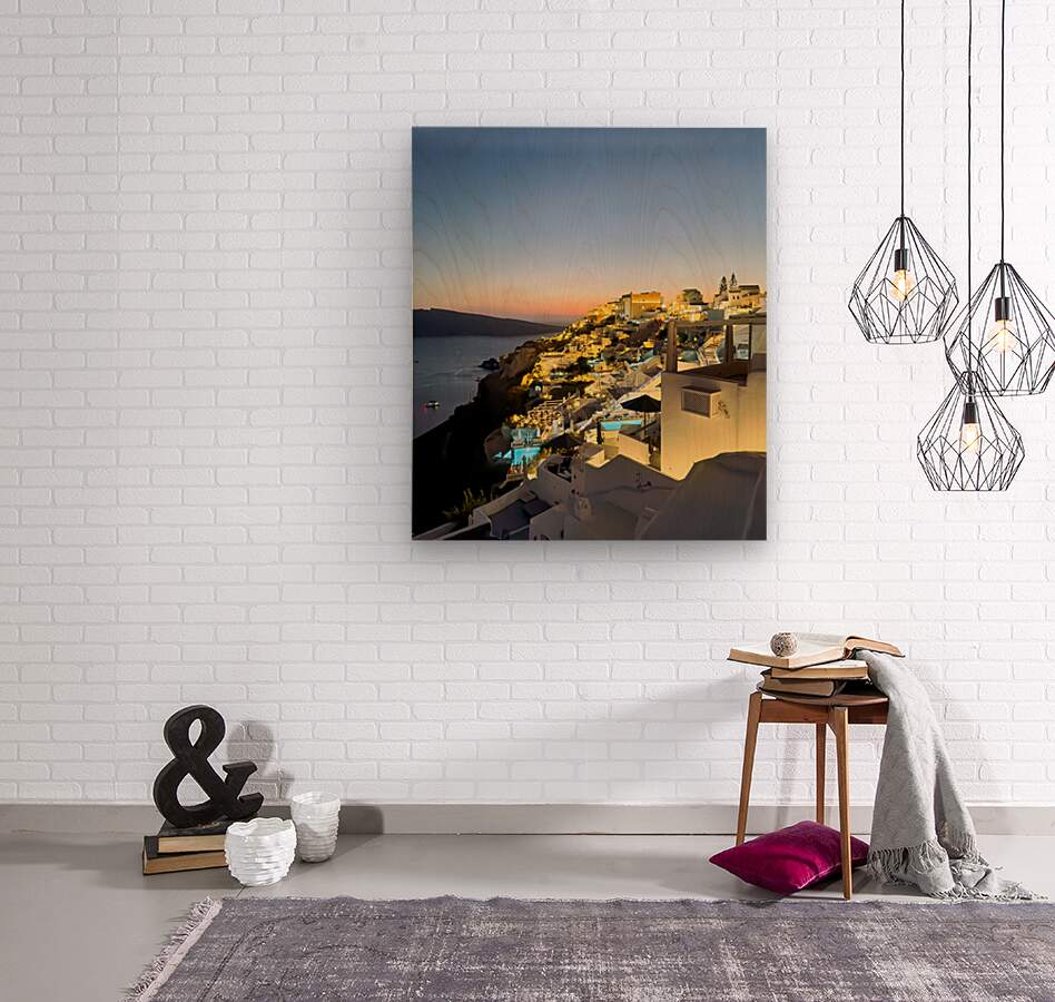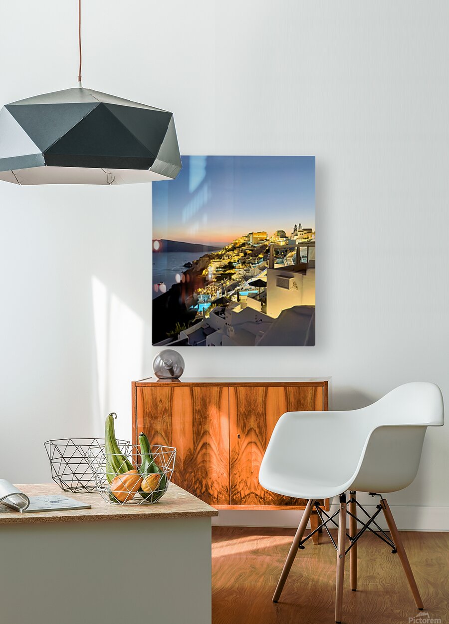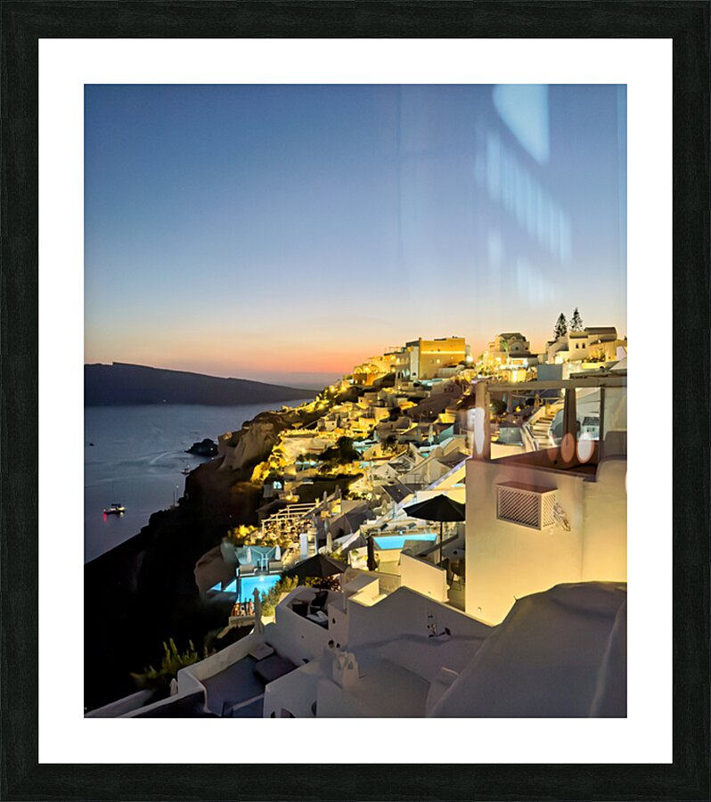 Tourists enjoy the iconic whitewashed architecture and caldera views of Santorini Greece illuminated at dusk creating a magical evening atmosphere.