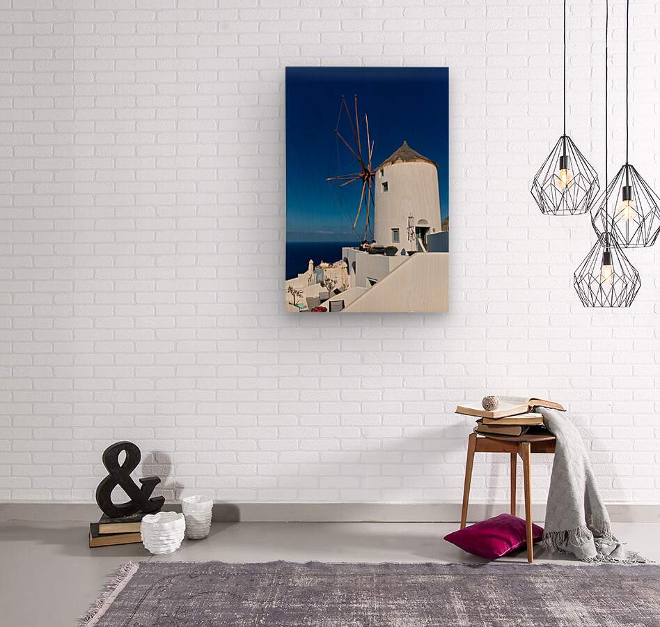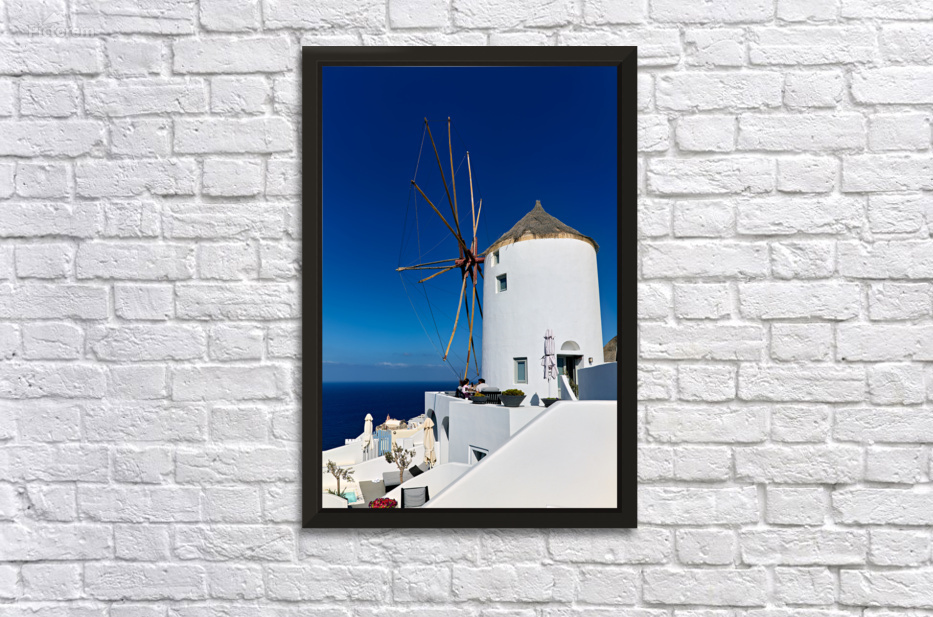 Tourists relax at an outdoor cafe next to a traditional windmill in Santorini Greece enjoying the stunning views of the Aegean Sea.