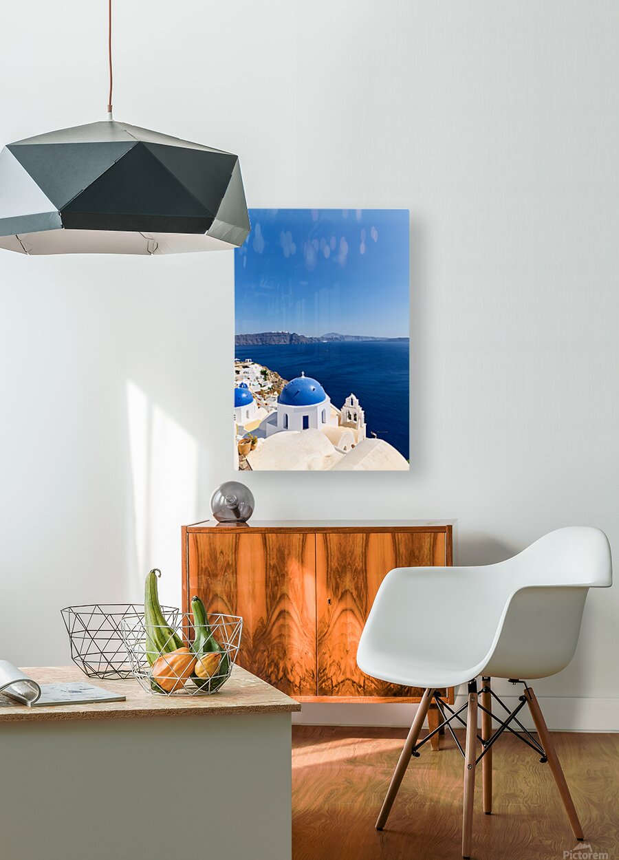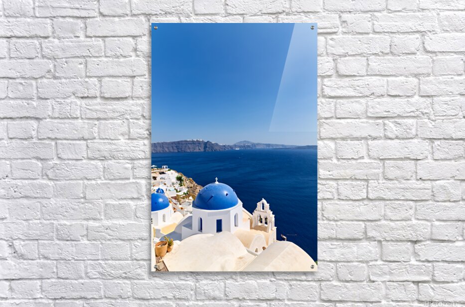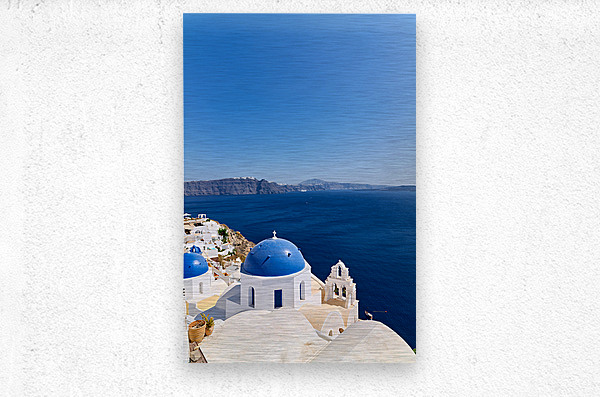 ABOUT THIS ARTWORK: ICONIC BLUE DOMES AND WHITE ARCHITECTURE OF SANTORINI GREECE.