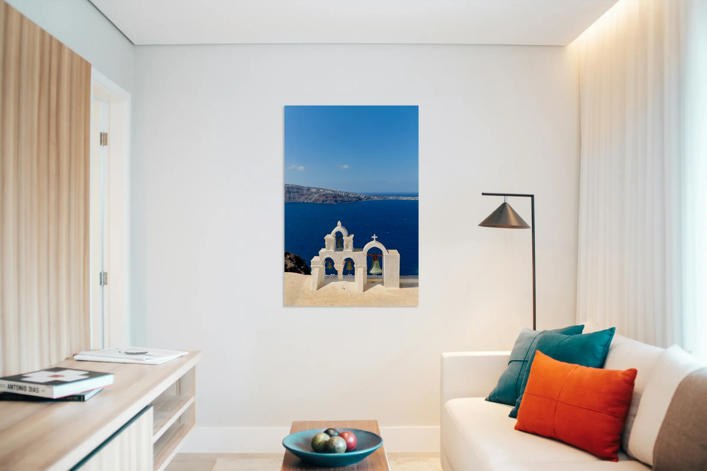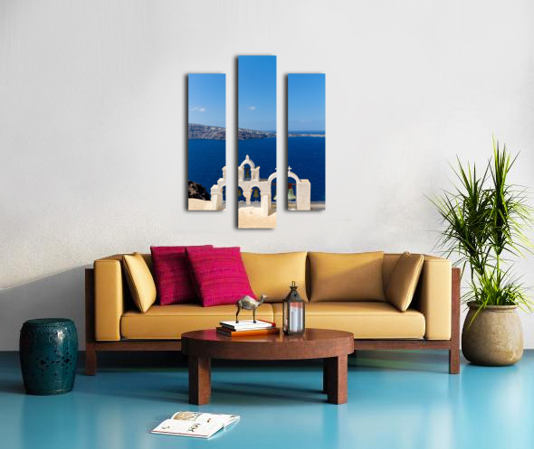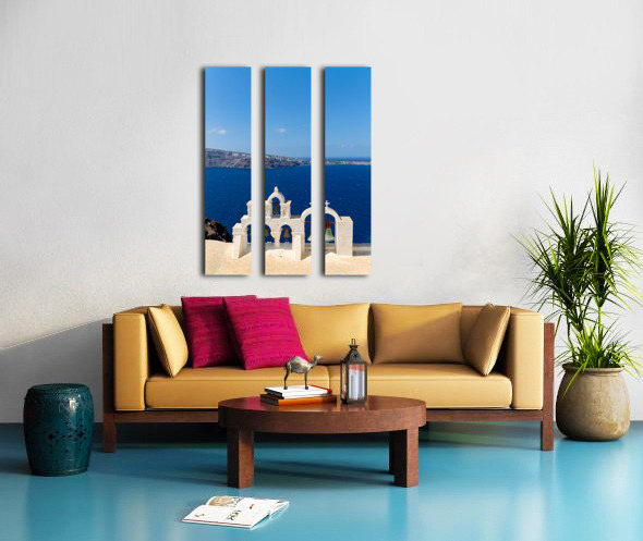 Santorini bell tower overlooking the Aegean Sea. Frame print
