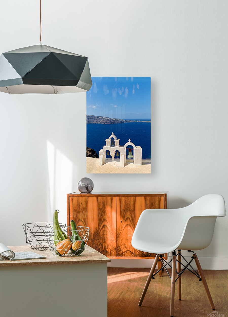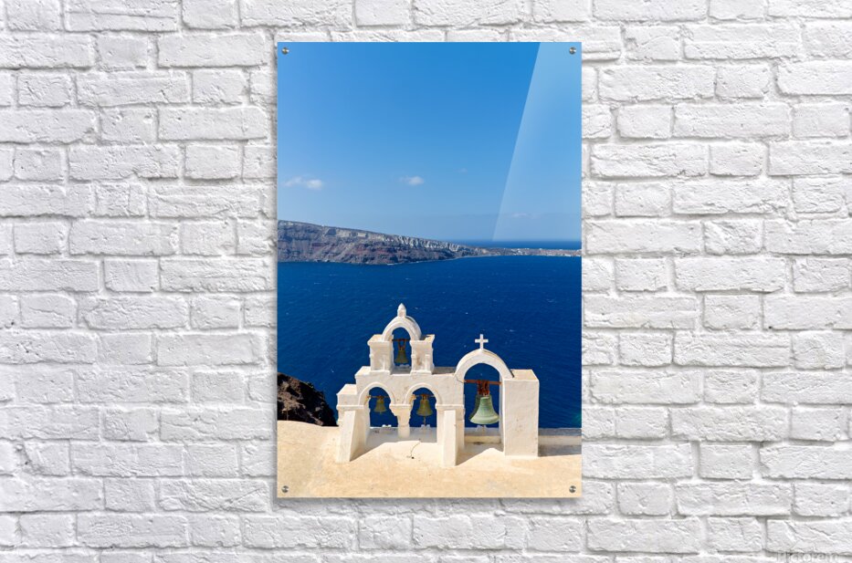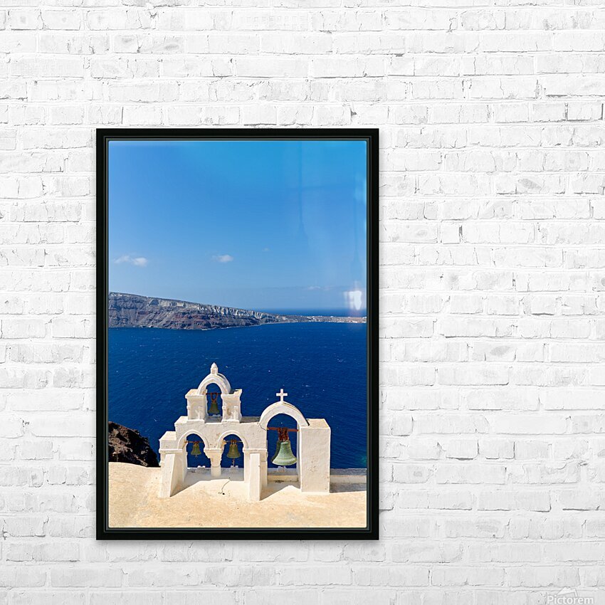Santorini bell tower overlooking the Aegean Sea. Picture Frame Printing
