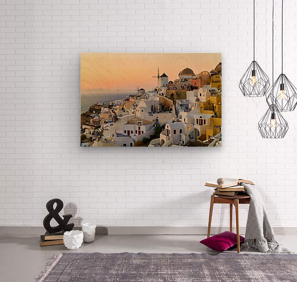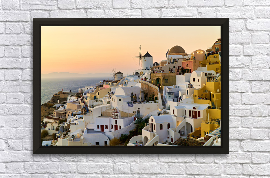 Tourists enjoy the sunset over the iconic white and colorful buildings of Oia Santorini Greece with windmills dotting the cliffside.