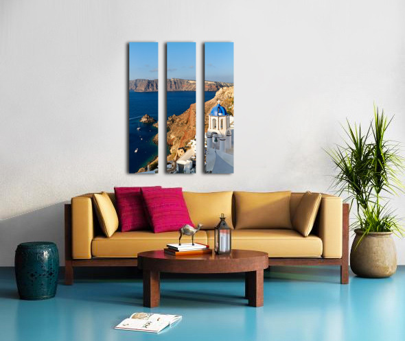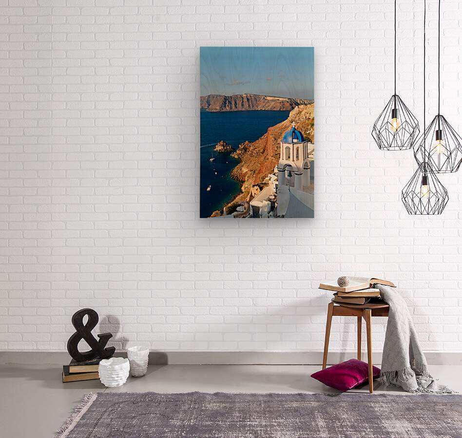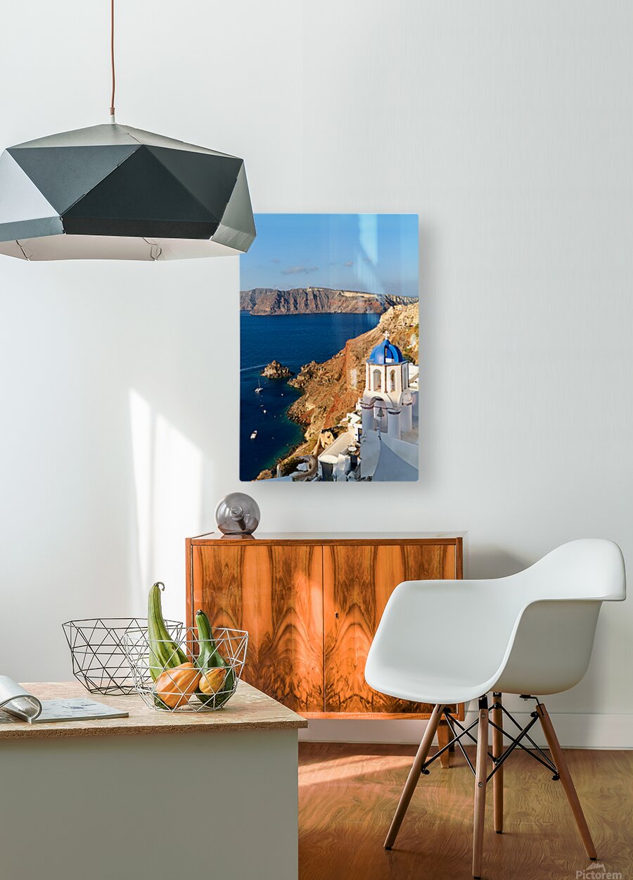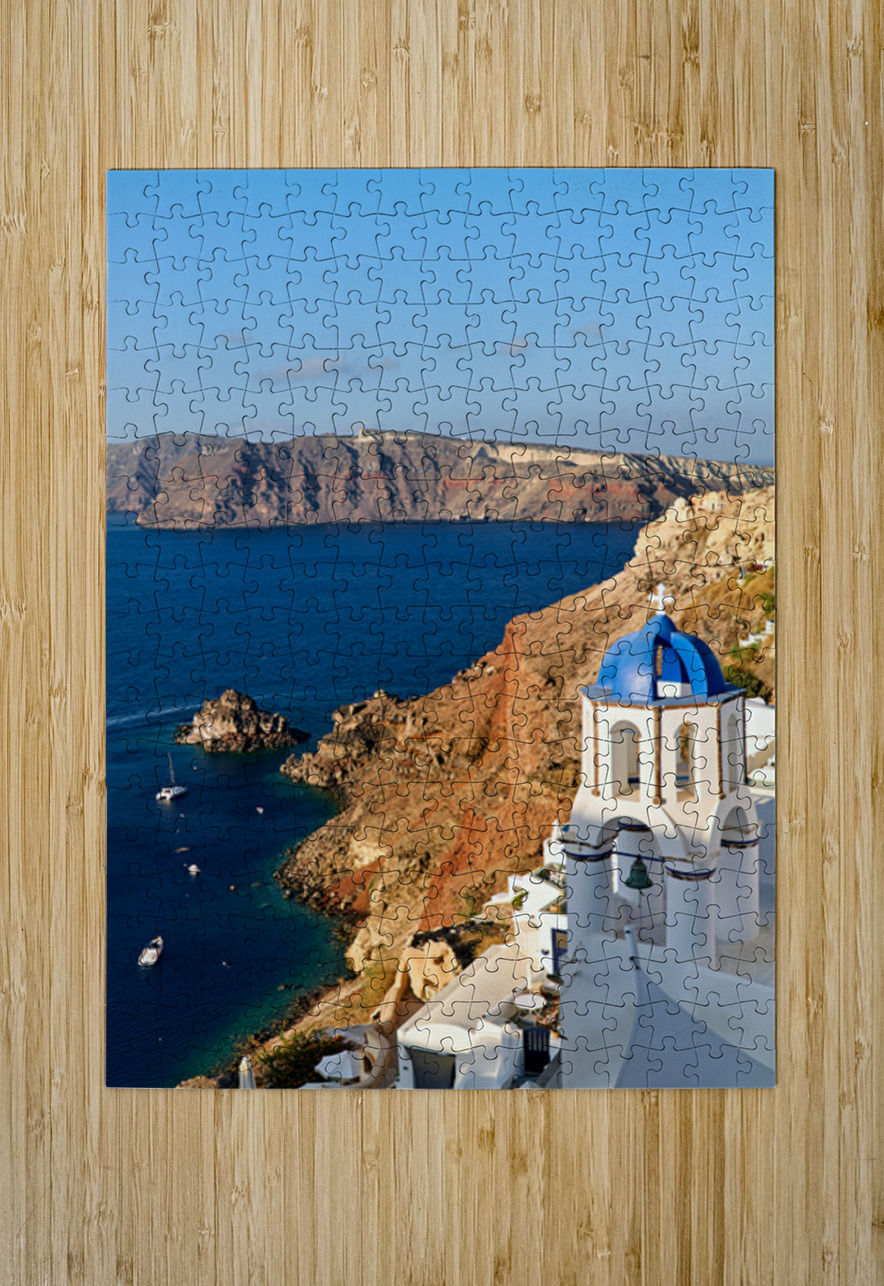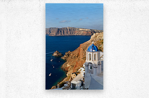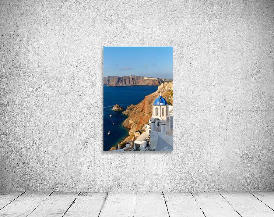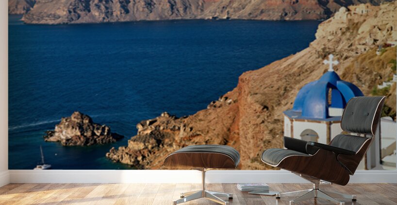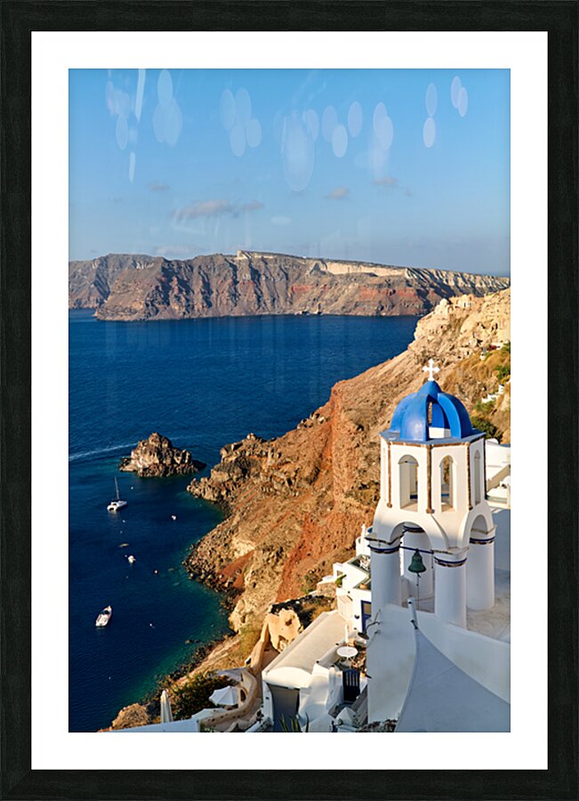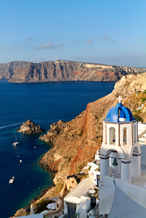 A picturesque blue-domed church overlooks the Aegean Sea and volcanic caldera cliffs in Santorini Greece a popular tourist destination.
