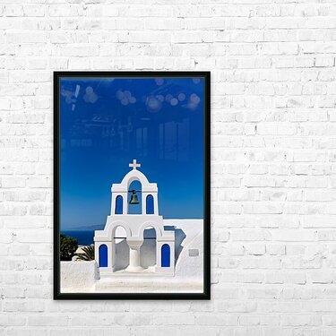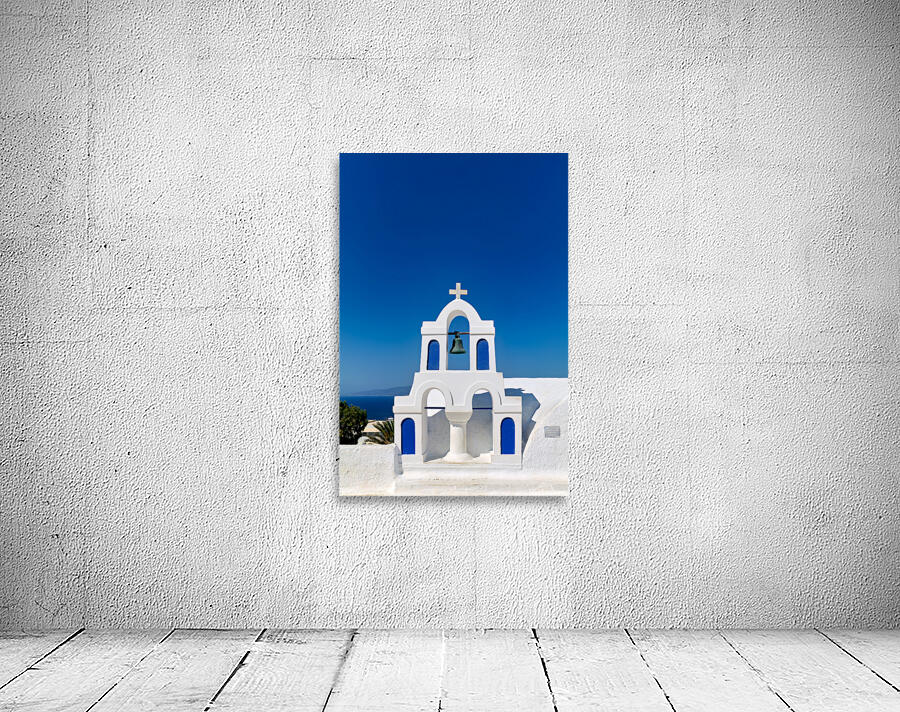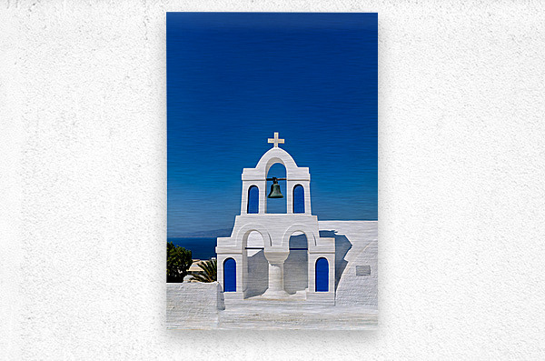 A classic white and blue bell tower of a Greek Orthodox church on a sunny island overlooking the Aegean Sea embodying traditional Cycladic architectur