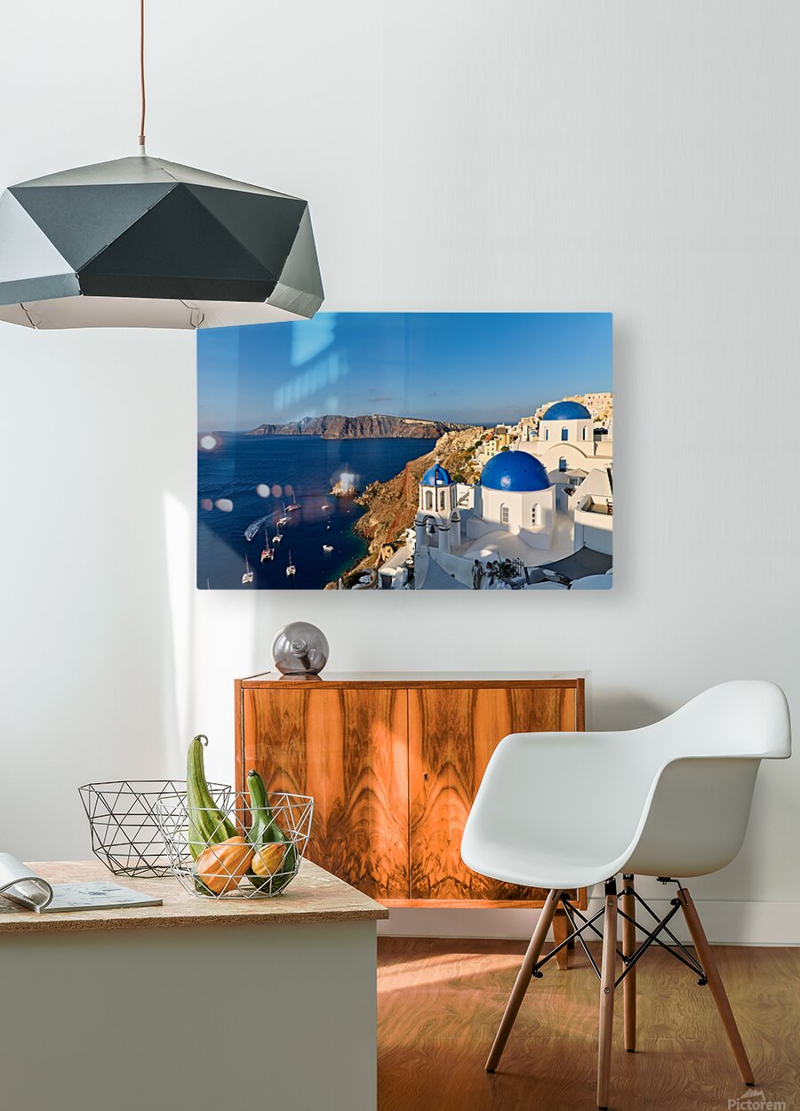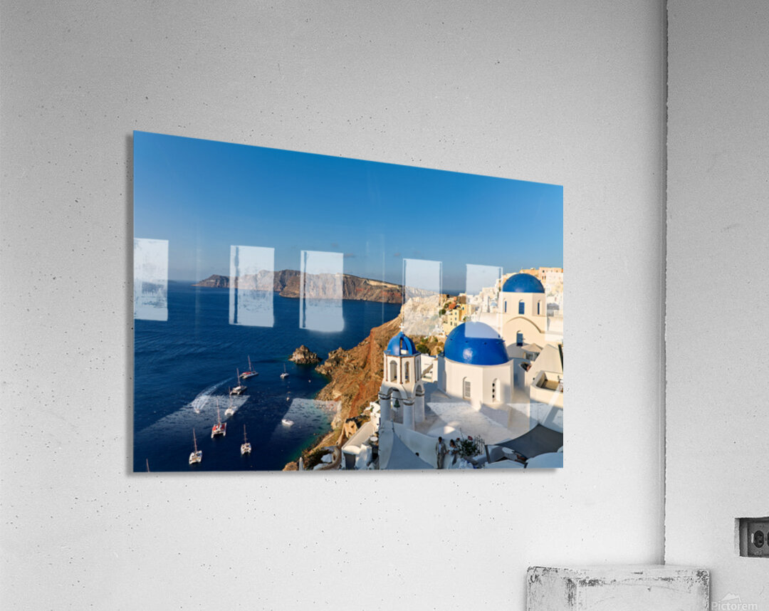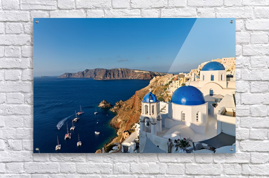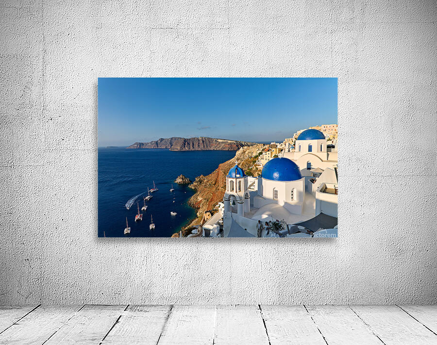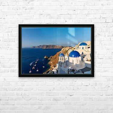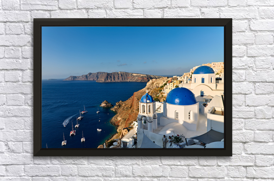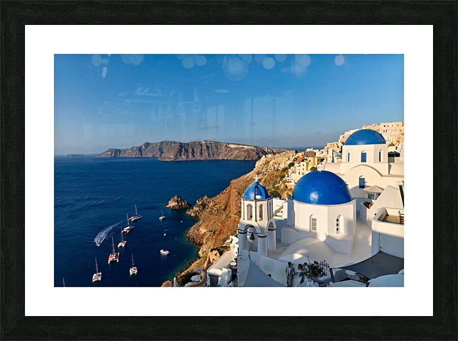 "Stunning Santorini vista: blue domes white village caldera bo" in a framed print.