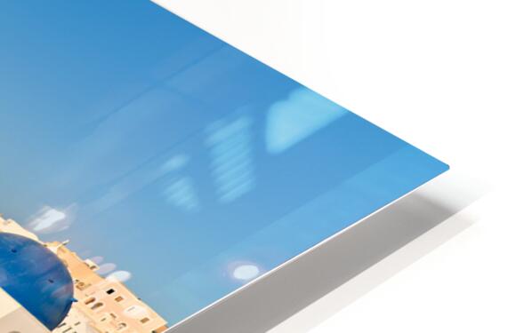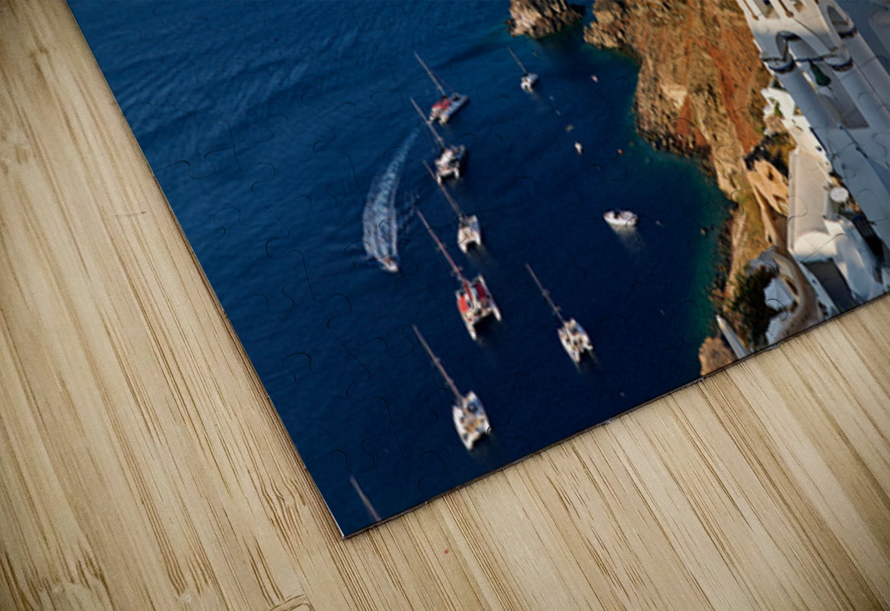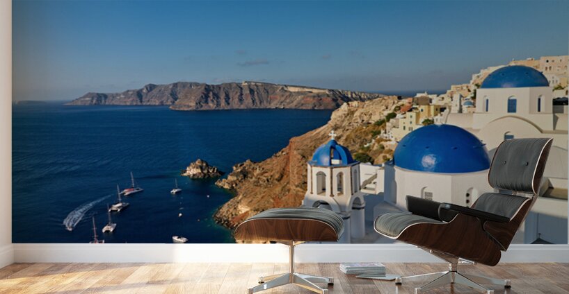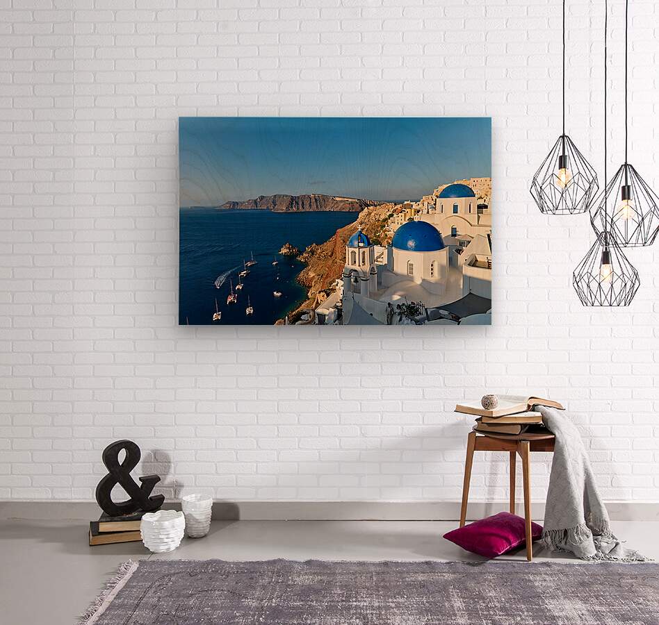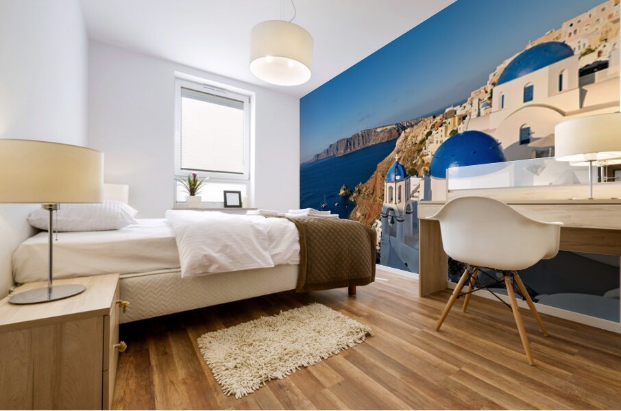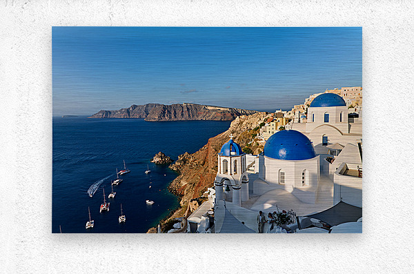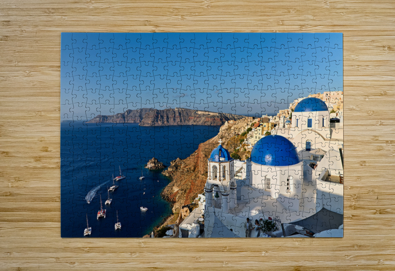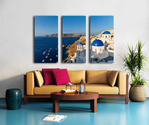 "Stunning Santorini vista: blue domes white village caldera bo" in a framed print.