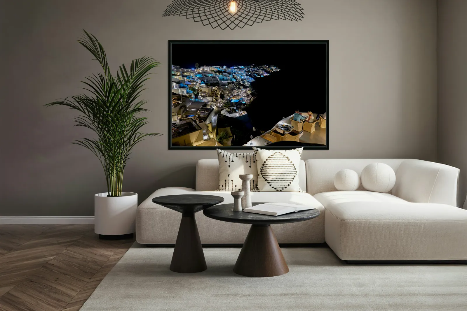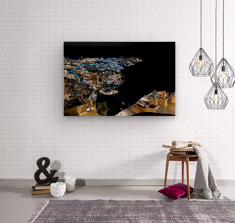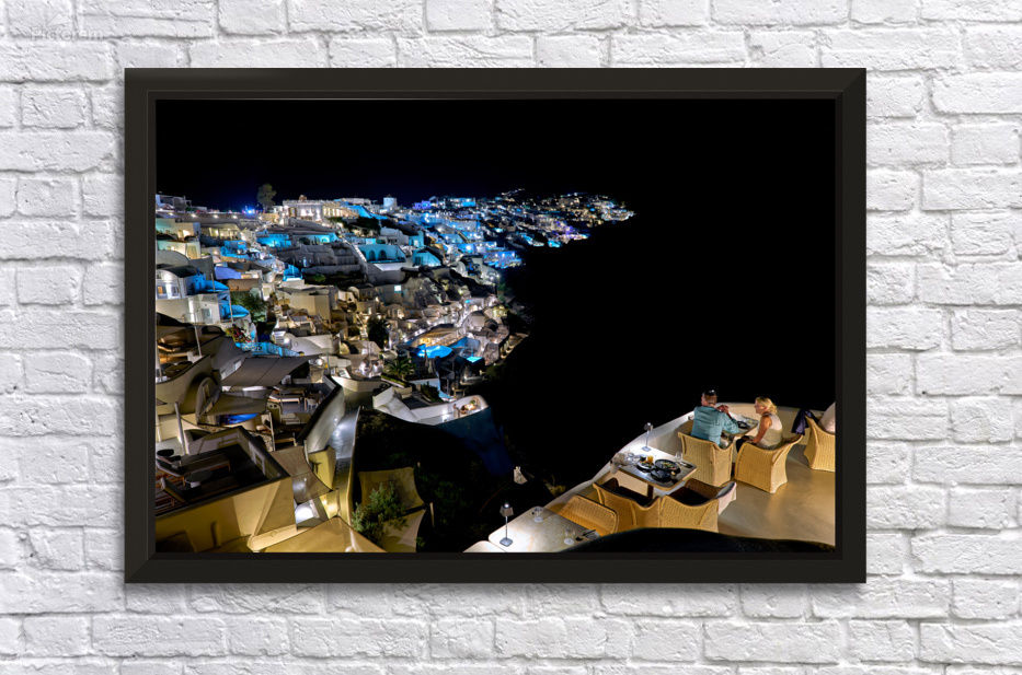 A couple enjoys a romantic dinner at a restaurant overlooking the illuminated town of Santorini Greece at night.