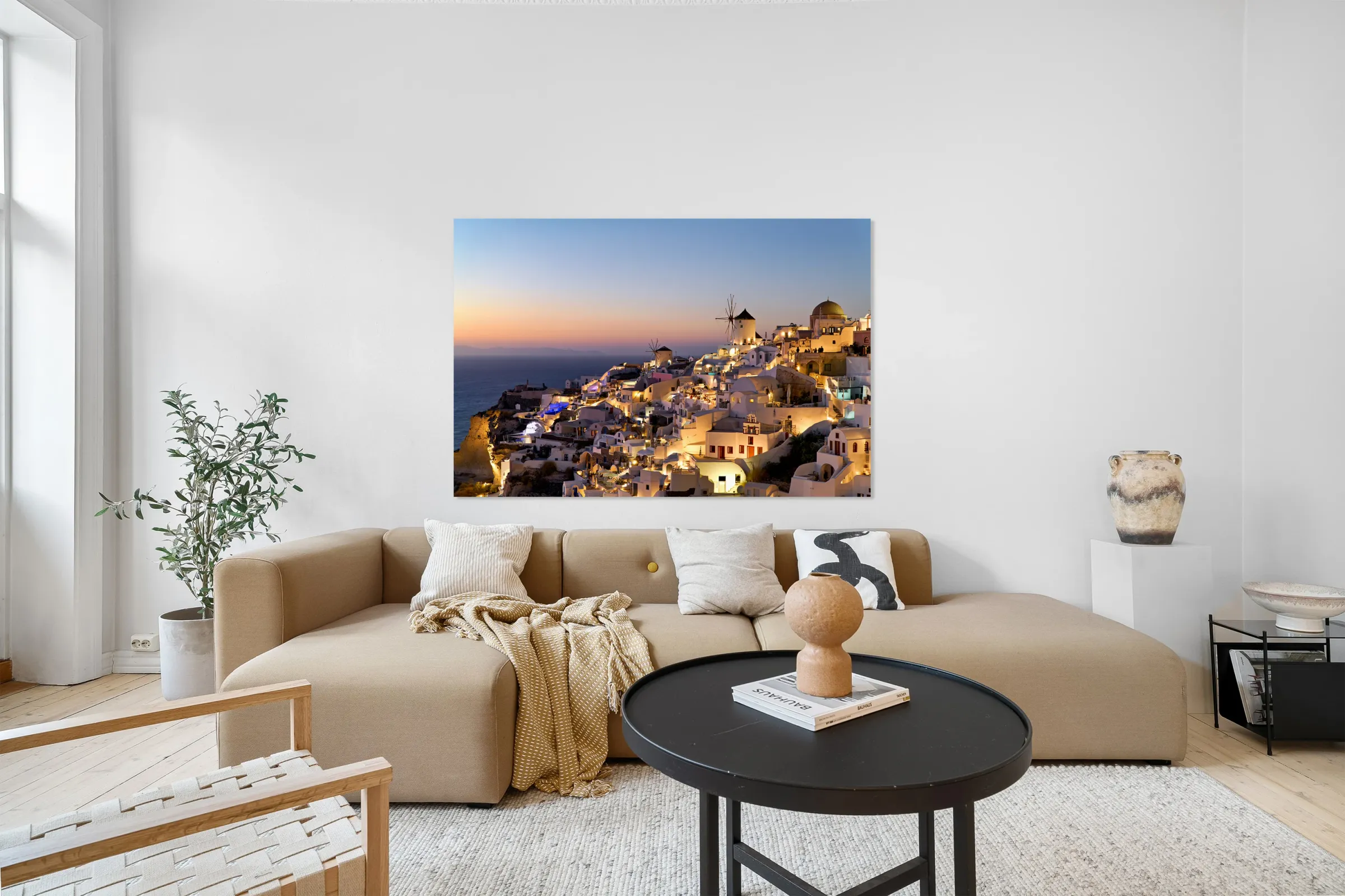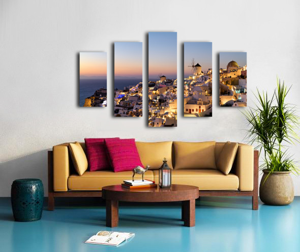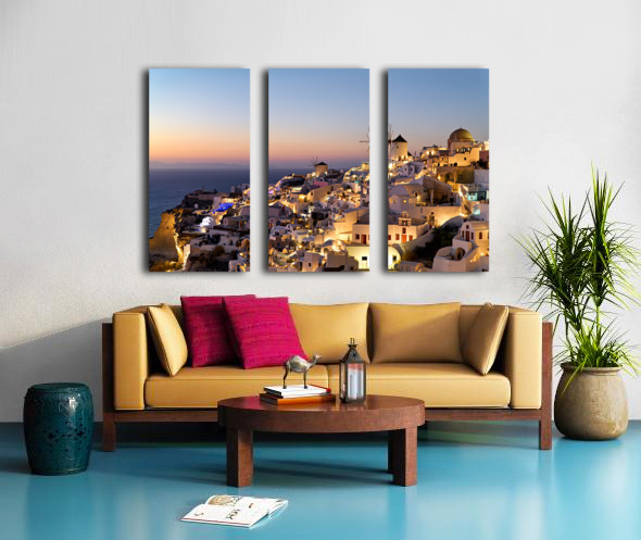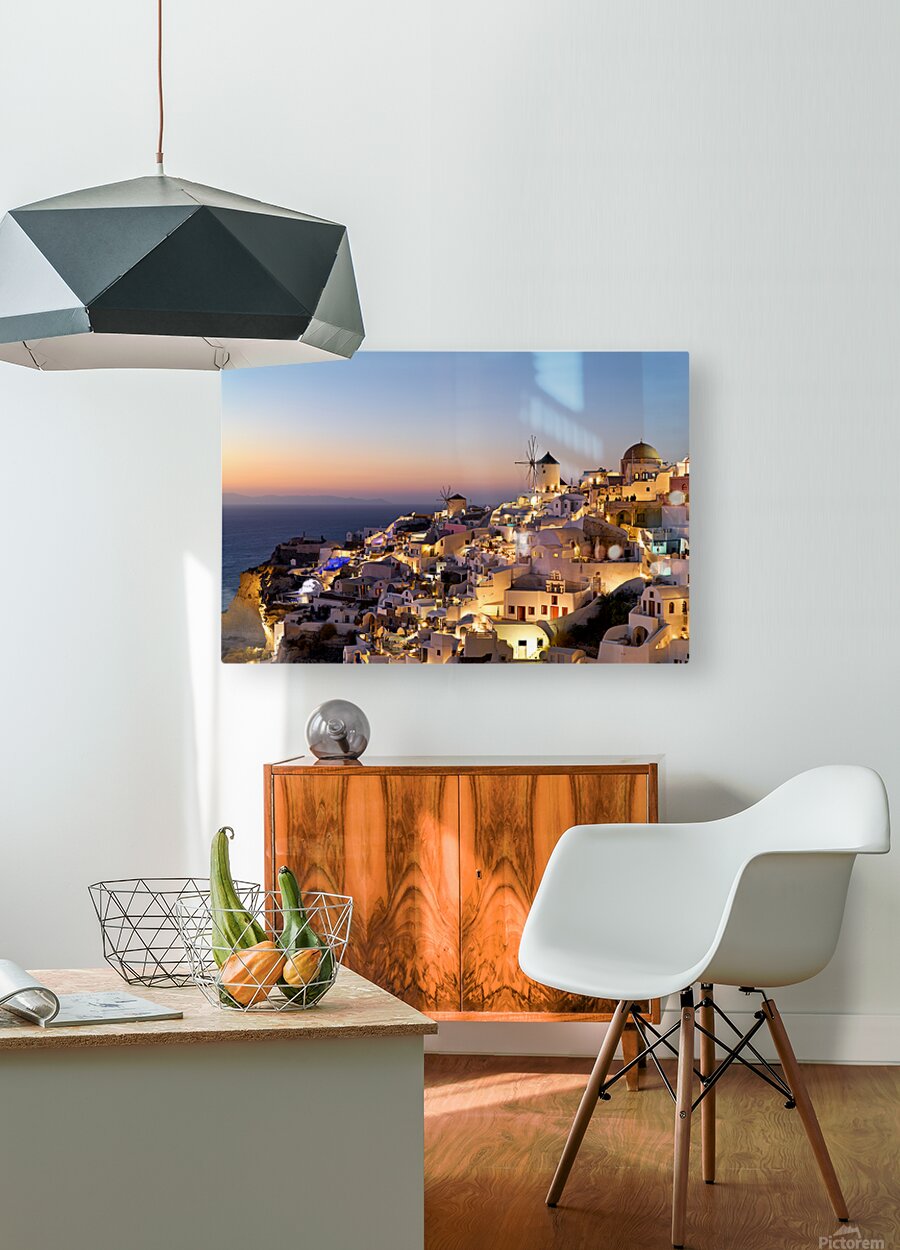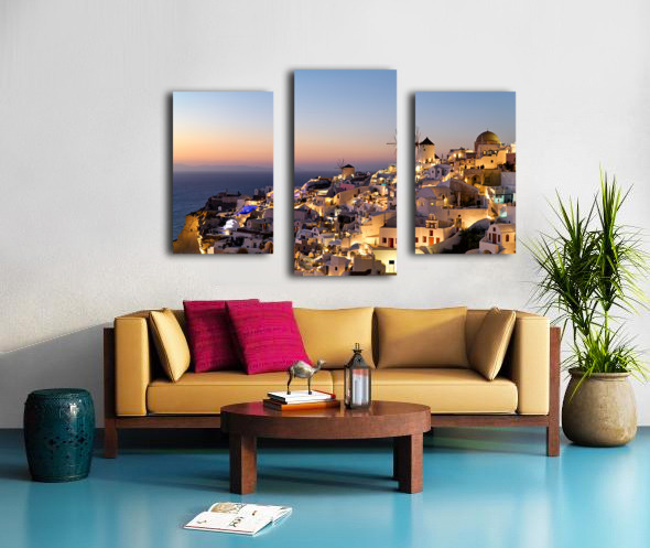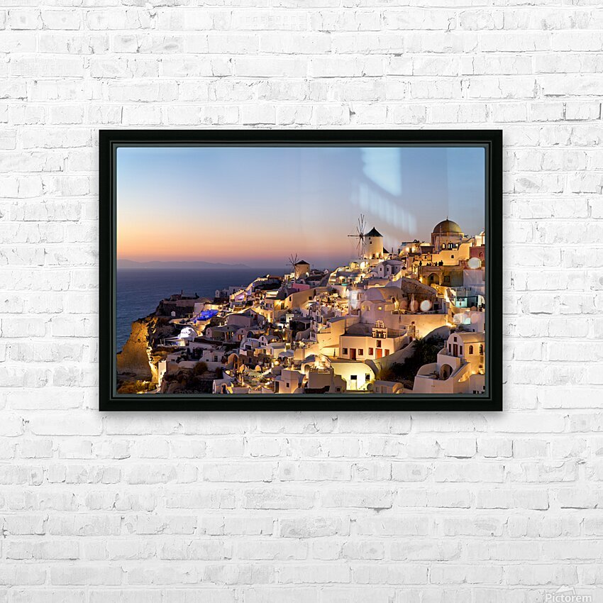 Santorinis Oia village glows at twilight by the sea. Frame print