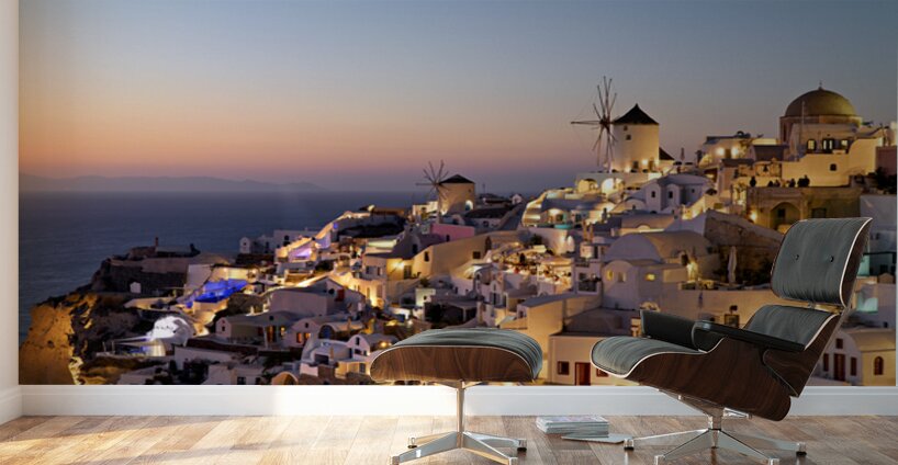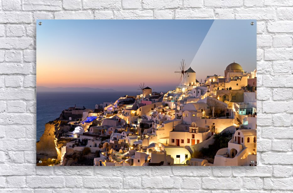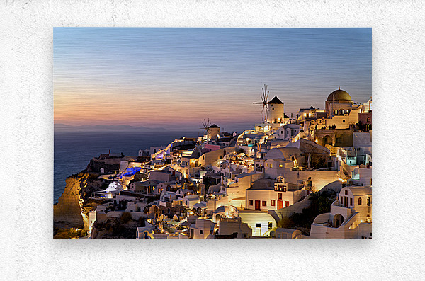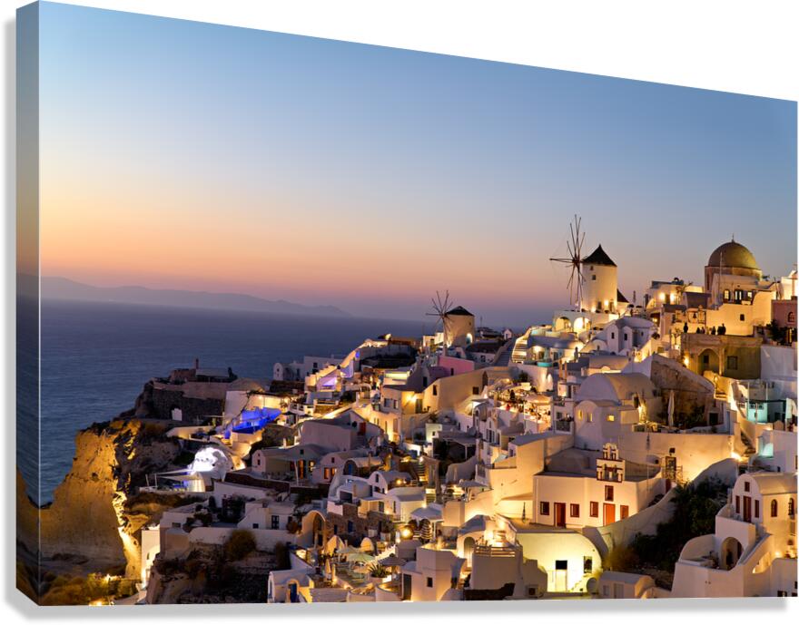 ABOUT THIS ARTWORK: SANTORINIS OIA VILLAGE GLOWS AT TWILIGHT BY THE SEA.
