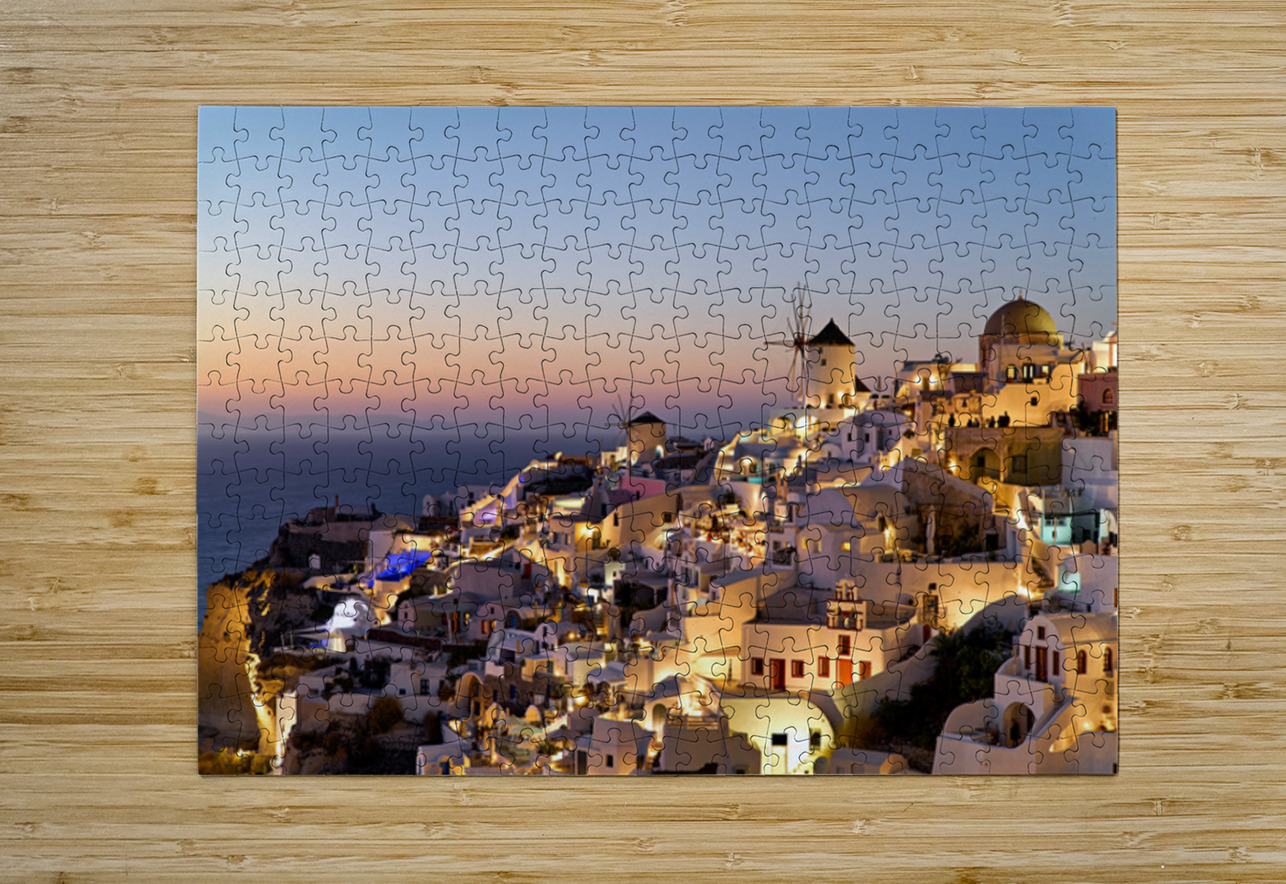 Santorinis Oia village glows at twilight by the sea. Marco Brivio Puzzle printing