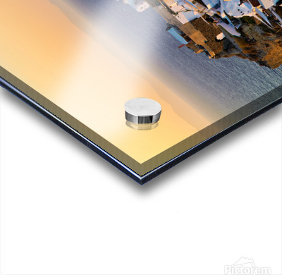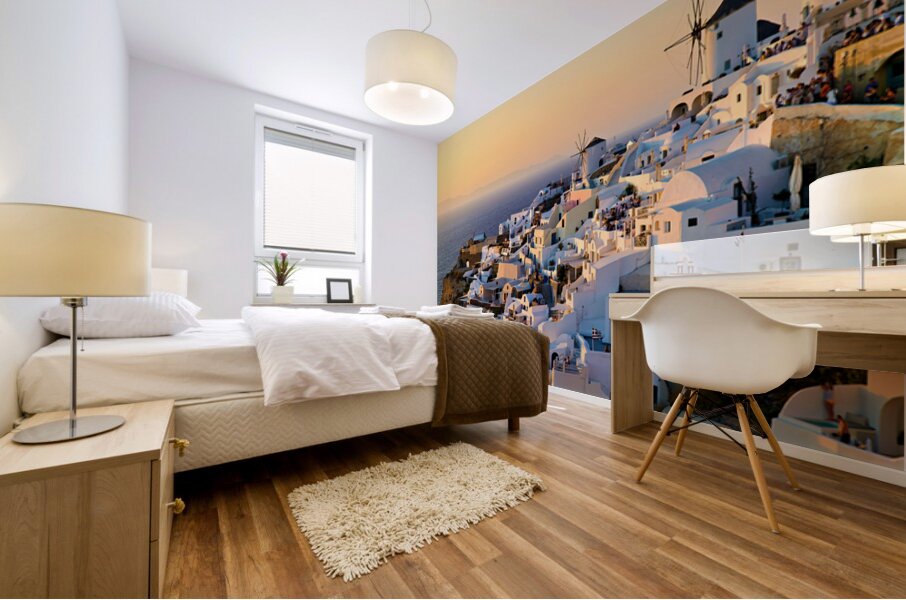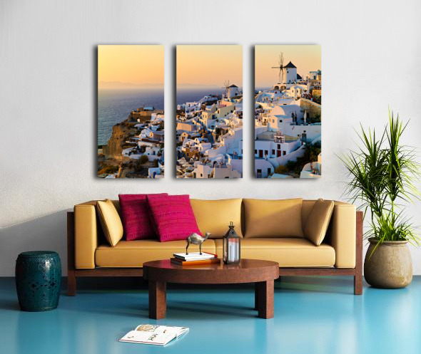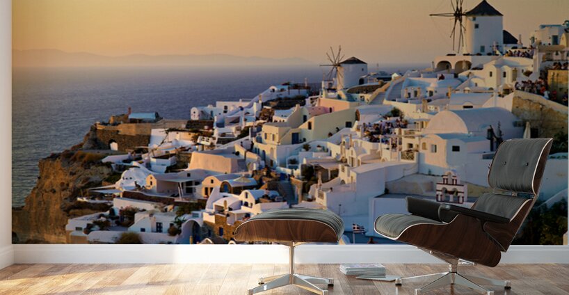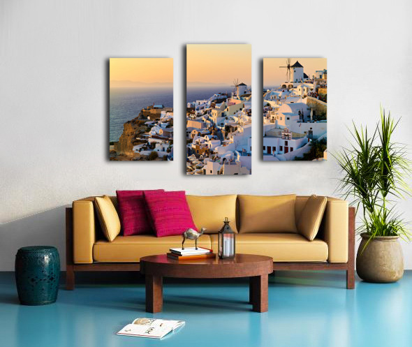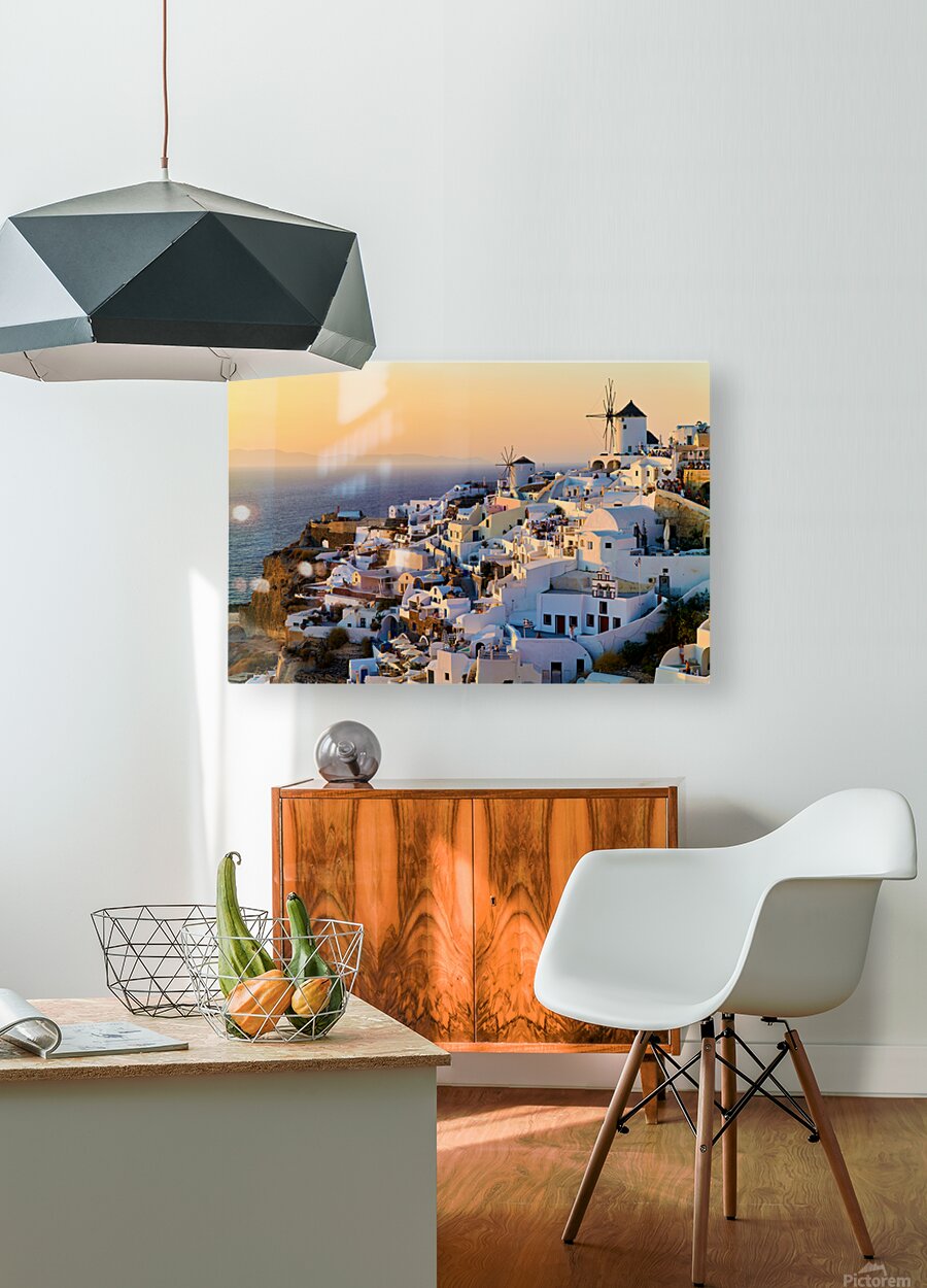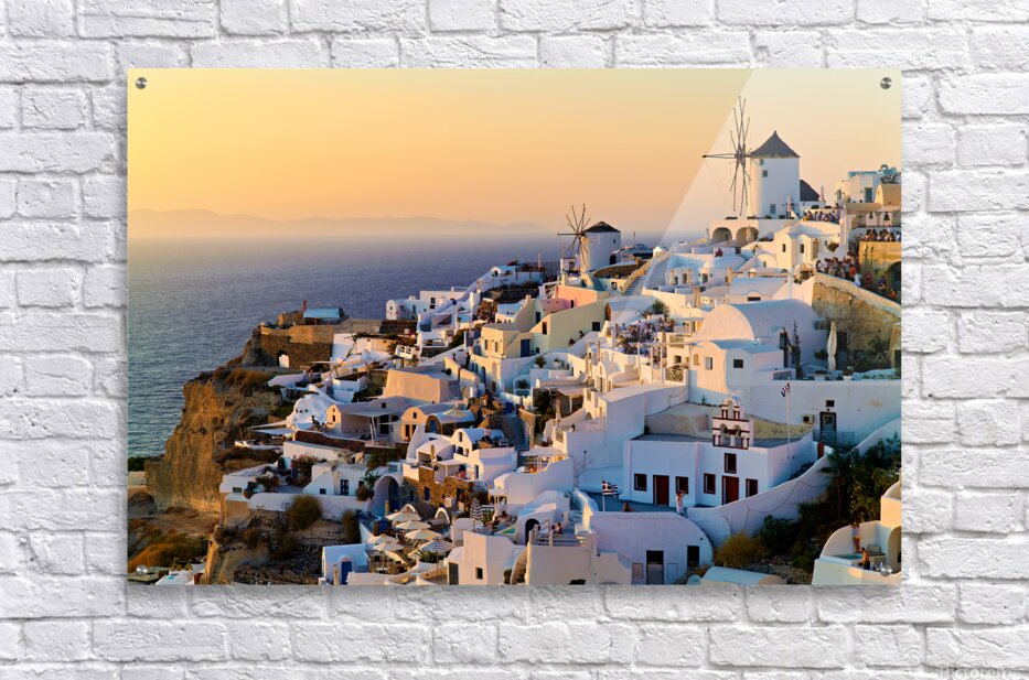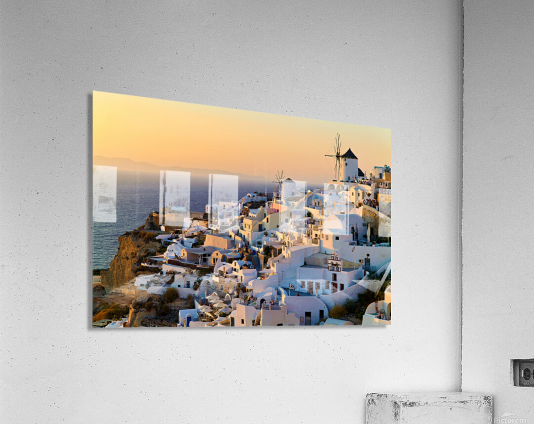 Get this artwork "Santorini village at sunset with windmills overlooking the Aegea" in a framed print.