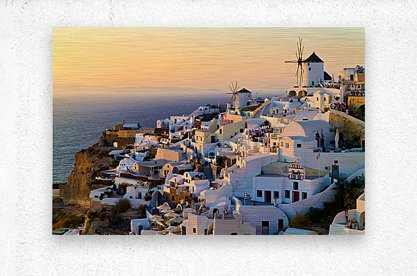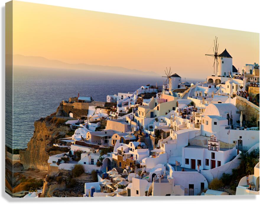 ABOUT THIS ARTWORK: SANTORINI VILLAGE AT SUNSET WITH WINDMILLS OVERLOOKING THE AEGEA