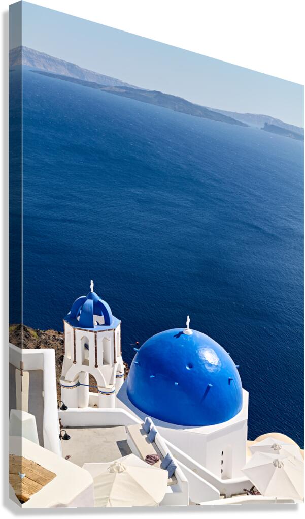 Get this artwork "Santorinis blue domes and caldera view." in a framed print.