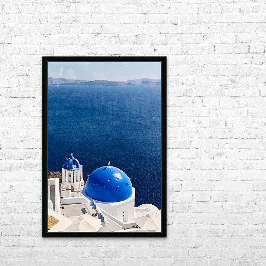 Santorinis blue domes and caldera view. Frame print