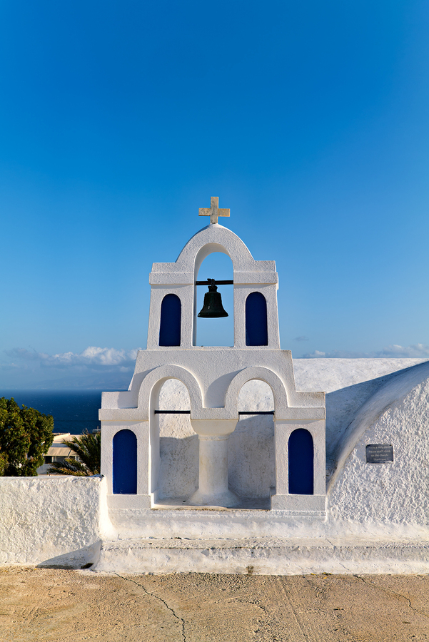 Iconic white and blue Greek Orthodox church bell tower with a cross overlooking the sea. A holy site on a sunny Greek island.