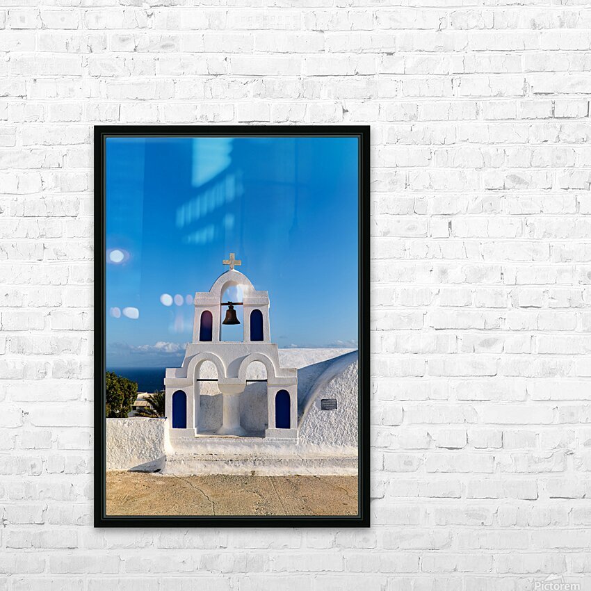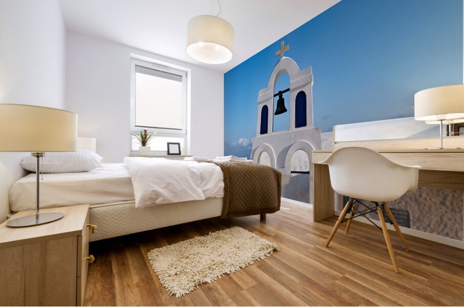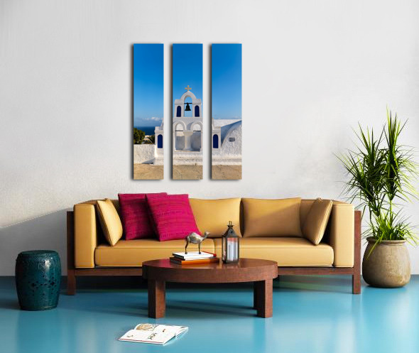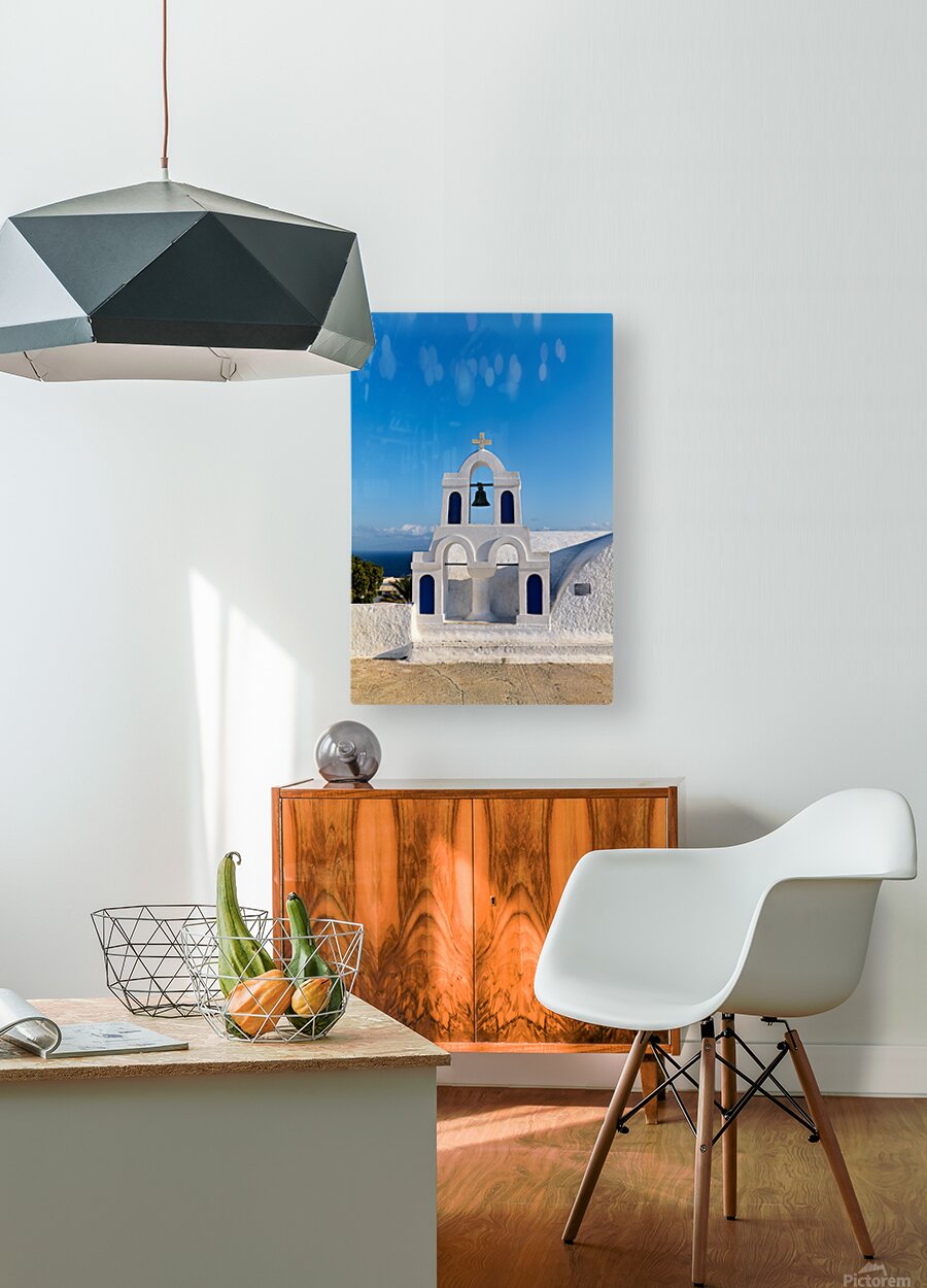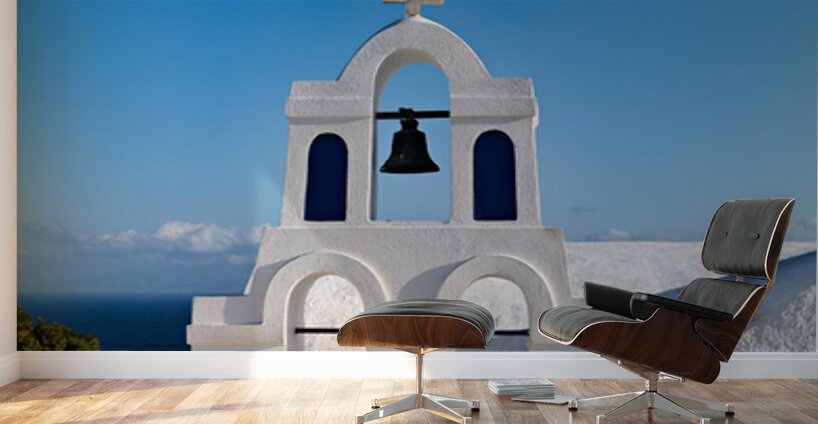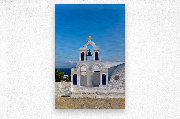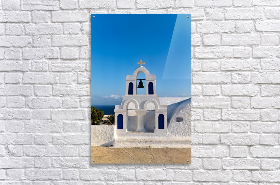 Get this artwork "White bell tower against blue sky and sea." in a framed print.