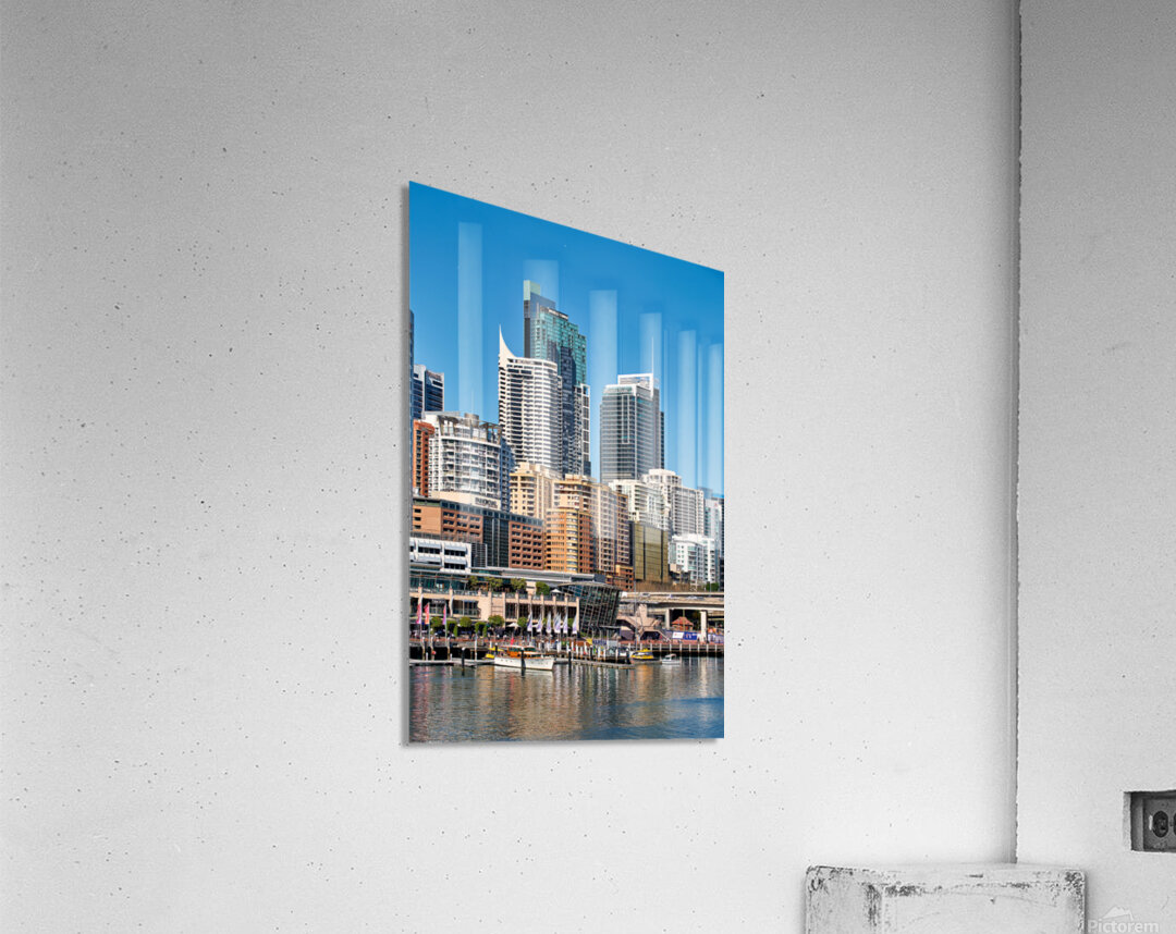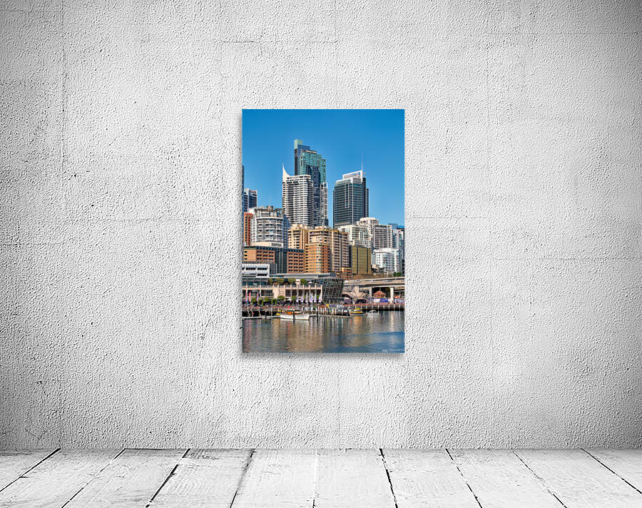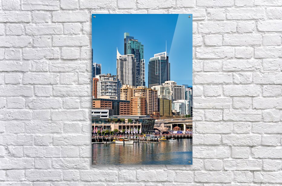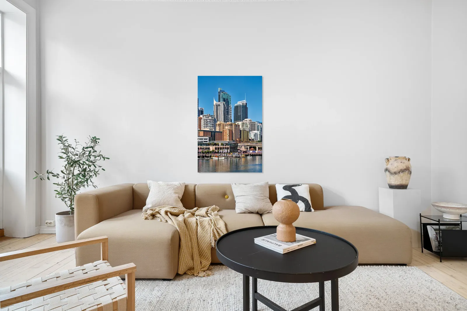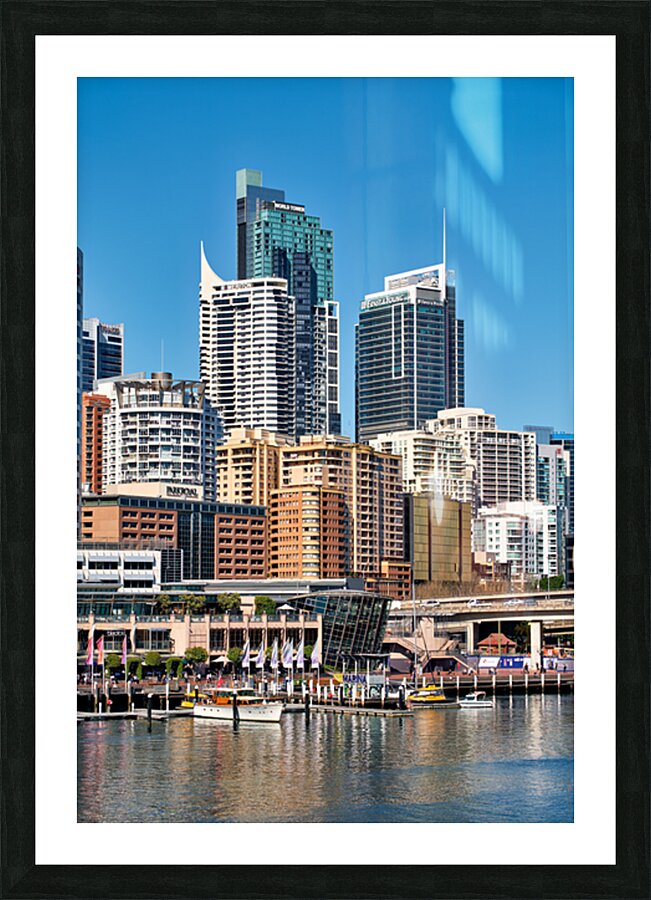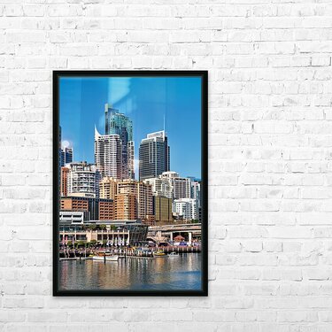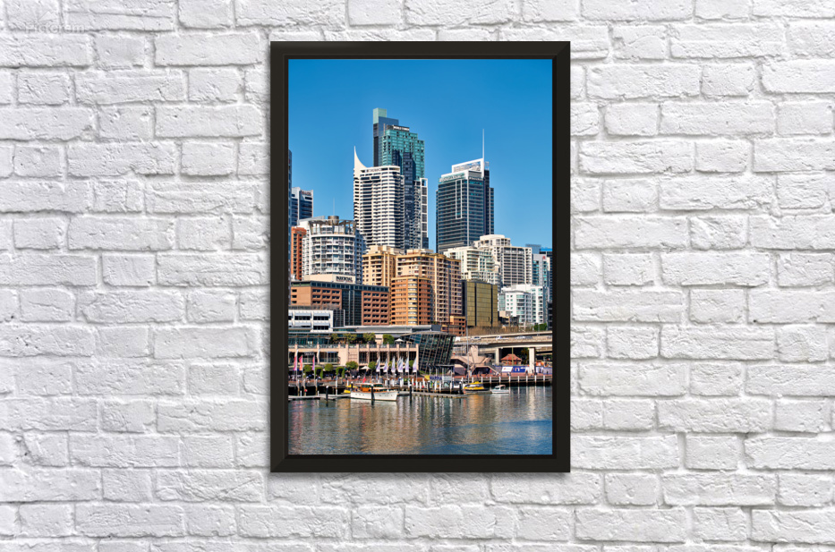 "Sydney skyline with Darling Harbour and boats." in a framed print.