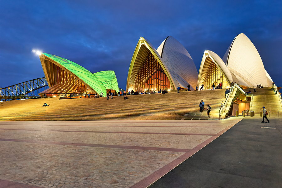 Sydney Opera House Australia. People gather on the steps of the iconic landmark at dusk enjoying the evening atmosphere.