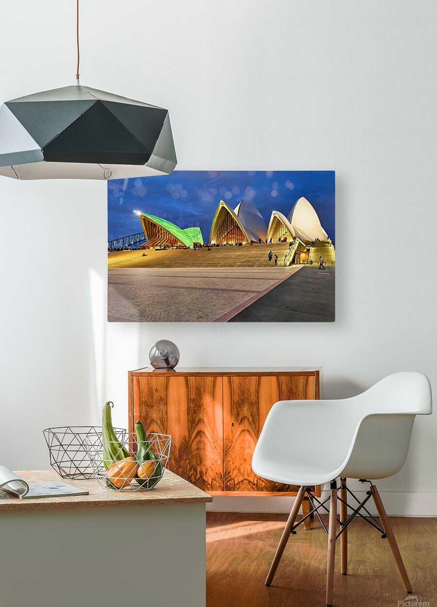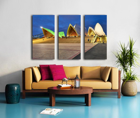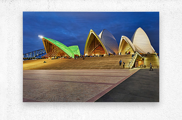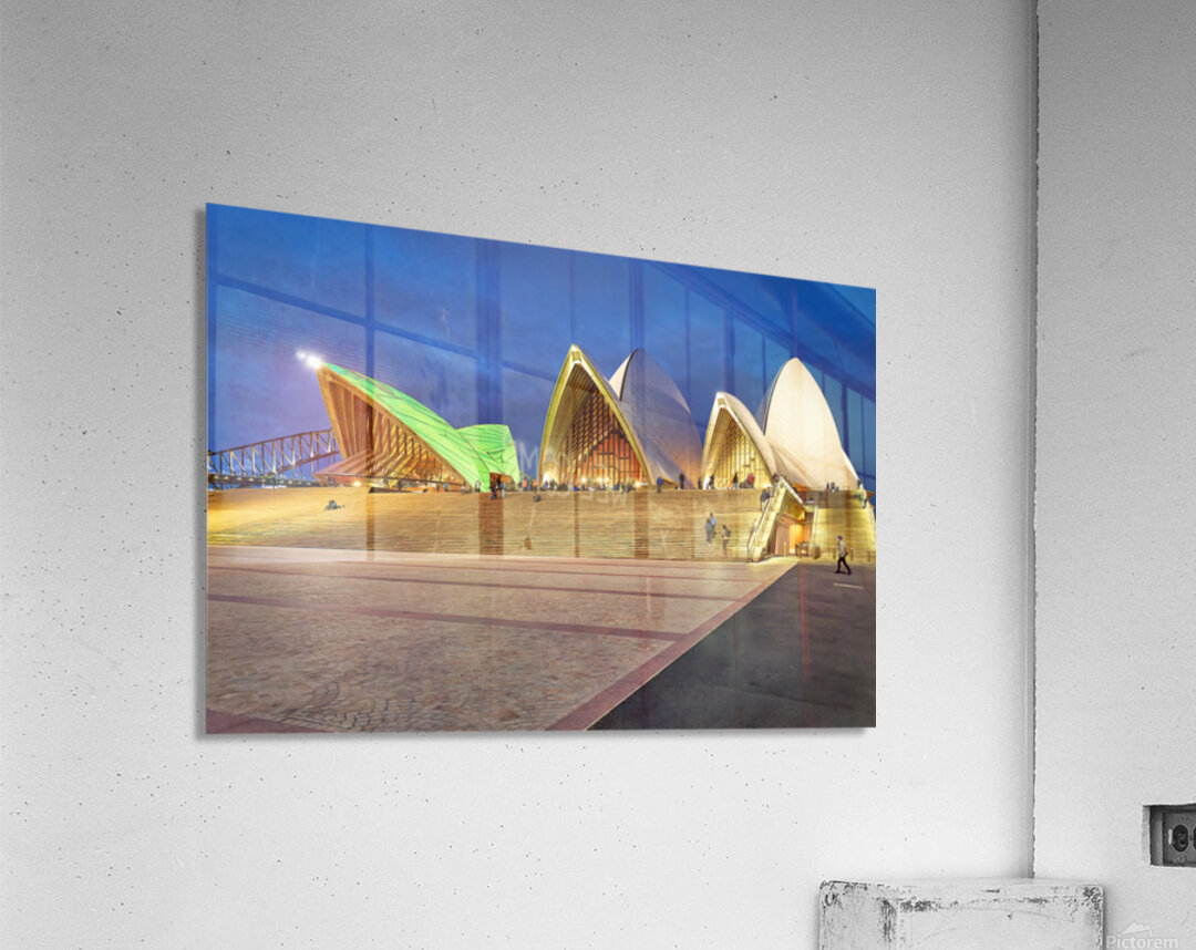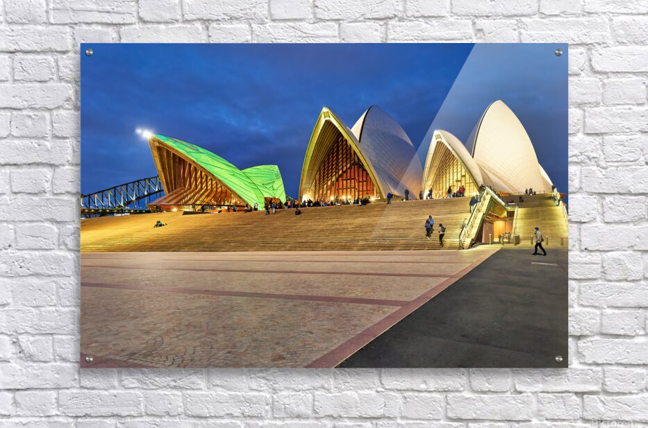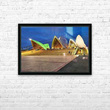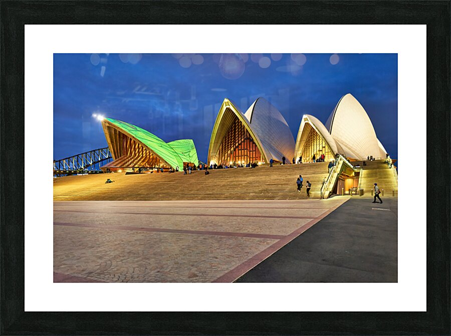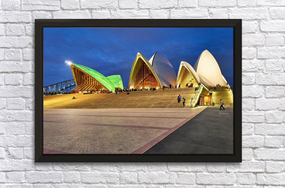 "Sydney Opera House illuminated at dusk with people on steps." in a framed print.