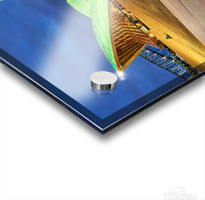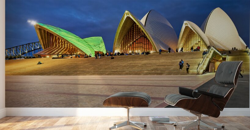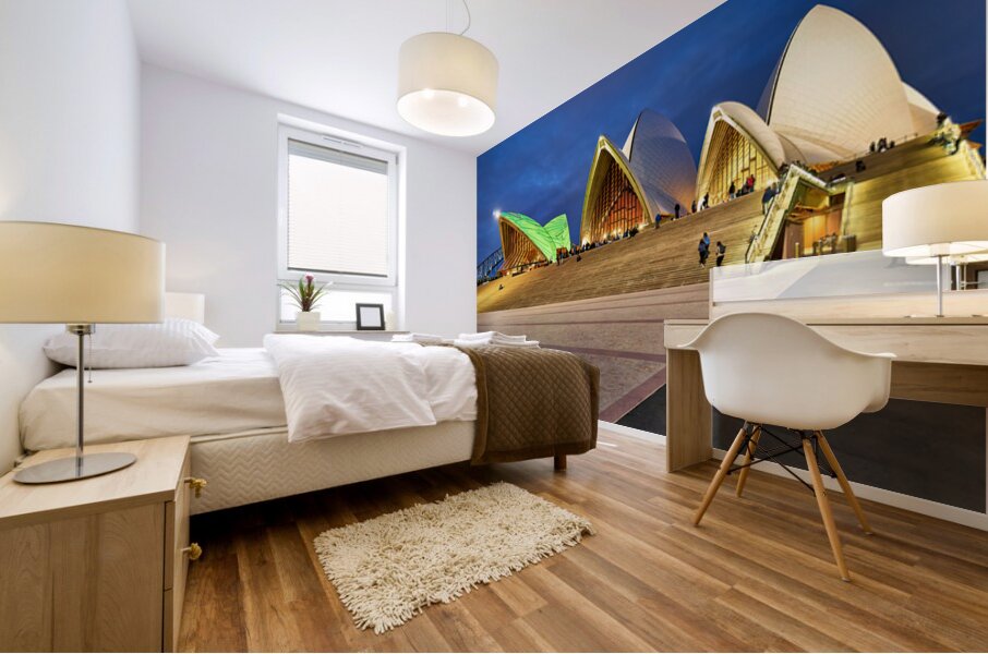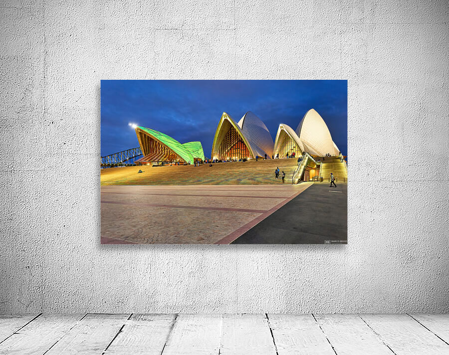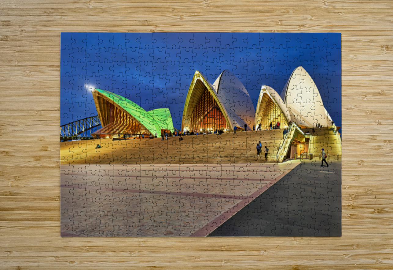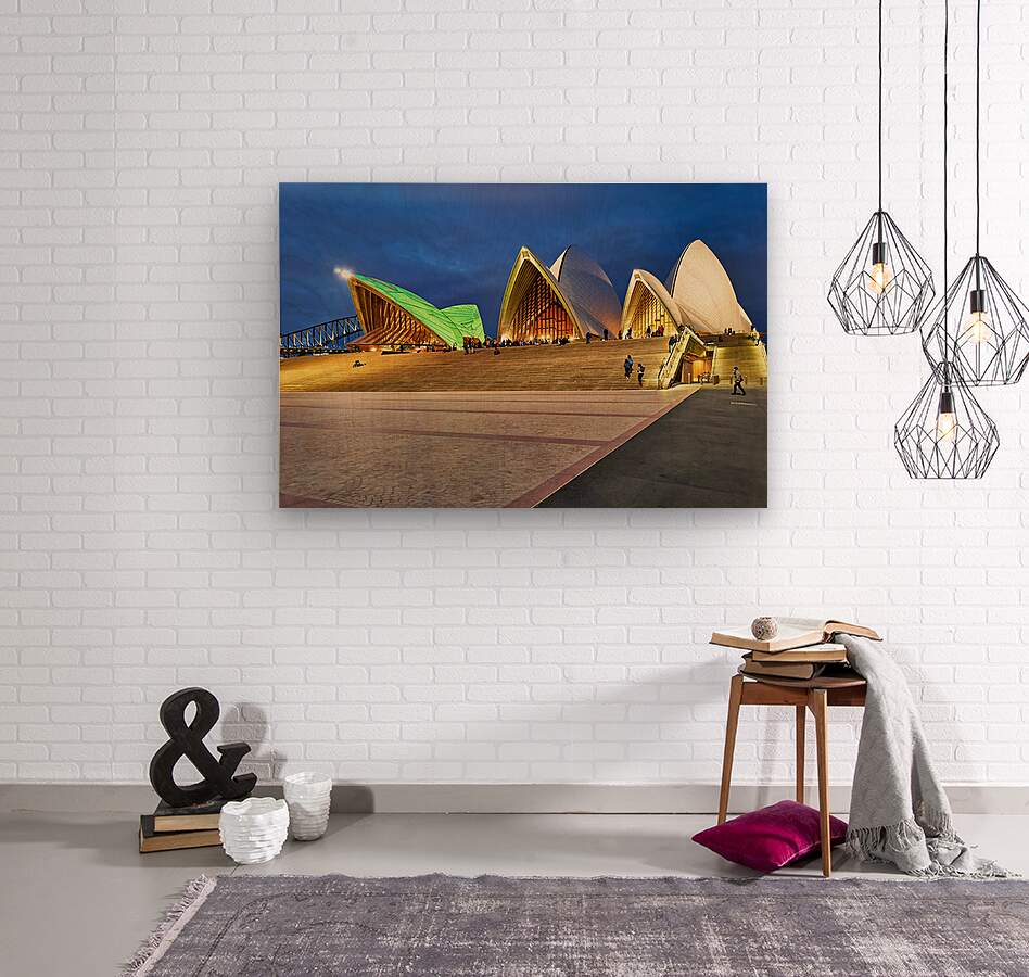 "Sydney Opera House illuminated at dusk with people on steps." in a framed print.
