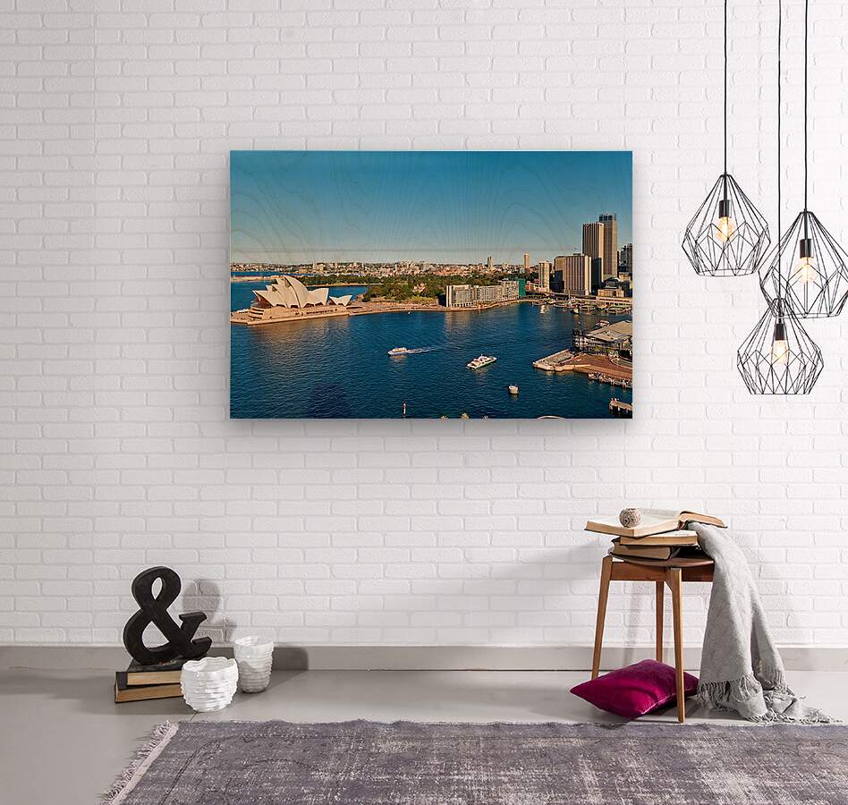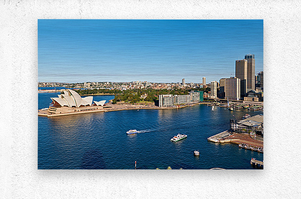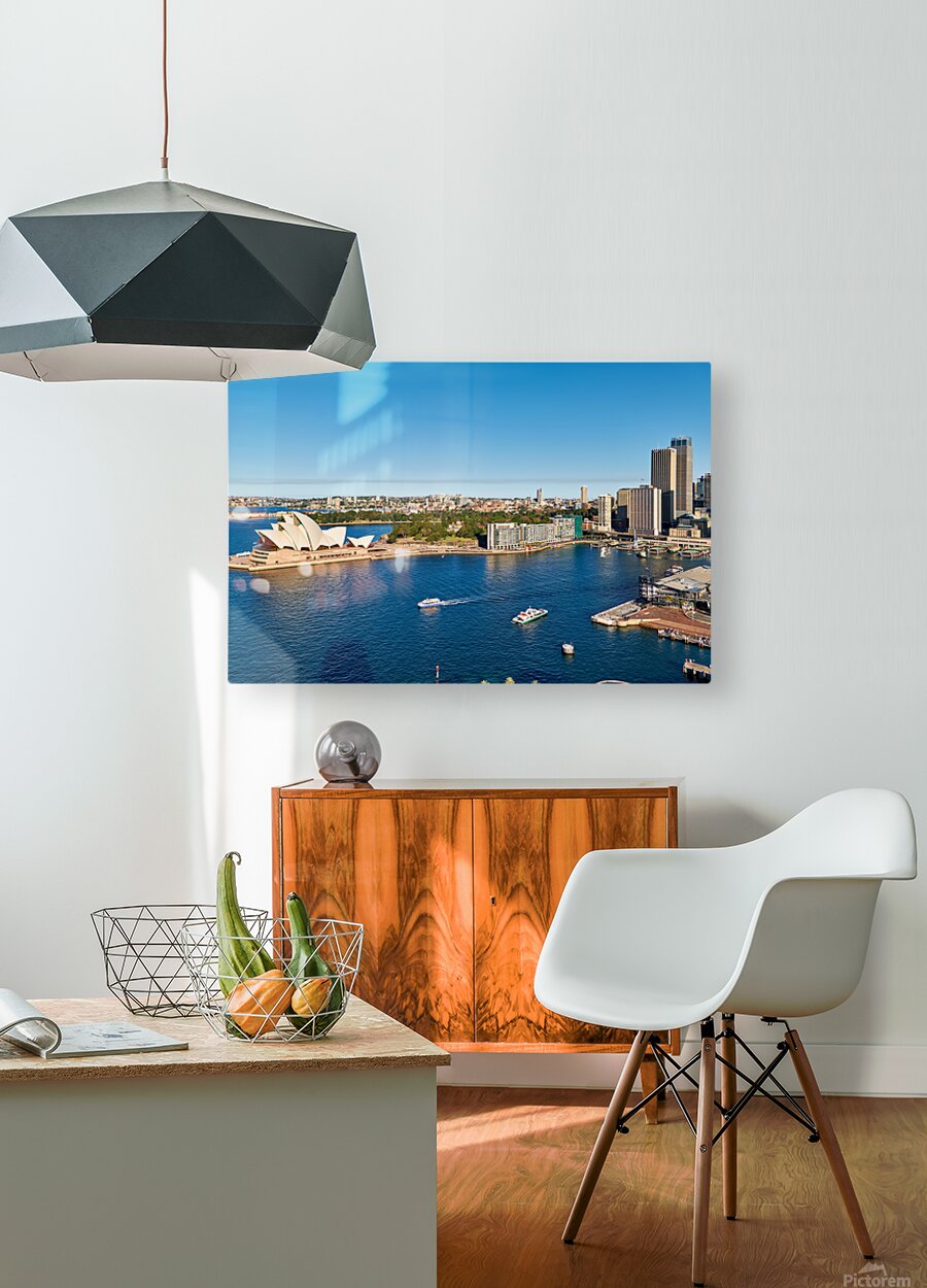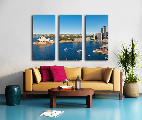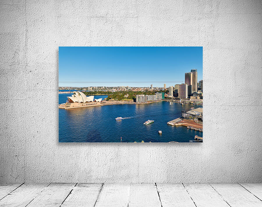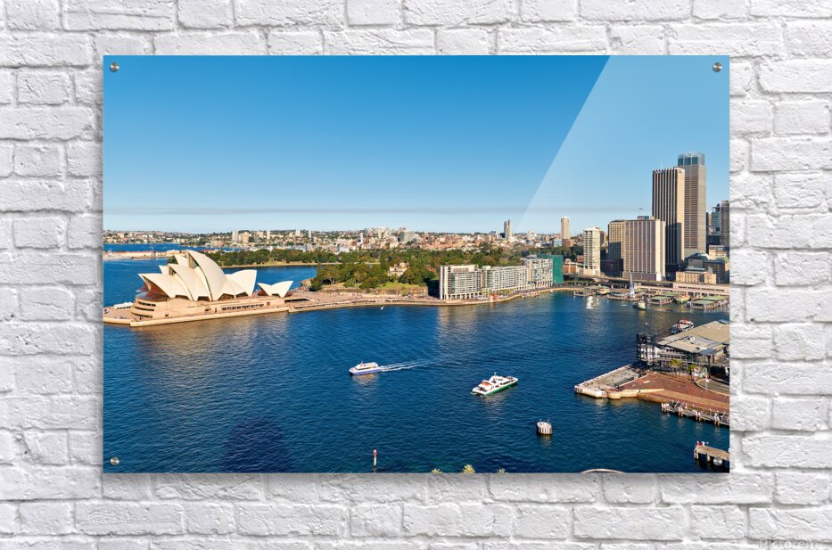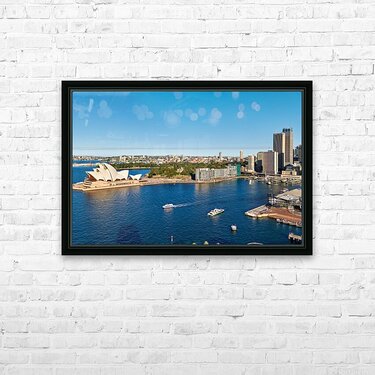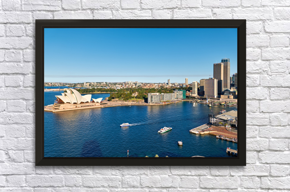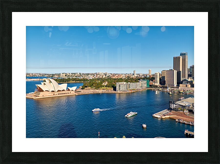 "Sydney Opera House and harbor with ferries on a sunny day." in a framed print.